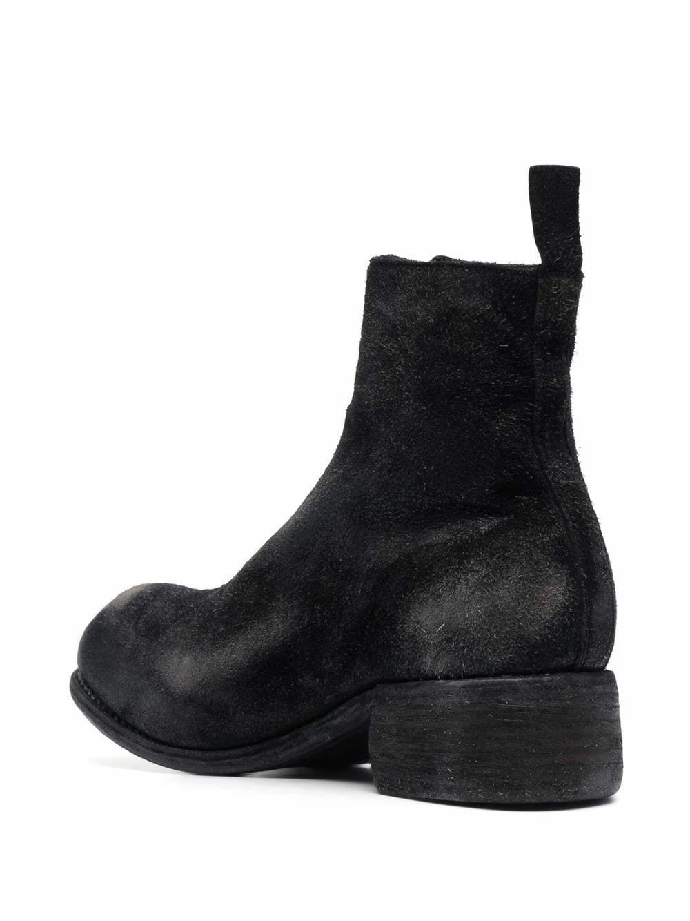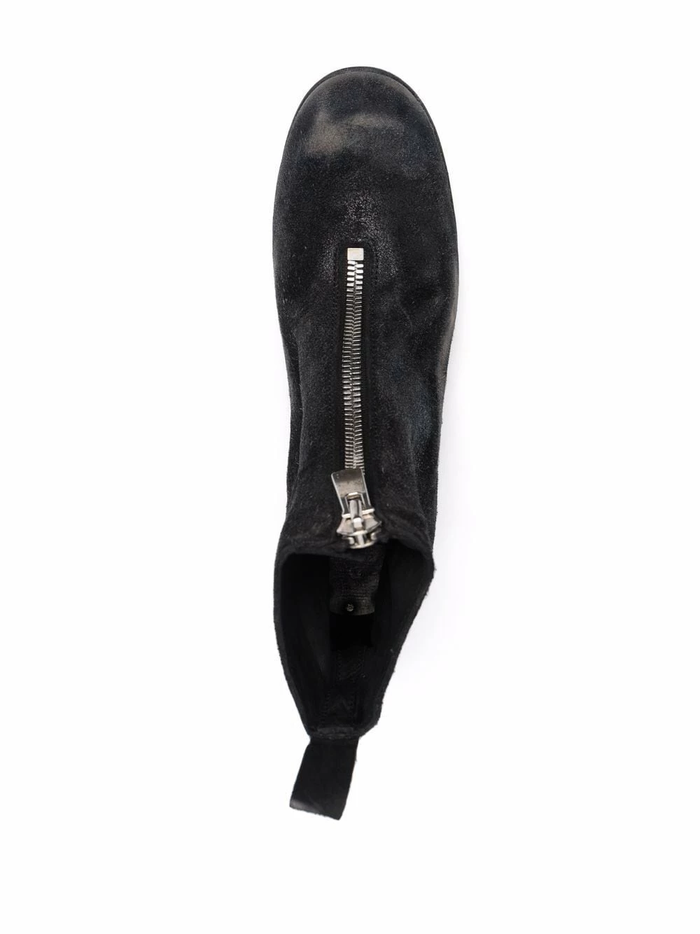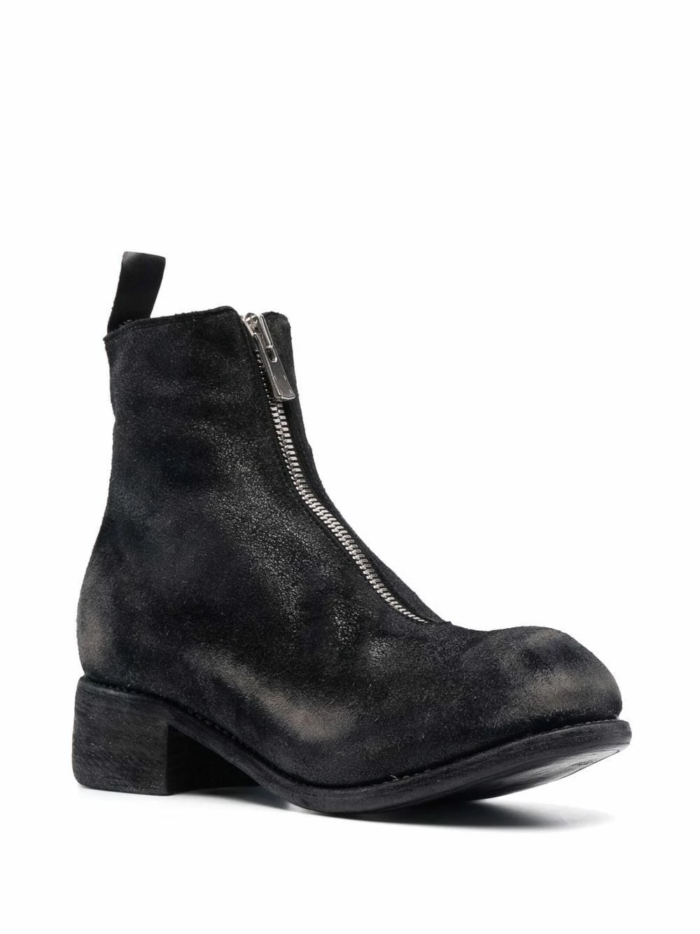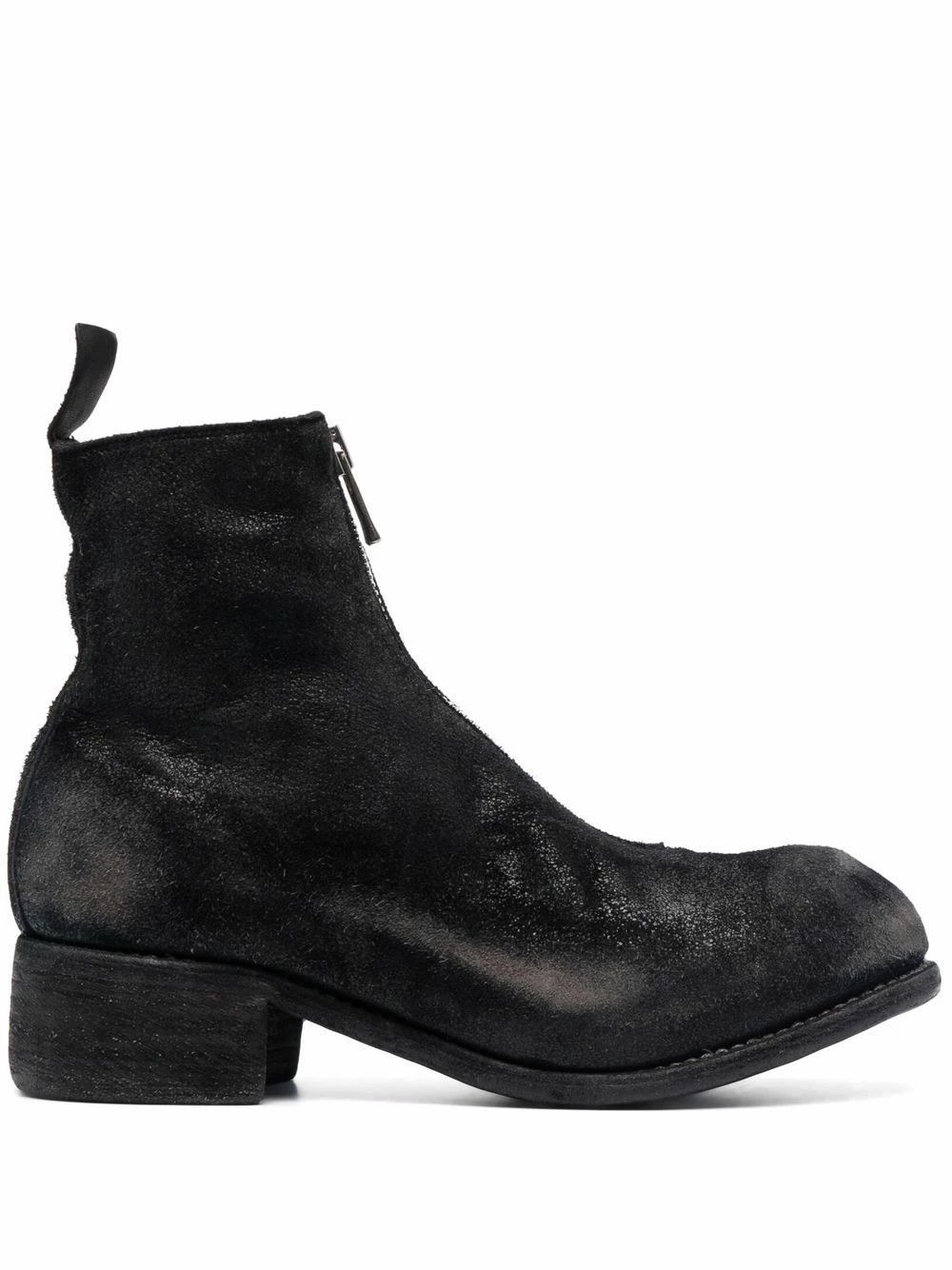 Effet usé, bout rond, fermeture zippée devant, hauteur cheville, languette d’enfilage au talon, semelle plate en caoutchouc, petit talon épais. Couleur : noir.