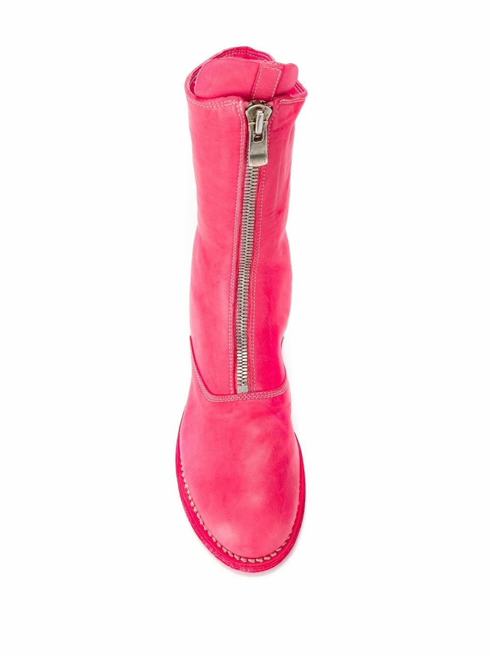 Bout rond, fermeture zippée devant, semelle plate en cuir. Matière : cuir.