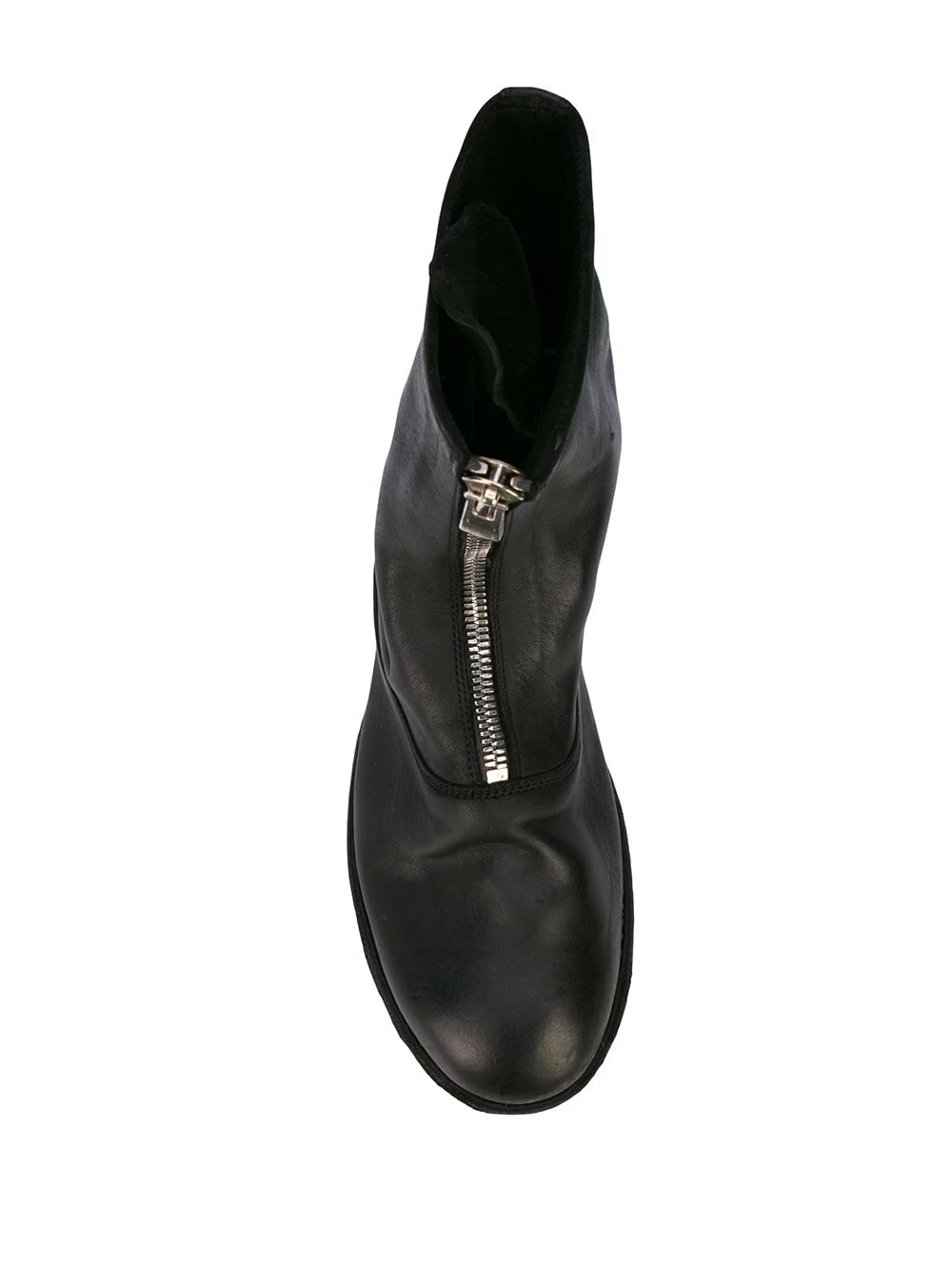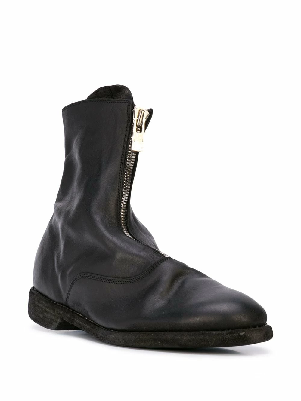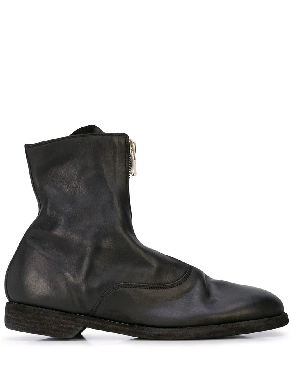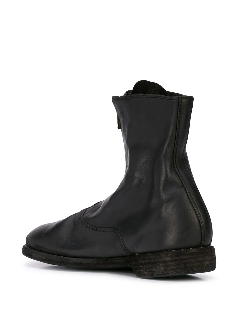 Bottines zippées en cuir de cheval Guidi avec bout en amande, languette oversize, semelle plate et petit talon épais. Couleur : noir.