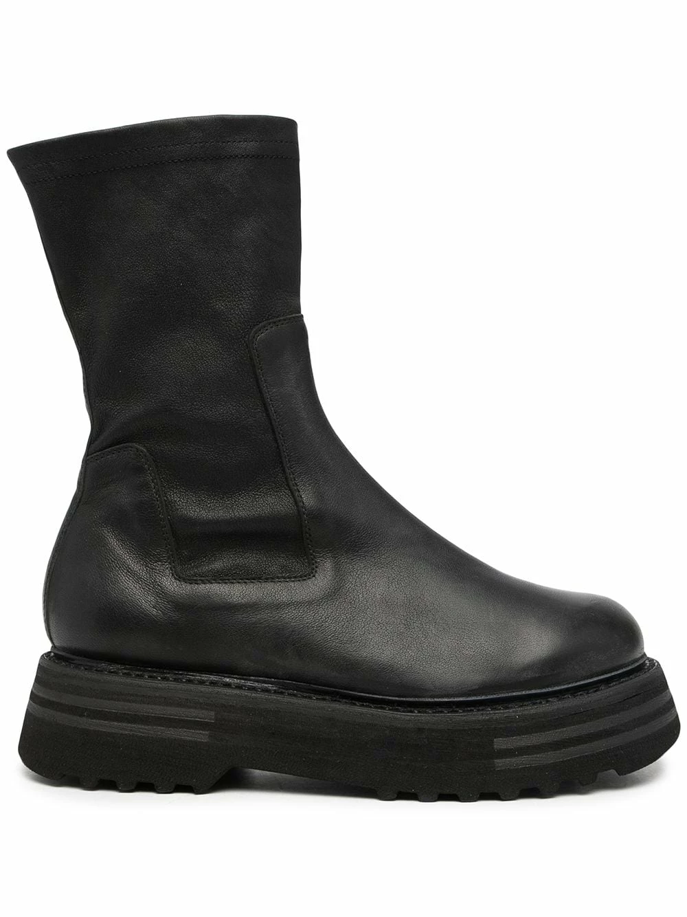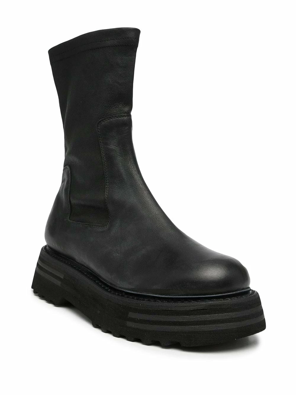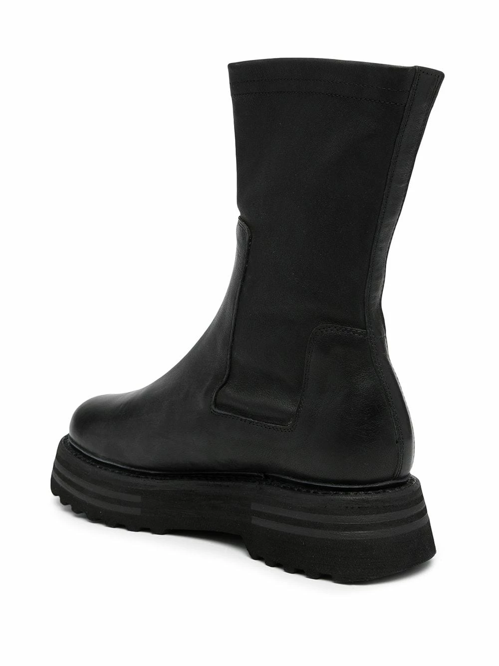 Bout rond, longueur mollet, design à enfiler, semelle épaisse en caoutchouc. Couleur : noir. Matière : cuir.