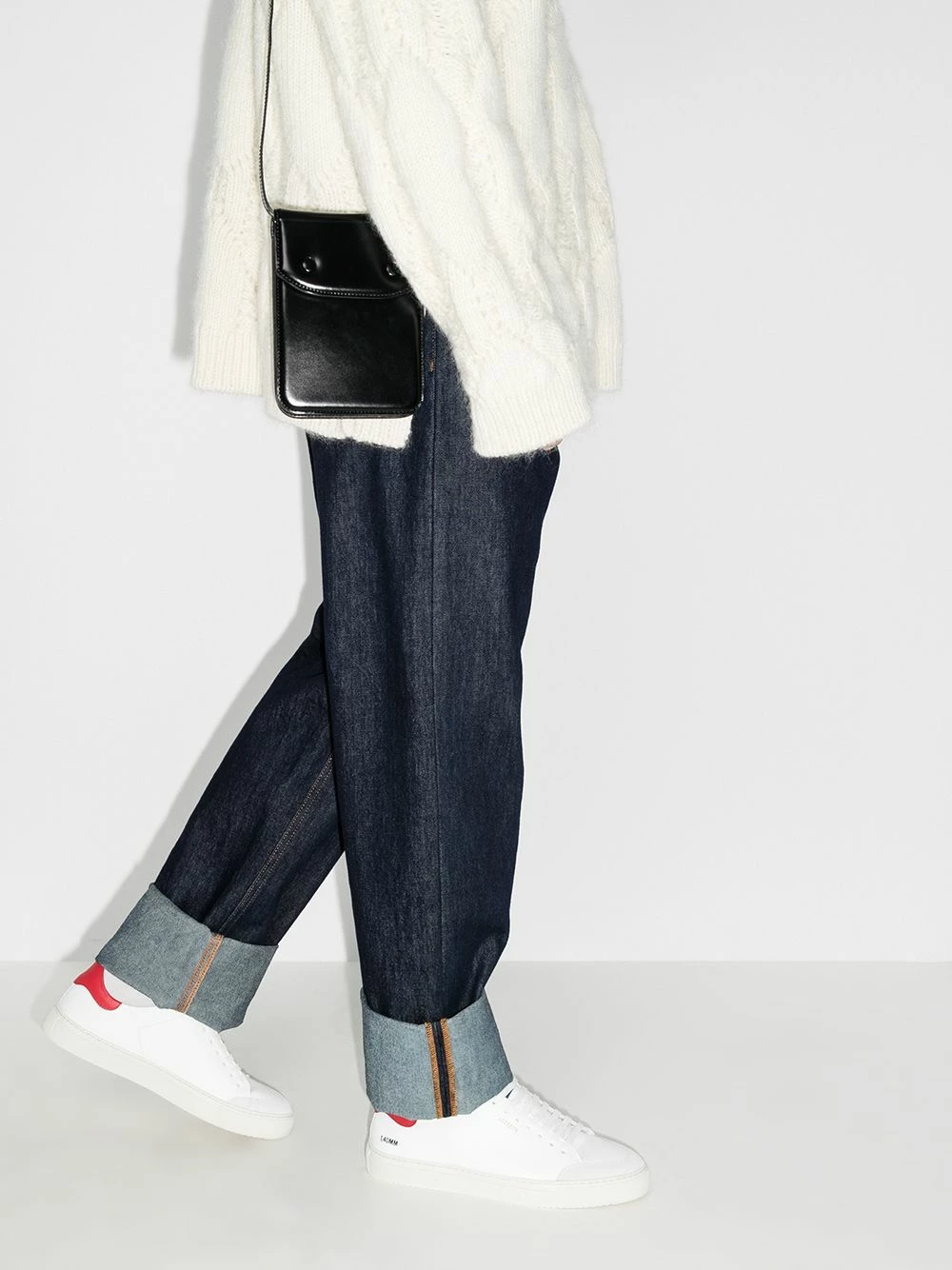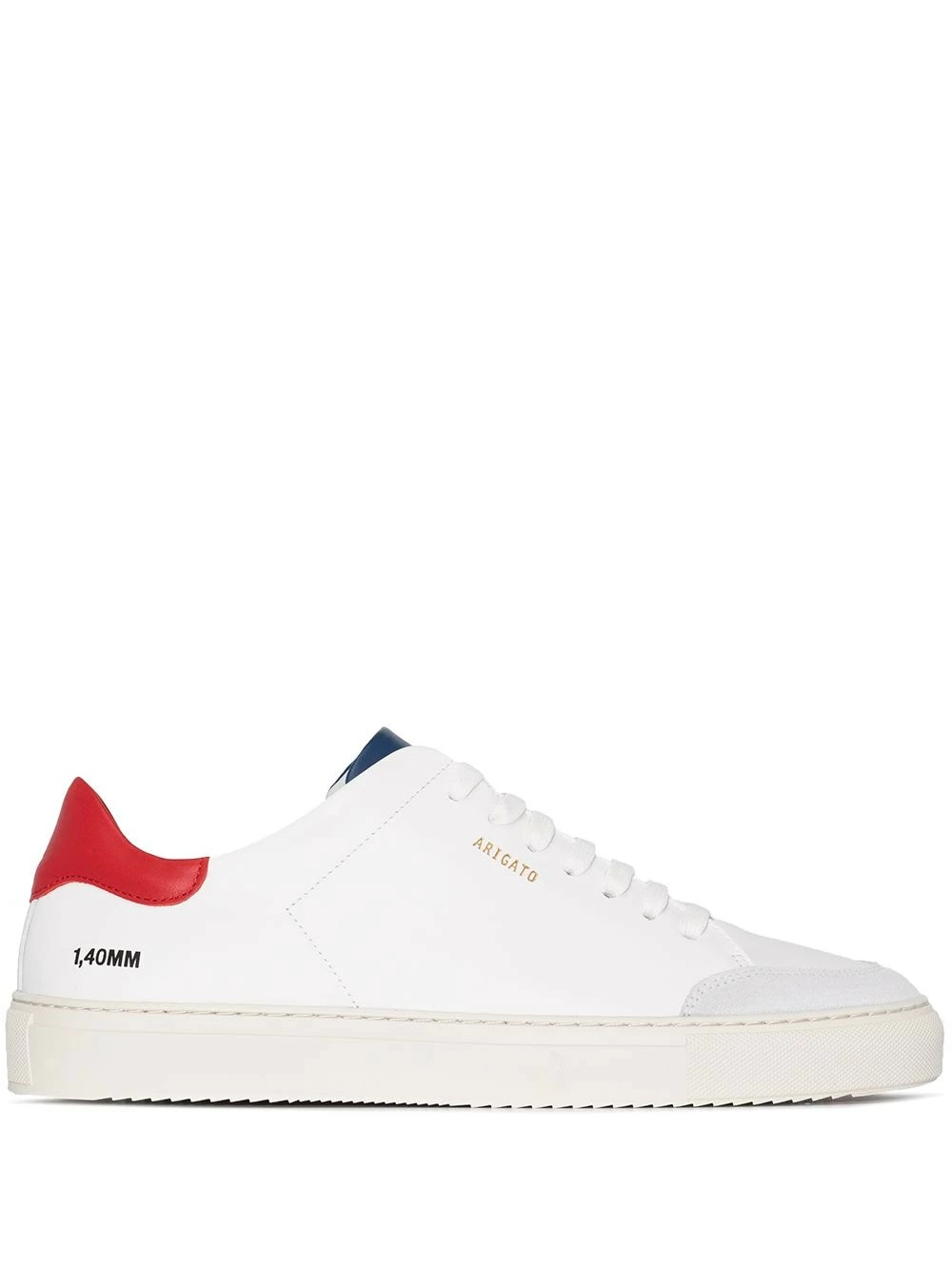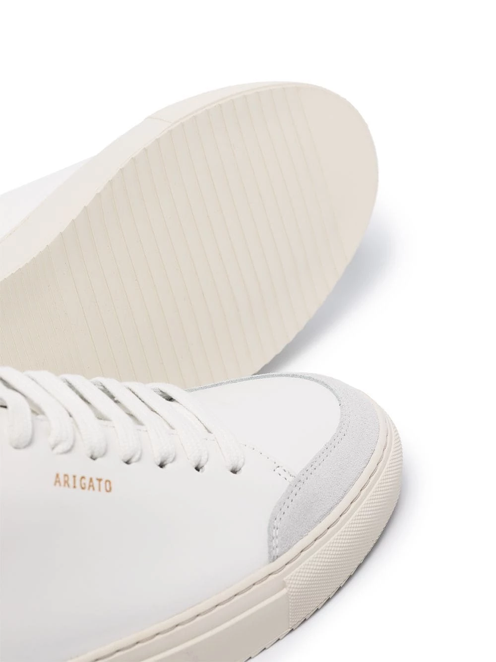 Baskets Clean 90 en cuir Axel Arigato avec bout rond, empiècements à coutures visibles, fermeture à lacer sur le devant, logo imprimé, contrefort contrastant et semelle plate en caoutchouc. Couleur : blanc.