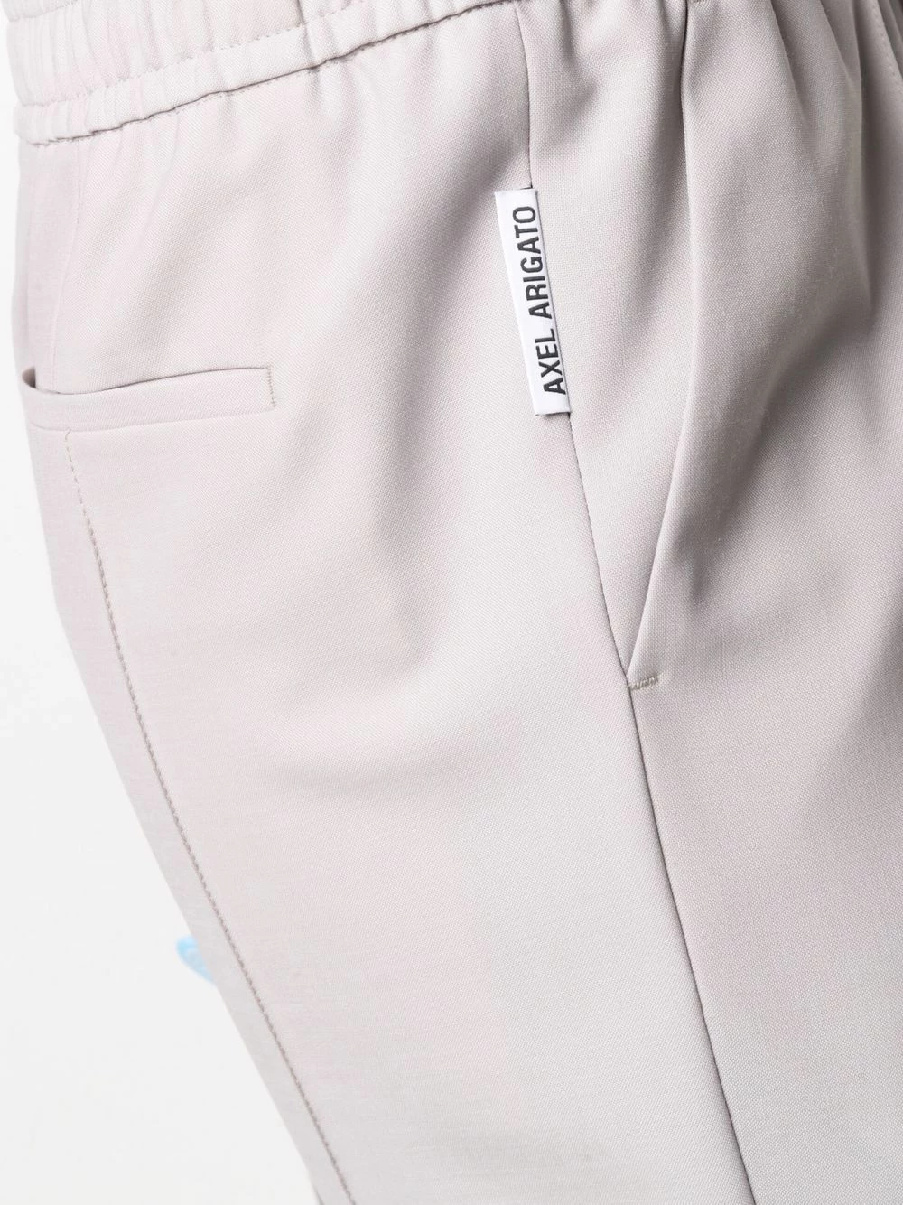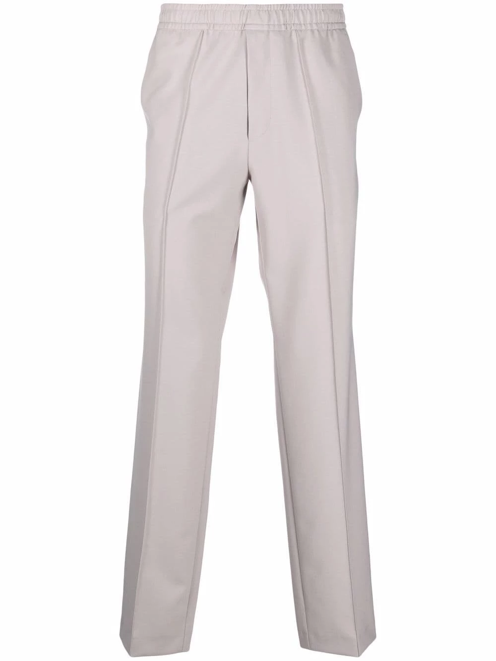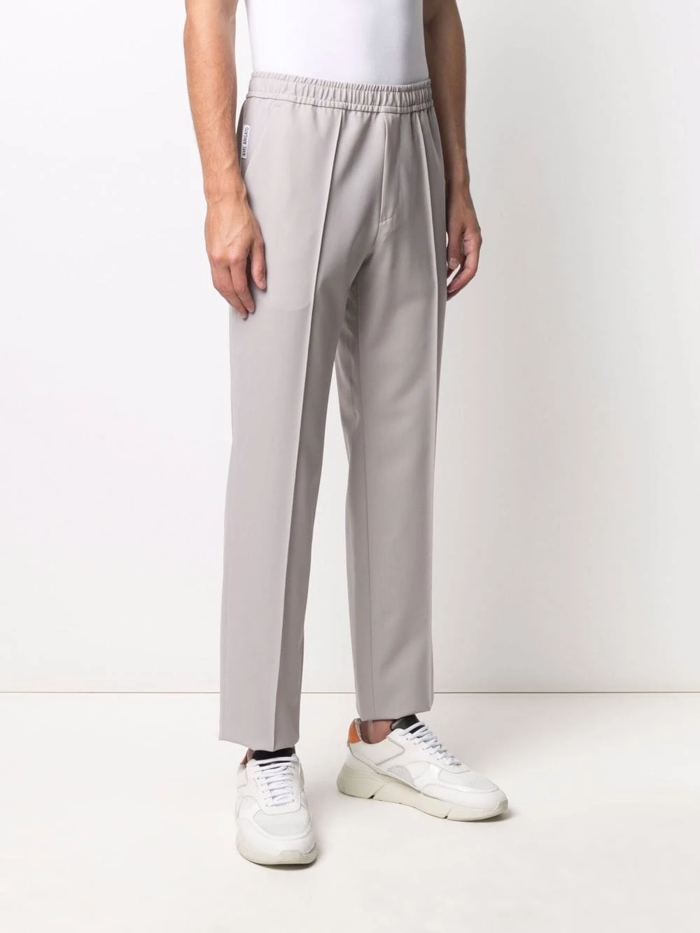 Ceinture élastique, deux poches latérales fendues, poches arriÚre passepoilées, coupe droite. Couleur : gris.