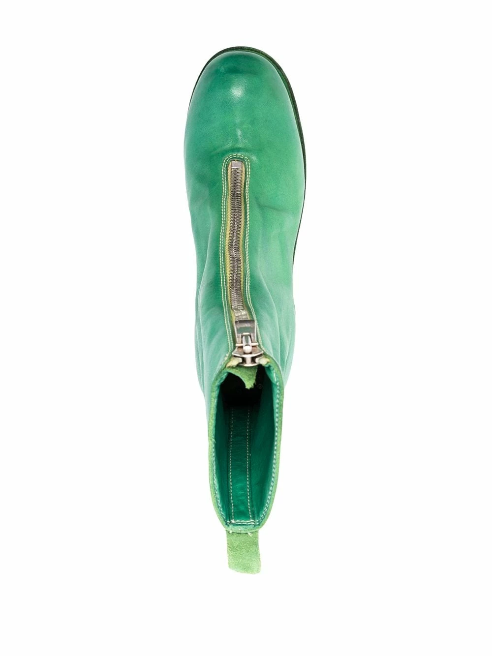 Fermeture zippée devant, bout rond, petit talon épais, languette d’enfilage au talon. Couleur : vert. Matière : cuir.
