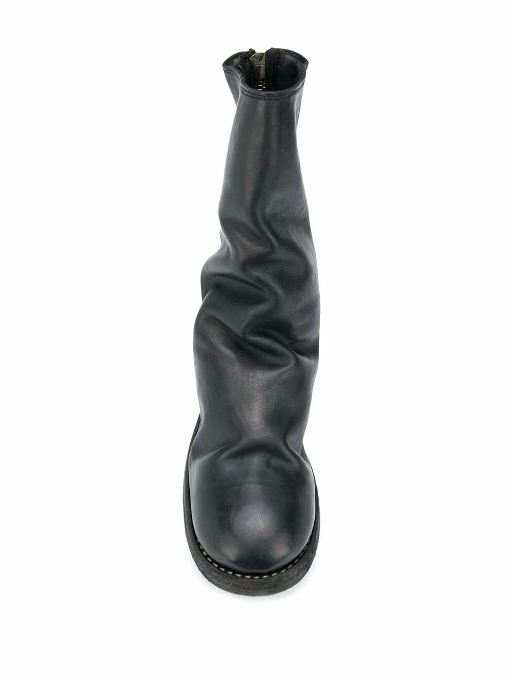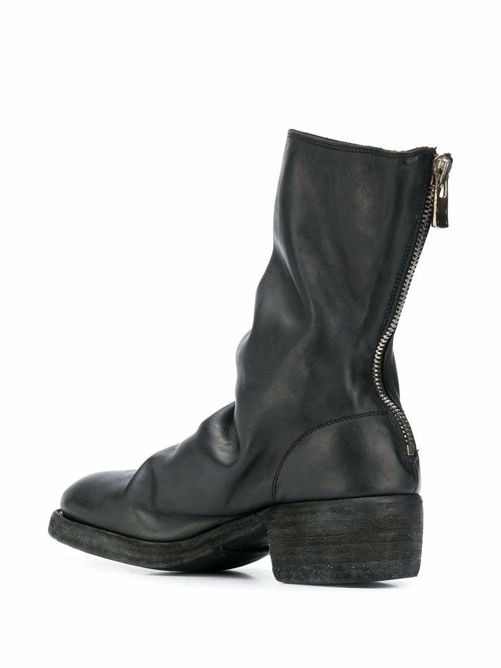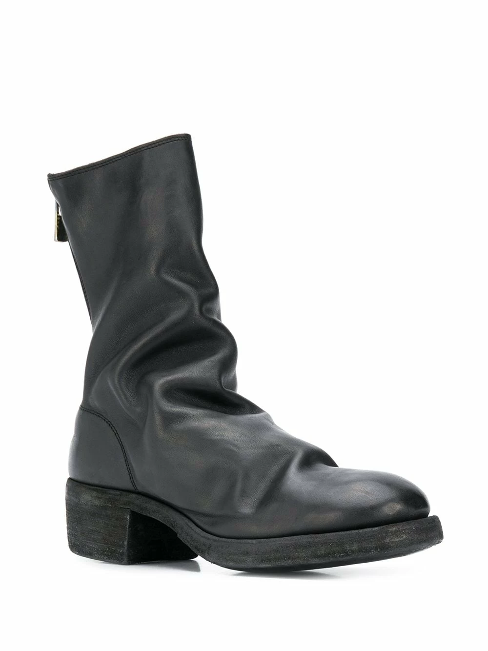 Bout rond, effet froissé, fermeture zippée à l’arrière, coupe mi-longue, semelle en cuir, petit talon bottier. Couleur : noir. Matière : cuir.