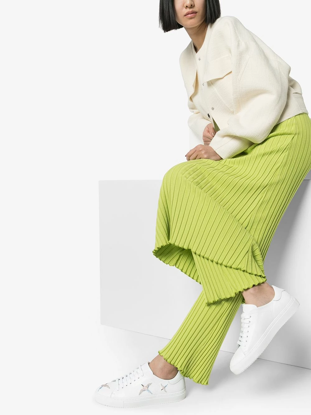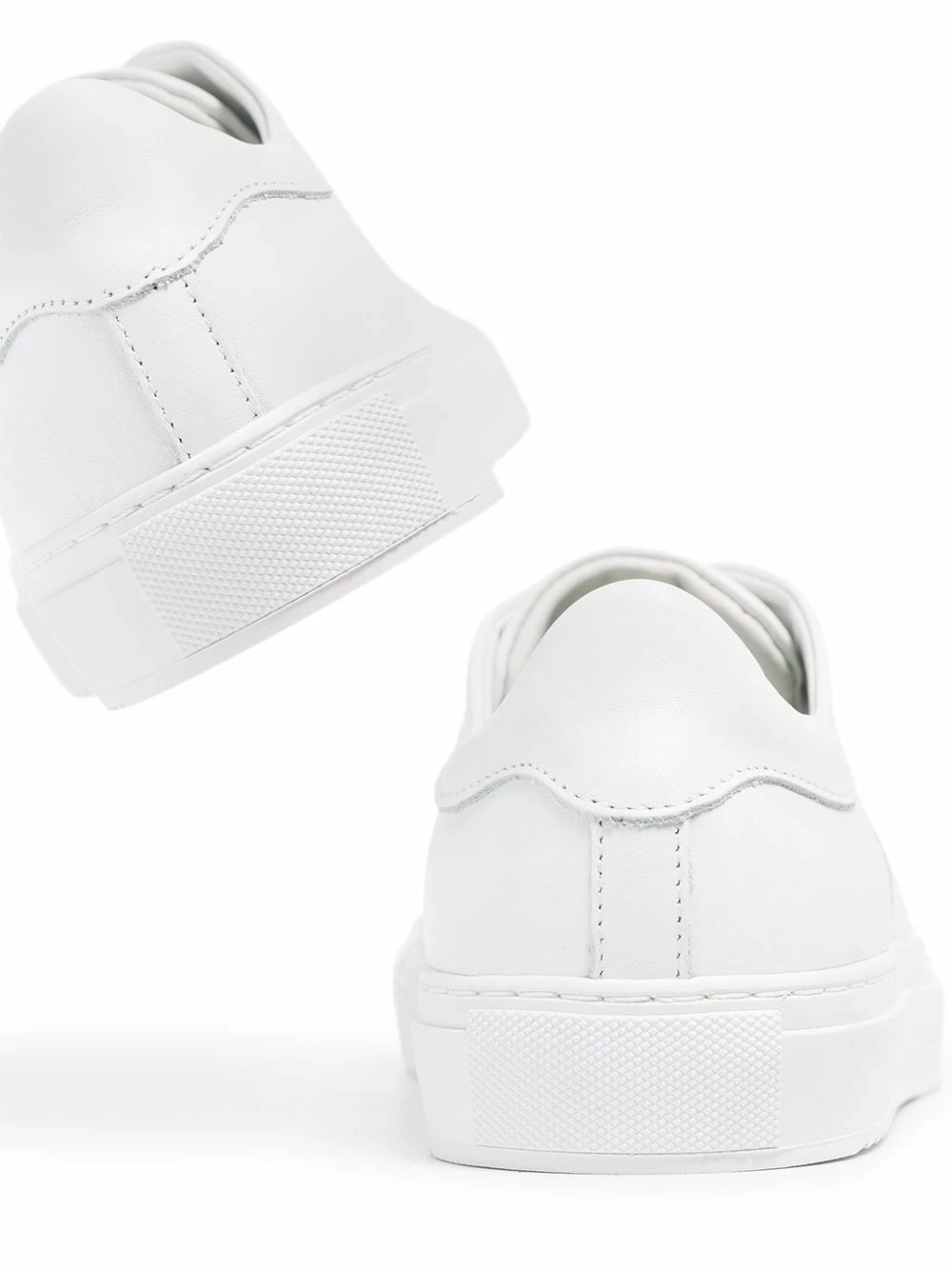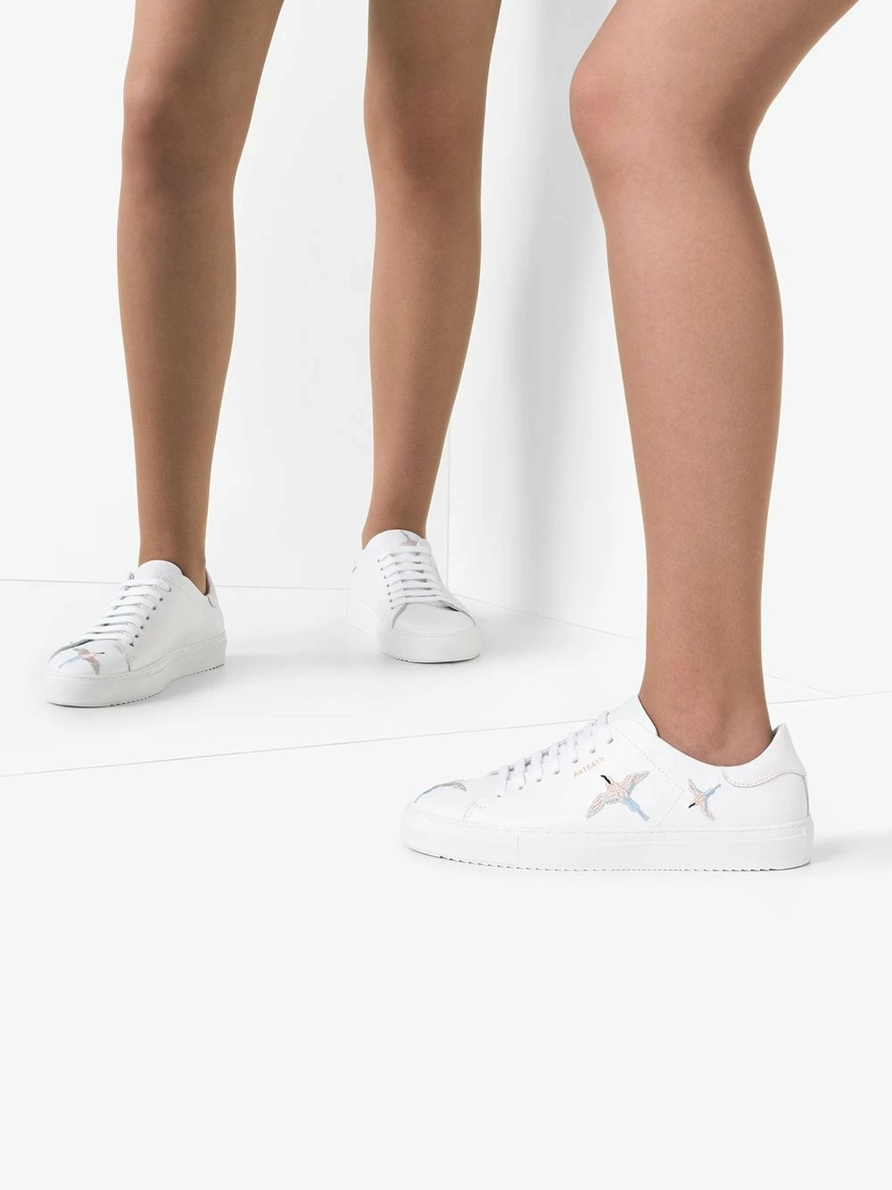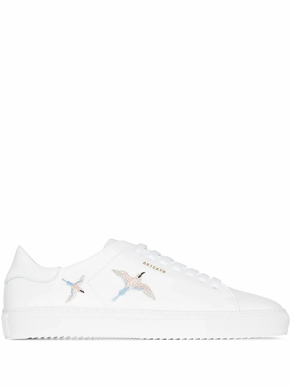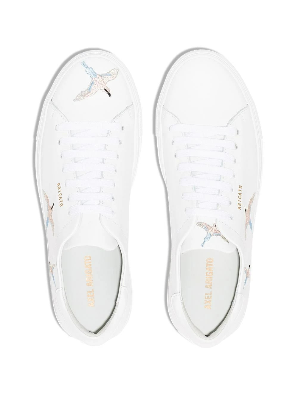 Baskets à détails brodés en cuir Axel Arigato avec bout rond, fermeture à lacer sur le devant, semelle intérieure à logo et semelle crantée en caoutchouc. Couleur : blanc.
