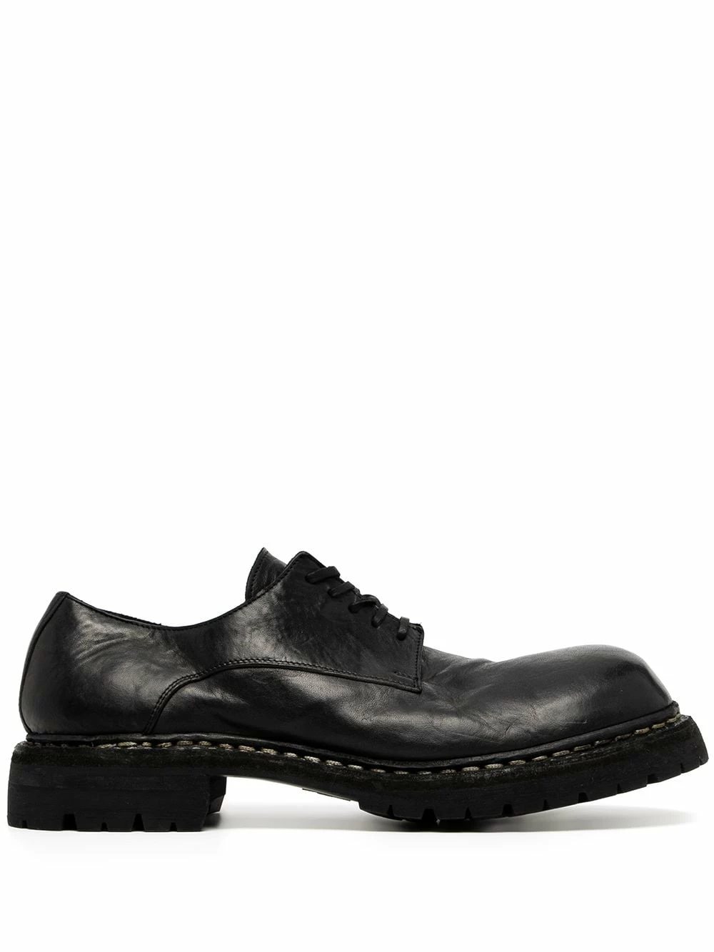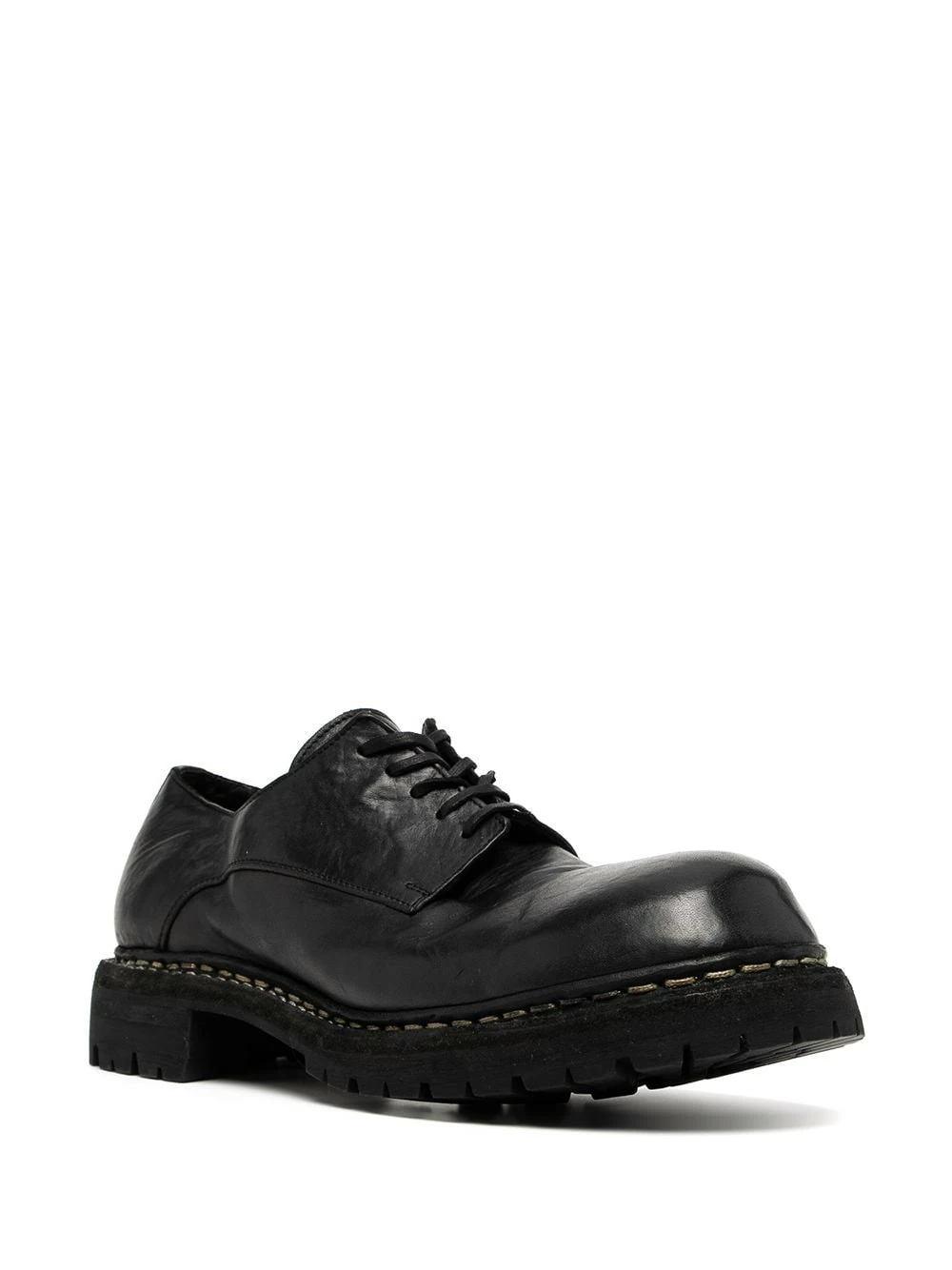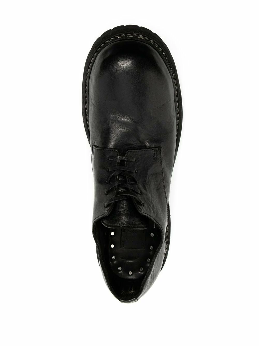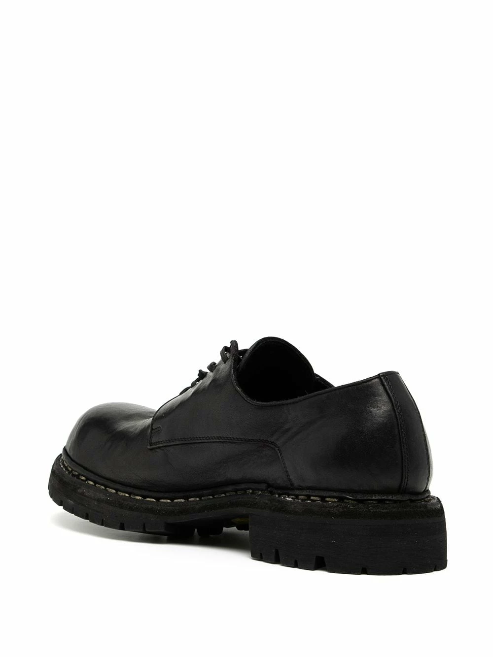 Coutures ton sur ton, bout en amande, fermeture à lacer sur le devant, semelle intérieure à logo, petit talon, semelle plate. Couleur : noir. Matière : cuir.