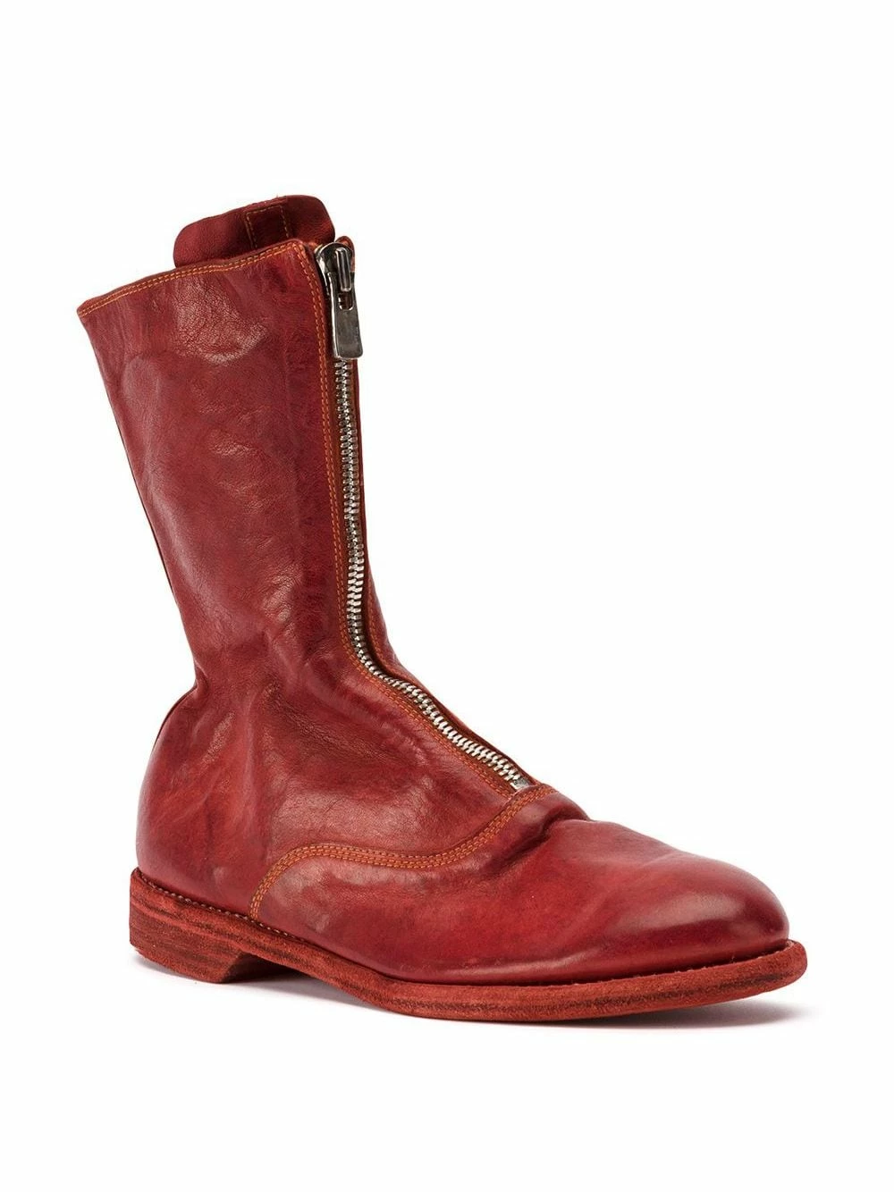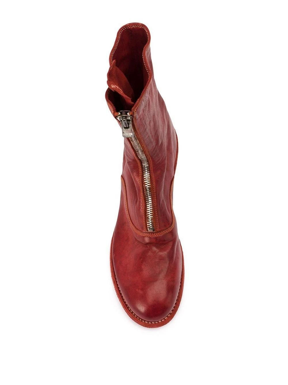 Bottines zippées en cuirs Guidi avec bout rond, semelle plate, hauteur cheville et fermeture zippée devant. Couleur : rouge.
