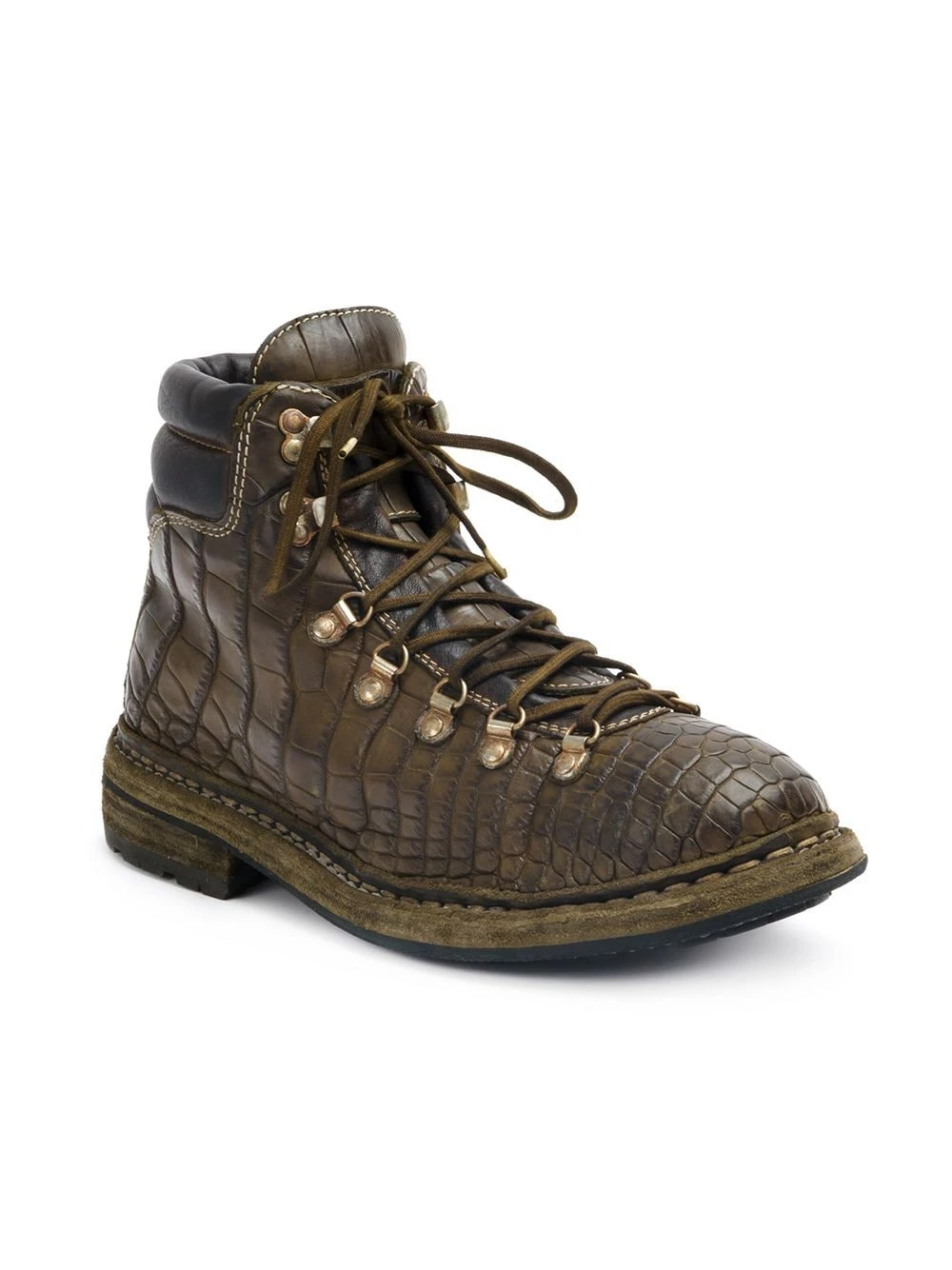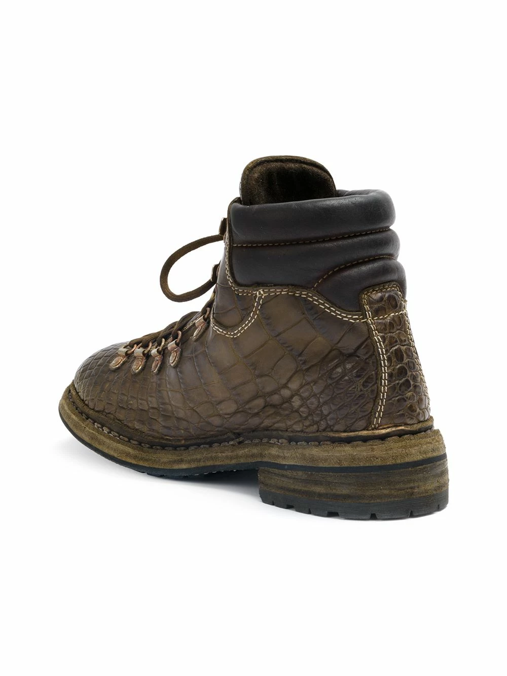 Bottines de montagne en peau de crocodile marron Guidi avec bout rond, fermeture à lacets, semelle plate et petit talon épais. Veuillez noter que cet article ne peut pas être expédié hors de l’Union Européenne.