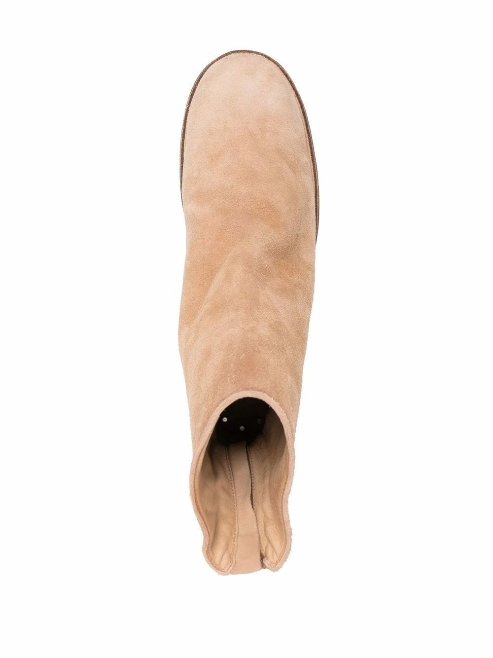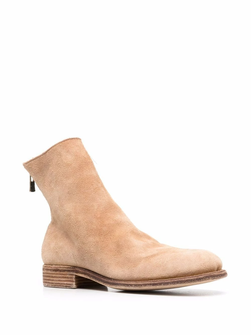 Effet froissé, bout rond, semelle intérieure griffée, semelle extérieure en cuir, fermeture zippée à l’arrière. Matière : daim.