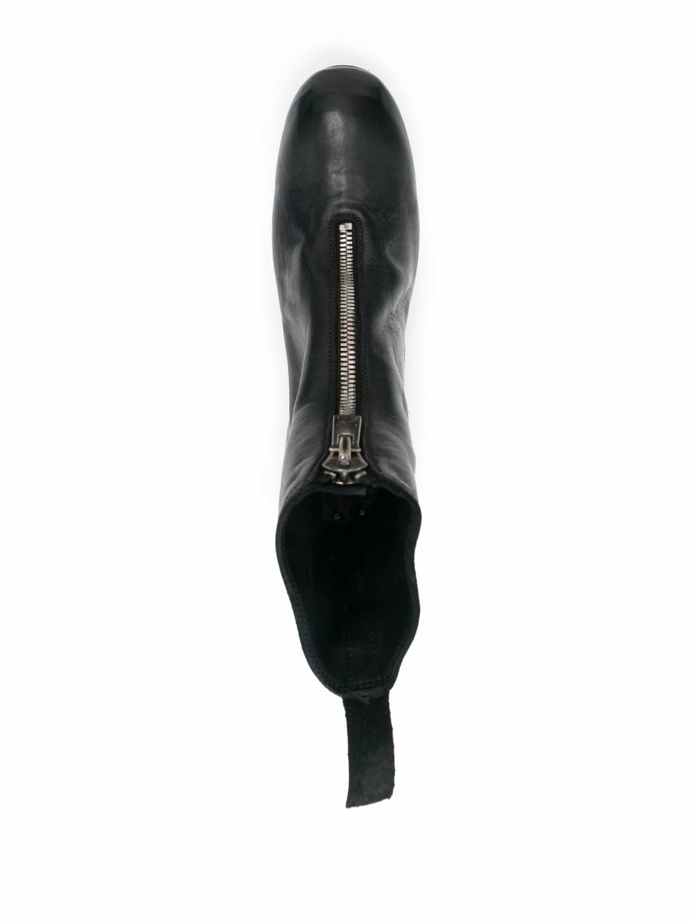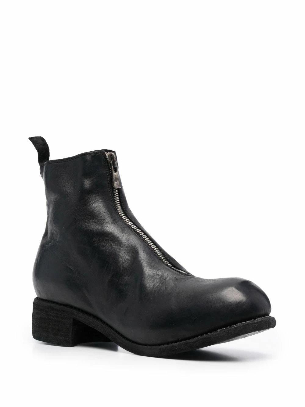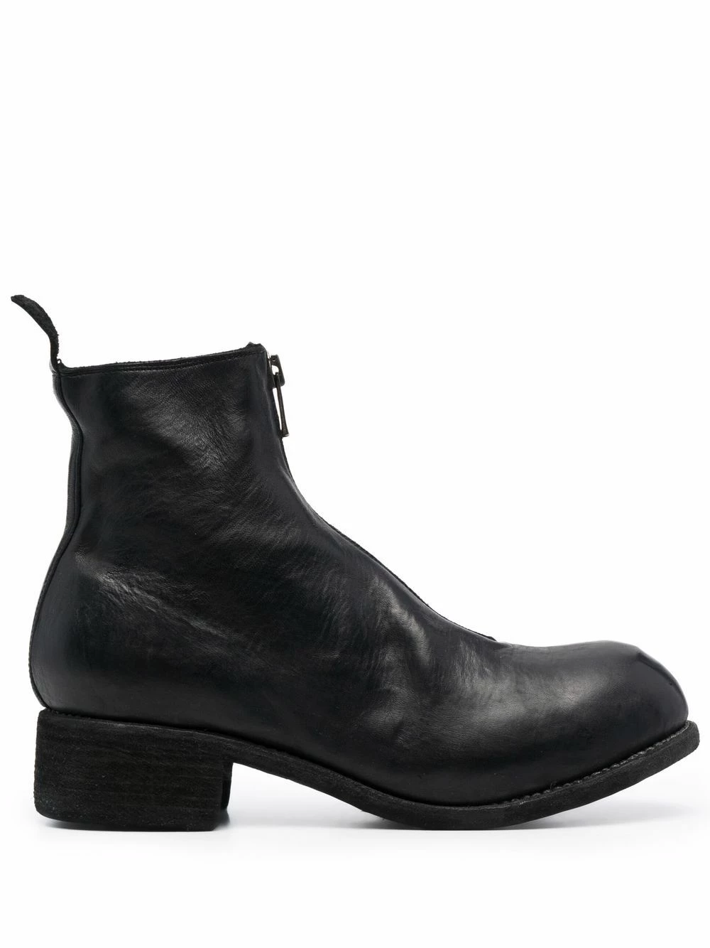 Hauteur cheville, bout rond, fermeture zippée devant, languette d’enfilage au talon, petit talon épais. Couleur : noir. Matière : cuir.