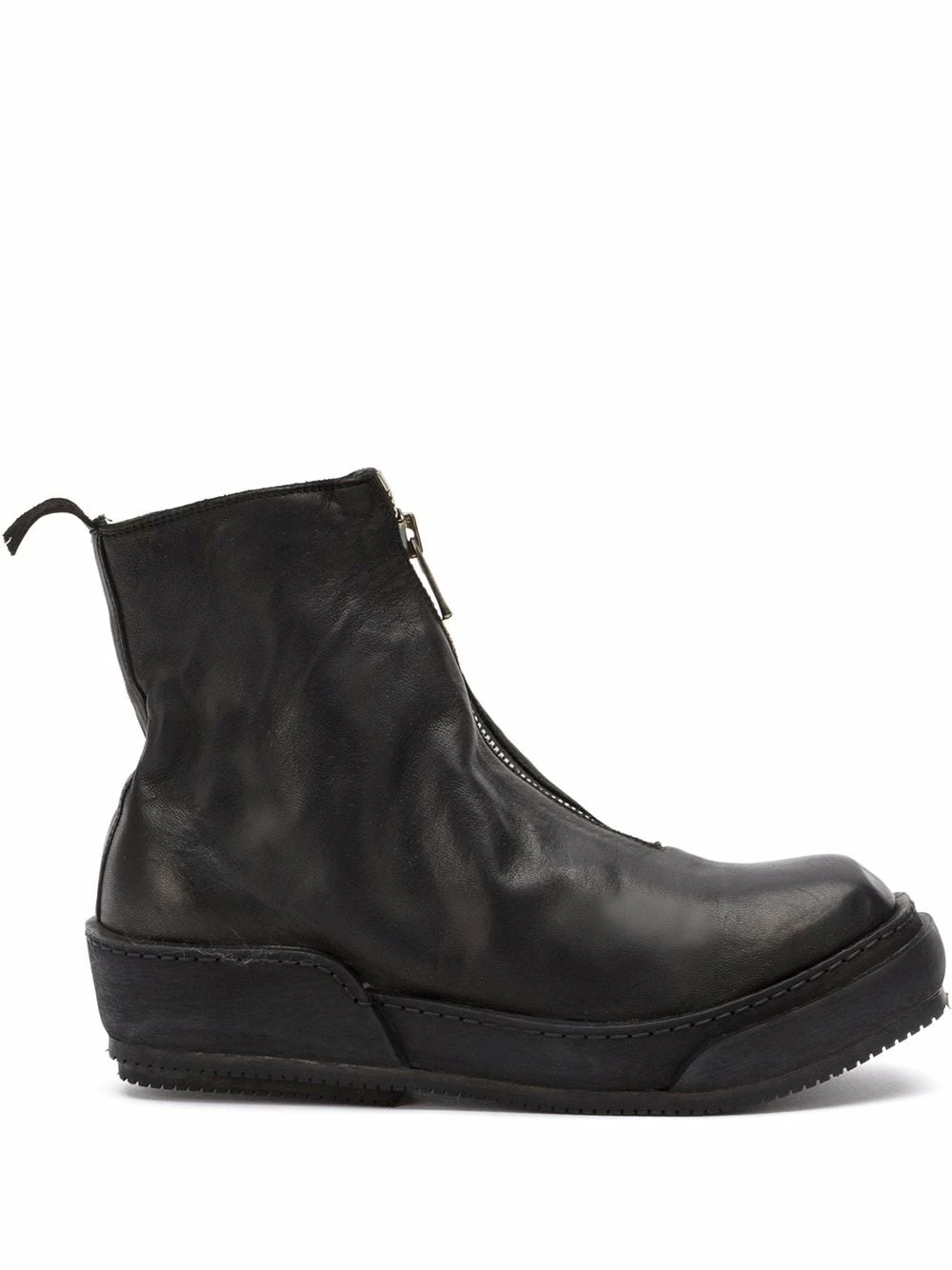 Bottines zippées en cuirs Guidi avec bout rond, finitions argentées, doublure monogrammée et a flatform sole. Couleur : noir.