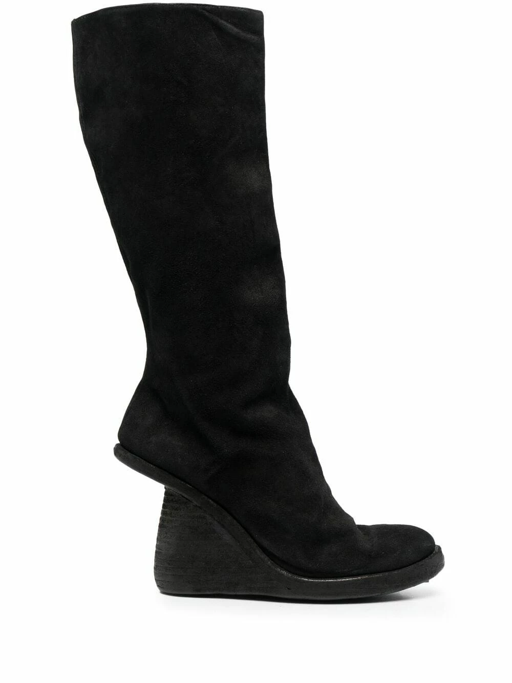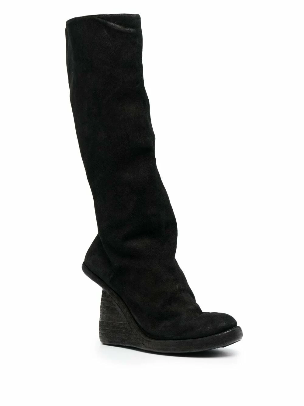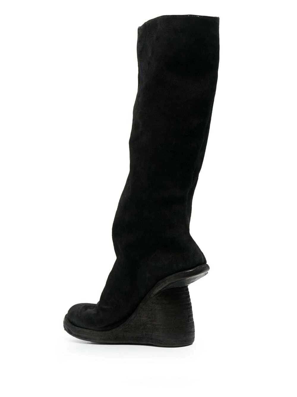 Hauteur genou, design à enfiler, bout rond, talon compensé haut. Couleur : noir. Matière : cuir.