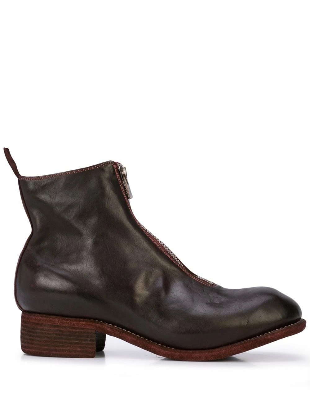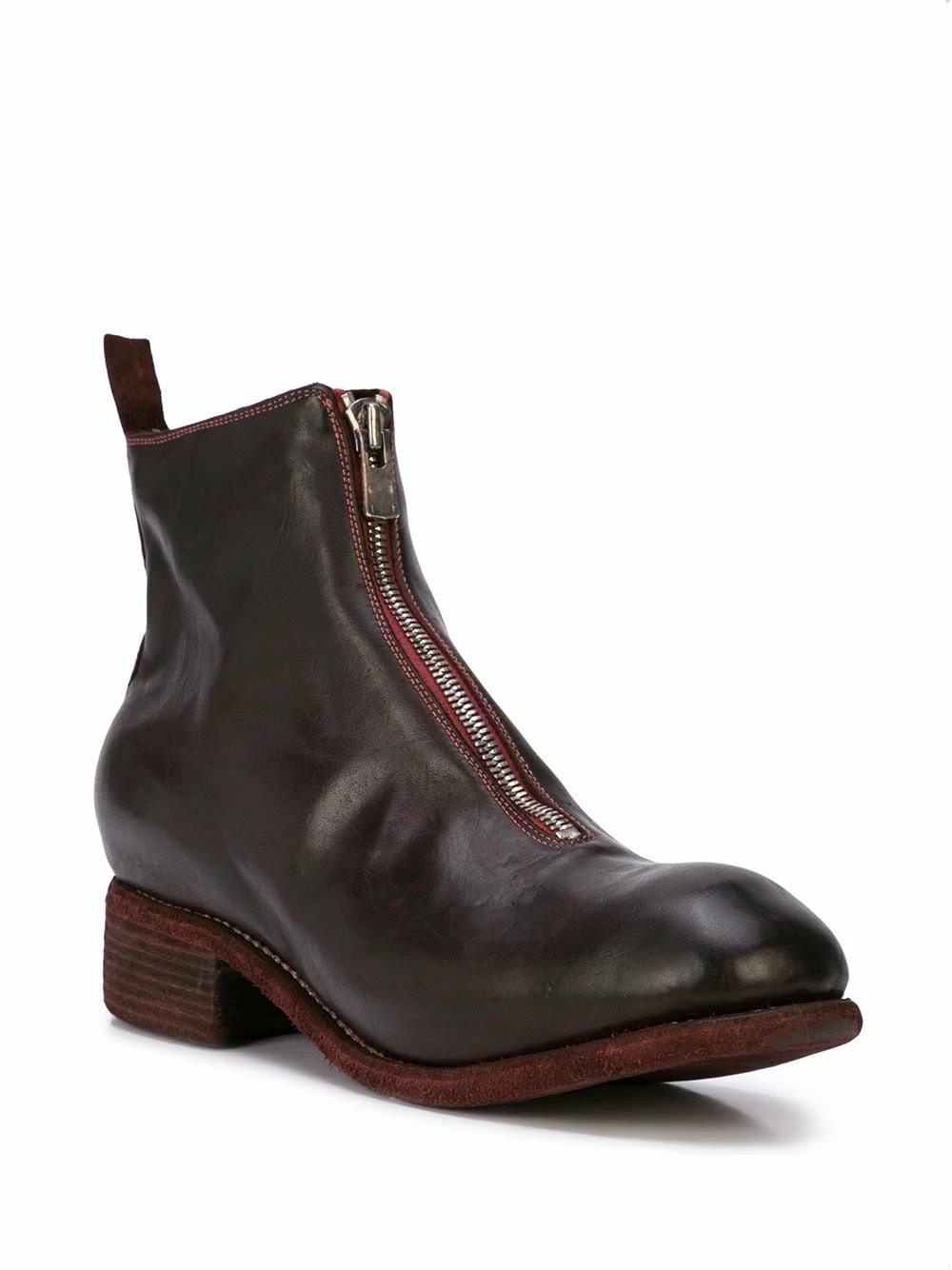 Bottines à fermeture zippée en cuir de cheval Guidi avec bout en amande, languette arrière, semelle plate et petit talon épais.
