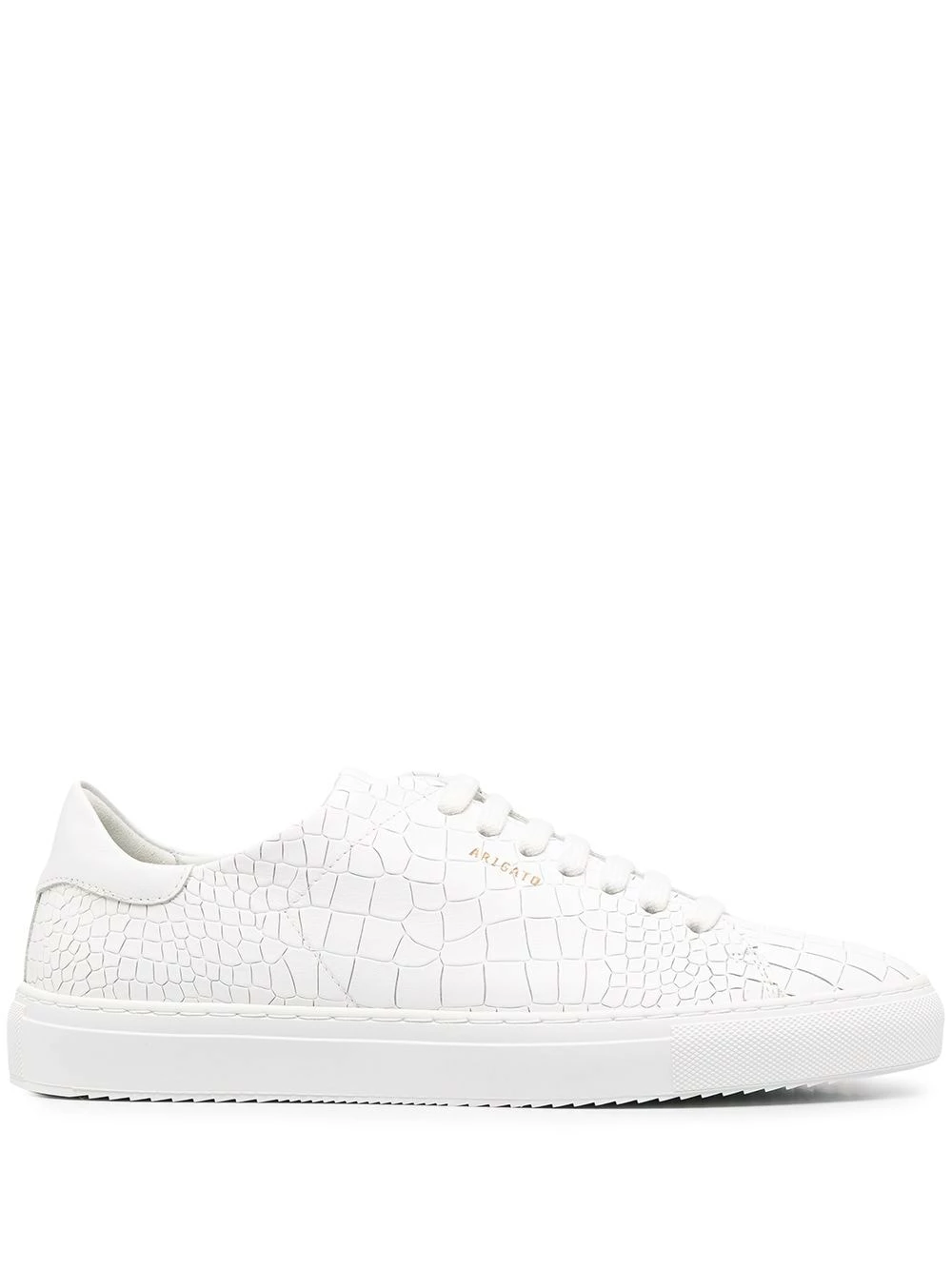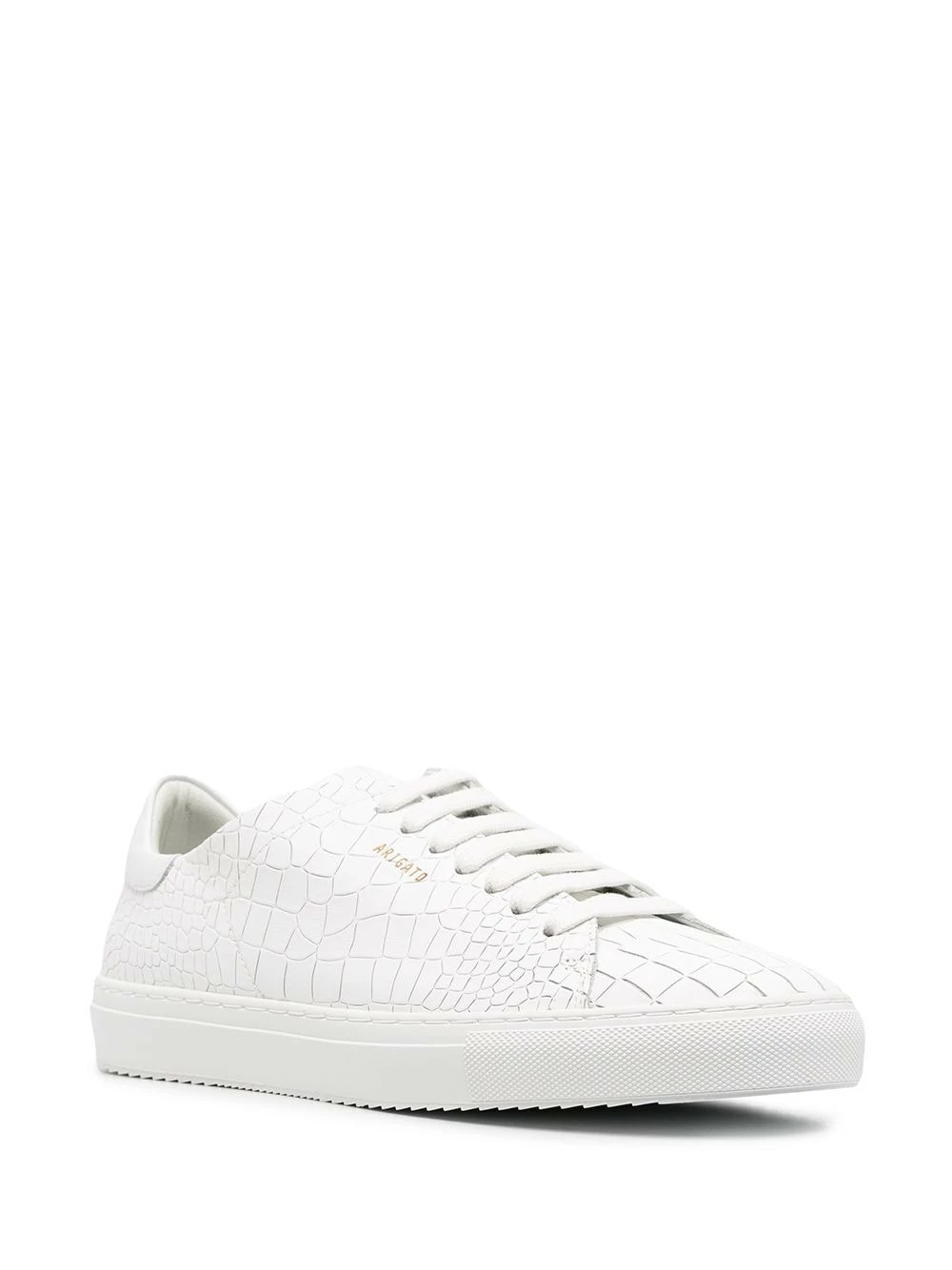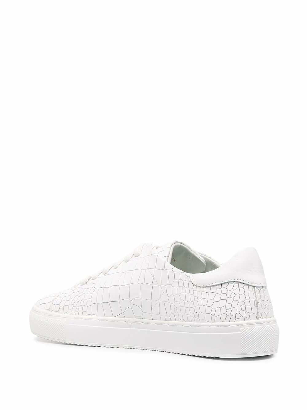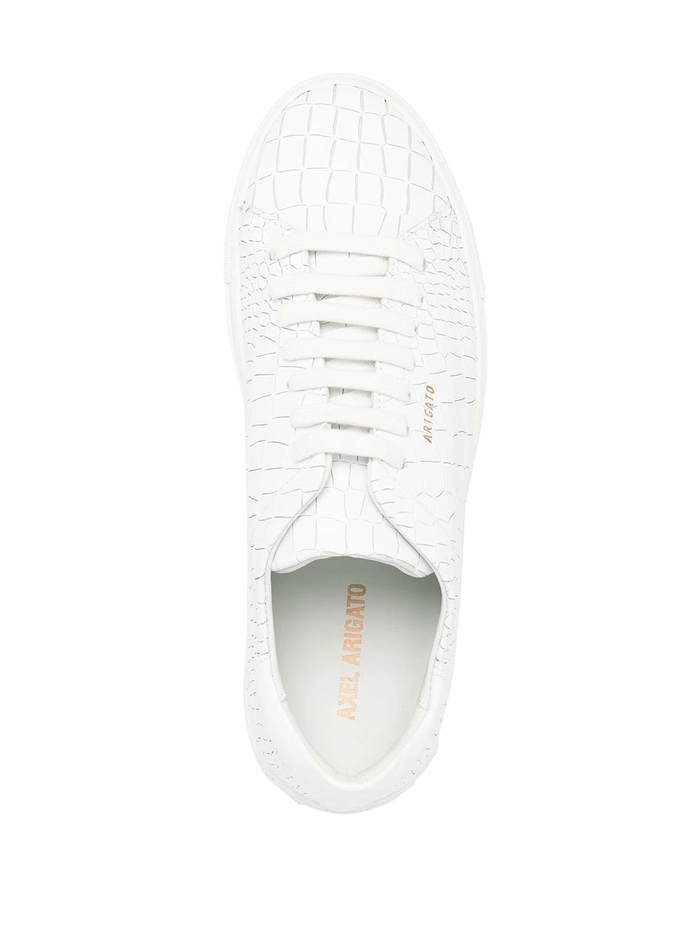 Effet peau de crocodile, logo doré, bout rond, fermeture à lacer sur le devant, semelle intérieure à logo, semelle plate en caoutchouc. Couleur : blanc. Matière : cuir.
