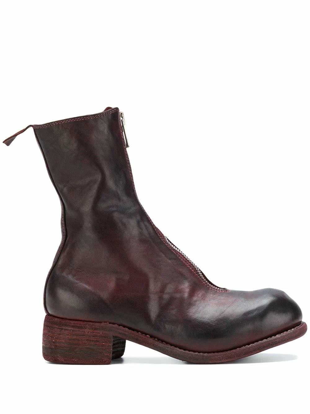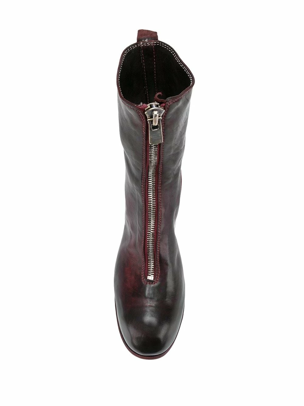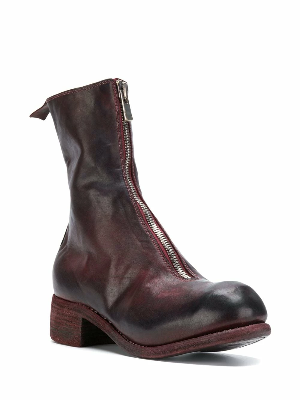 Bottines zippées en cuir bordeaux Guidi avec bout rond, effet délavé usé, languette arrière et petit talon épais.
