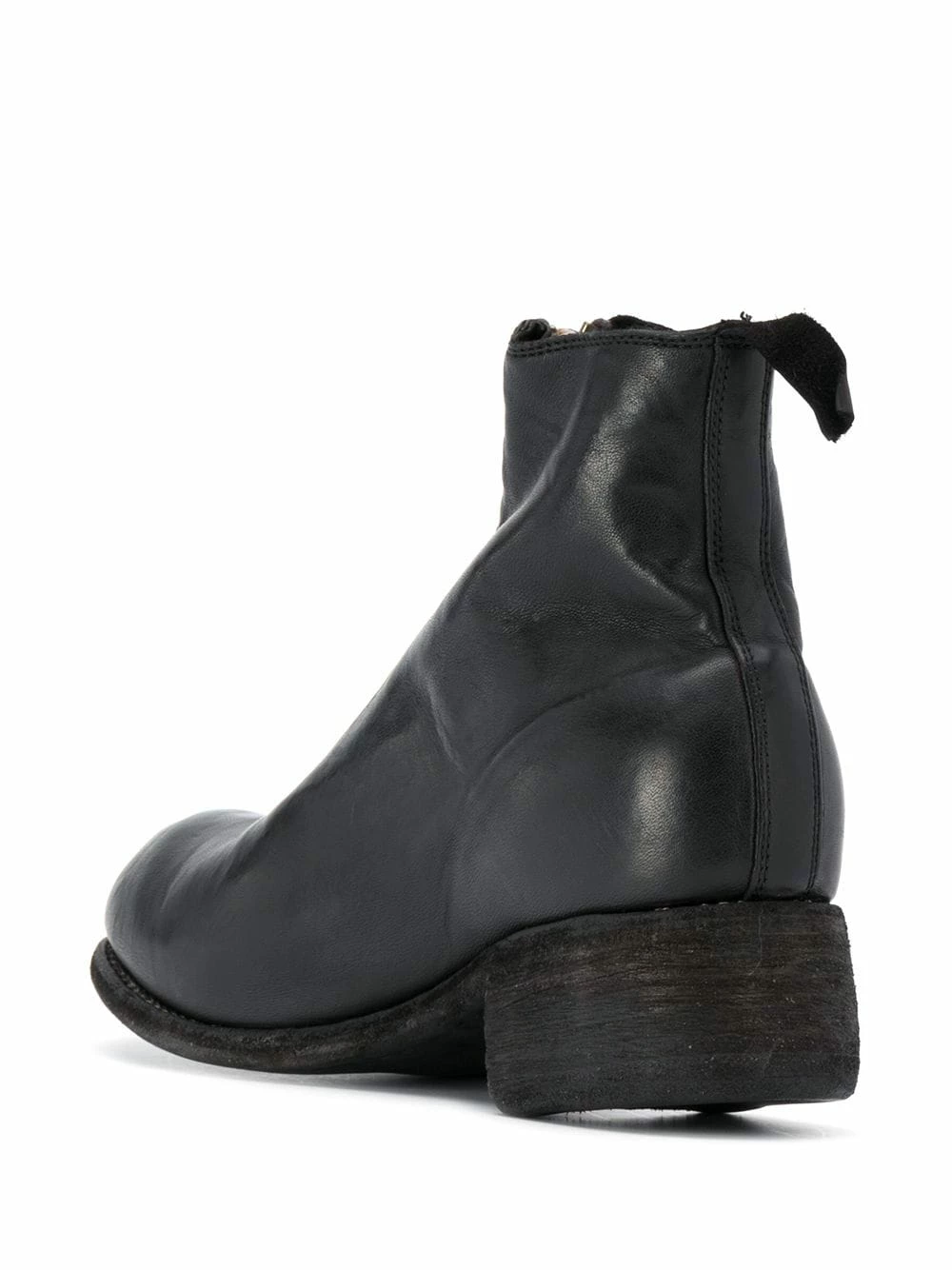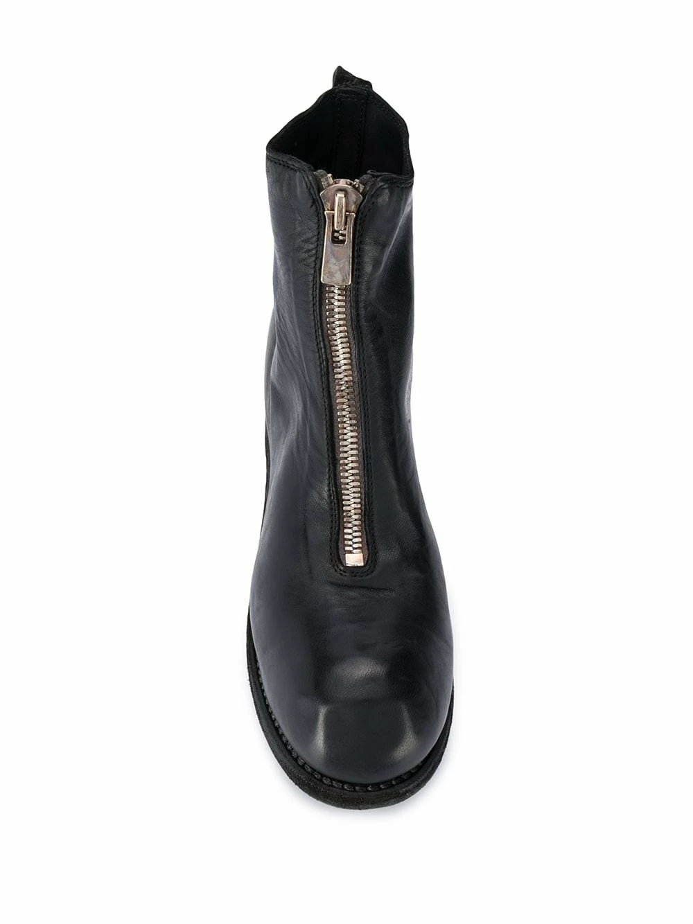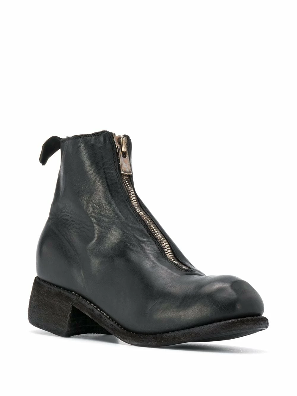 Bout en amande, fermeture zippée devant, petit talon épais, semelle plate en cuir. Couleur : noir. Matière : cuir.