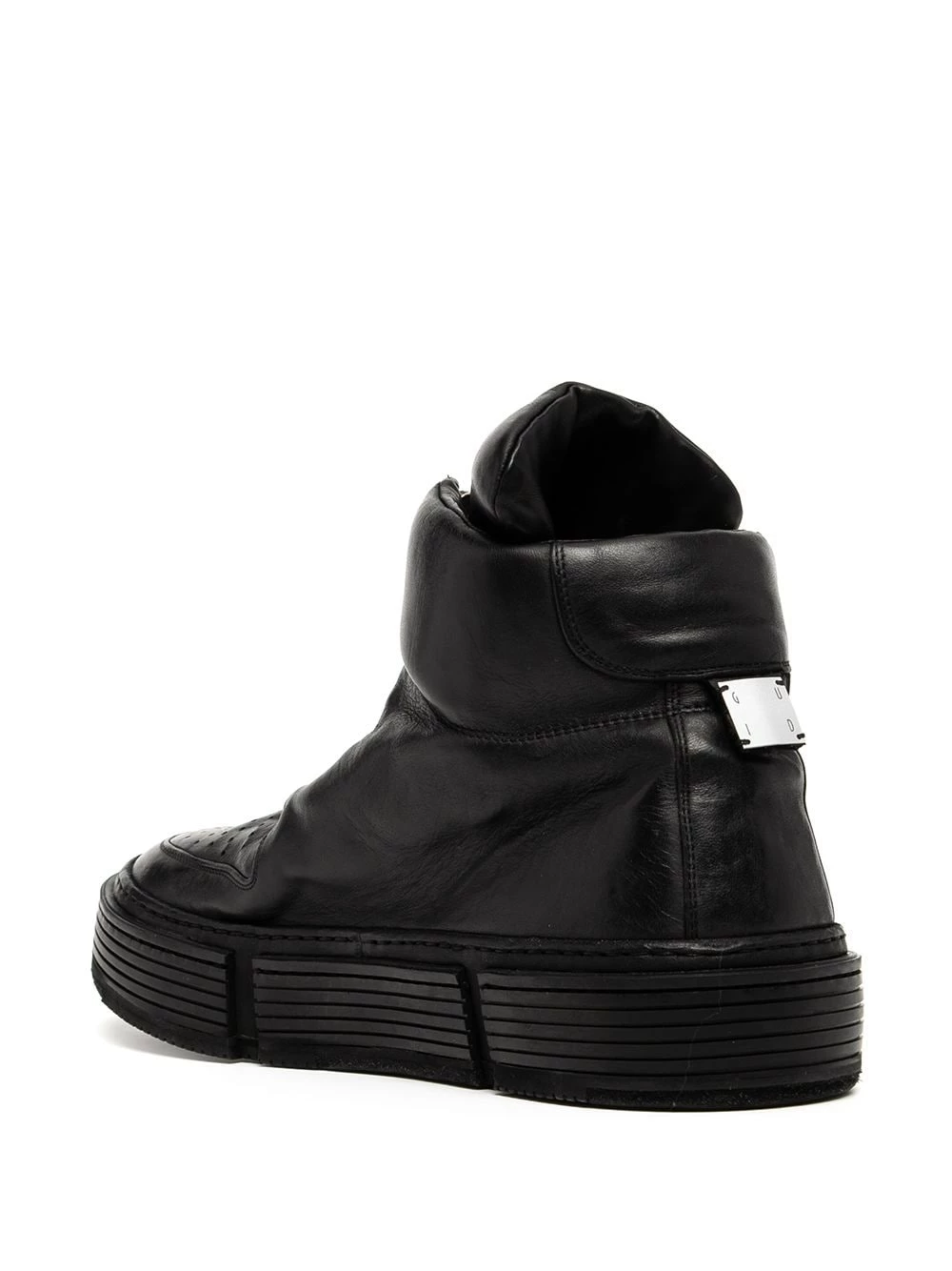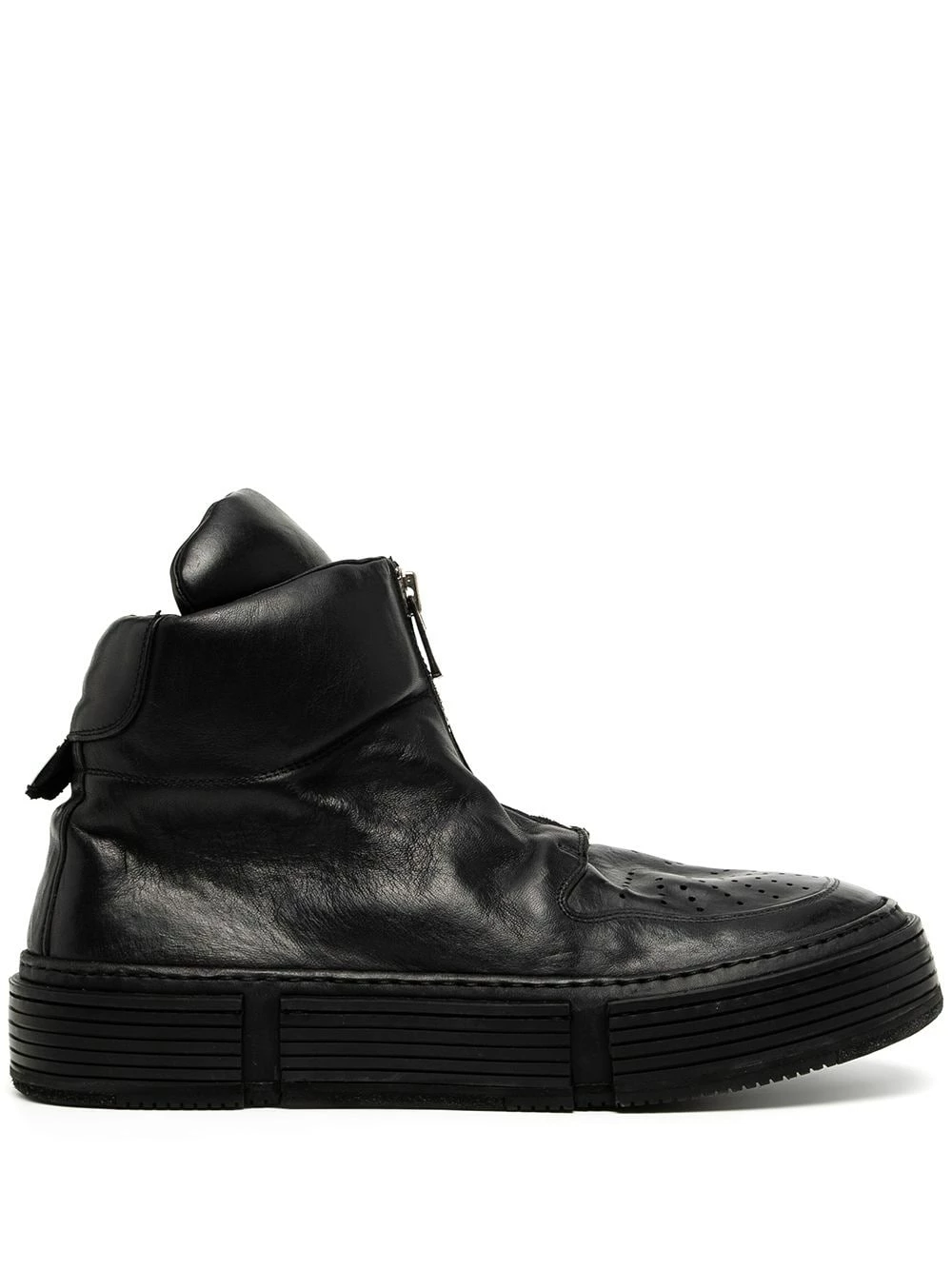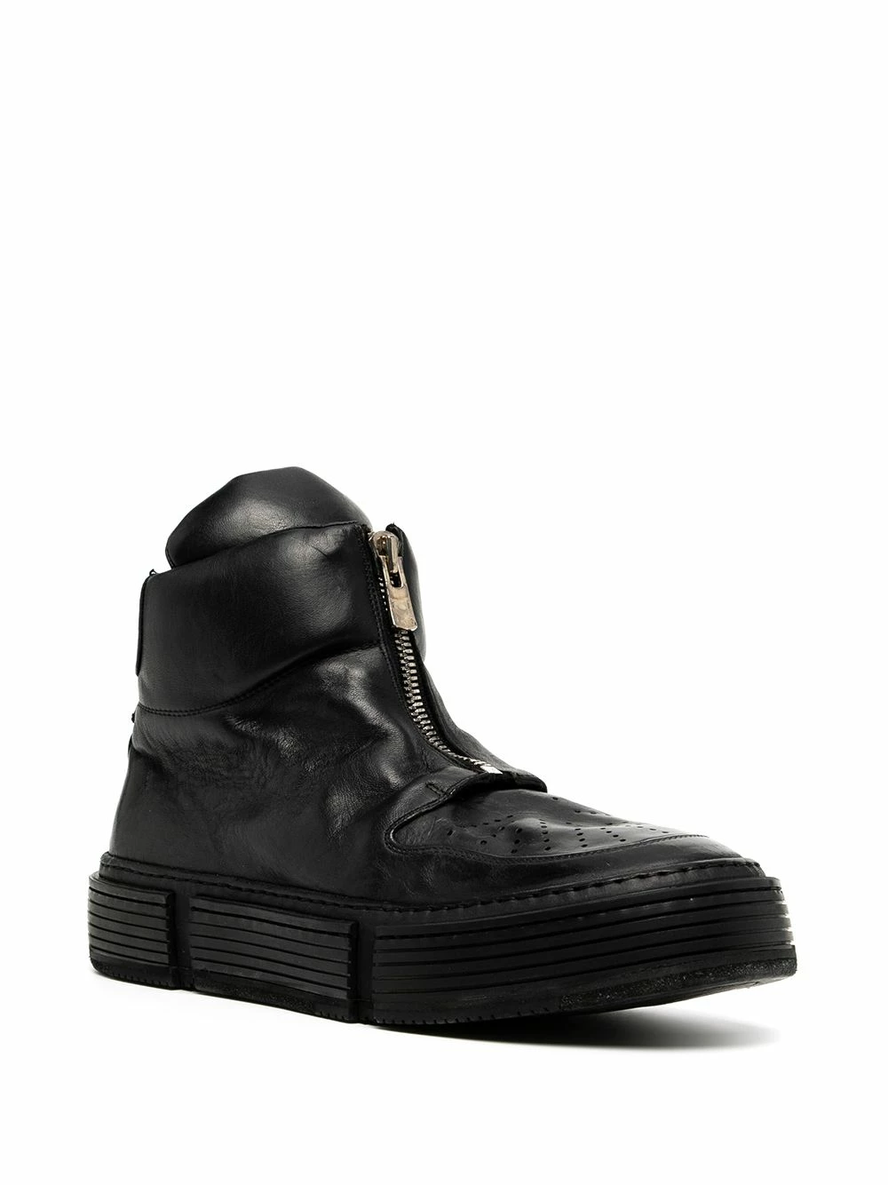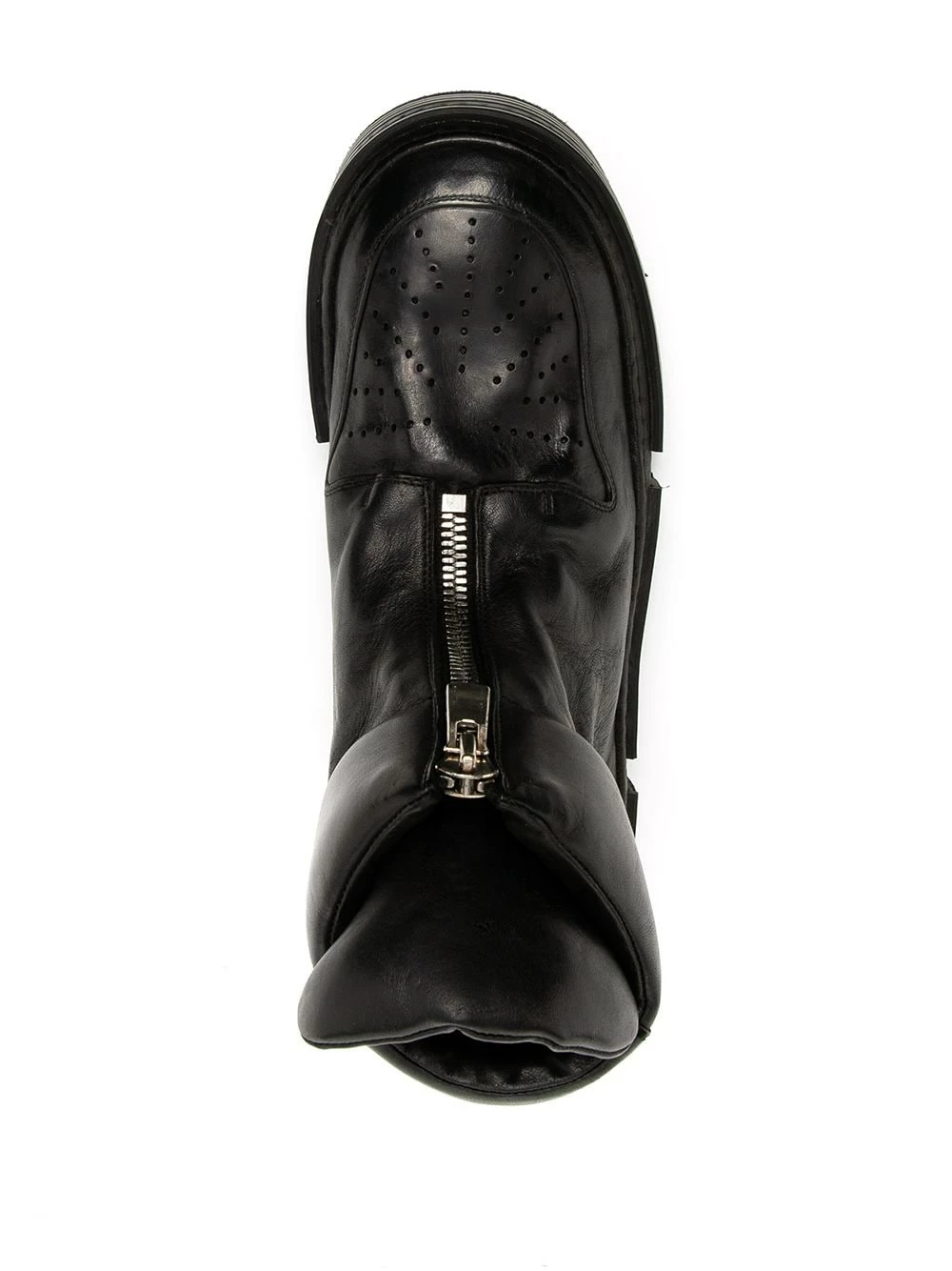 Bout perforé, bout rond, fermeture zippée devant, hauteur cheville, semelle à plateforme. Couleur : noir. Matière : cuir.