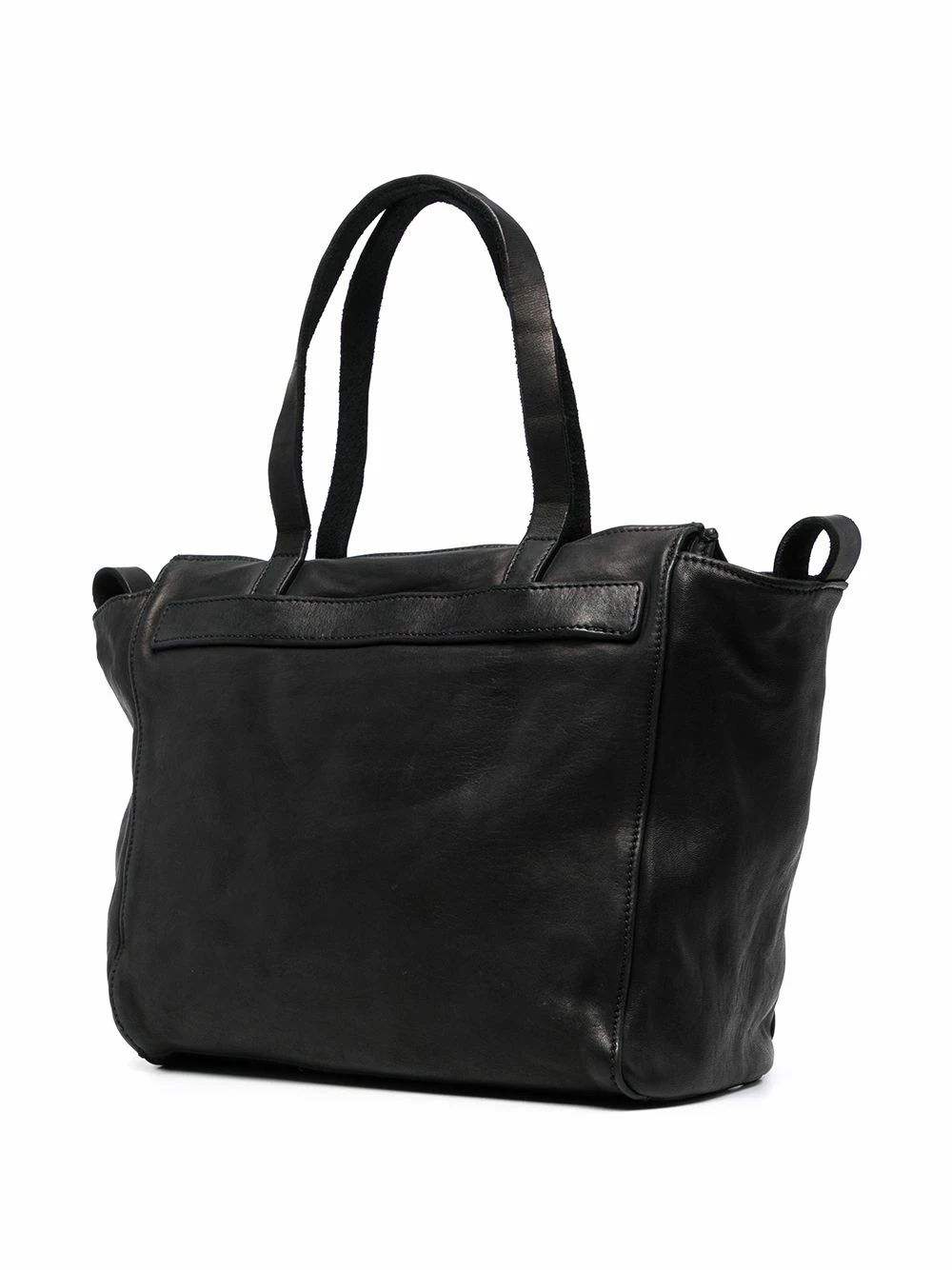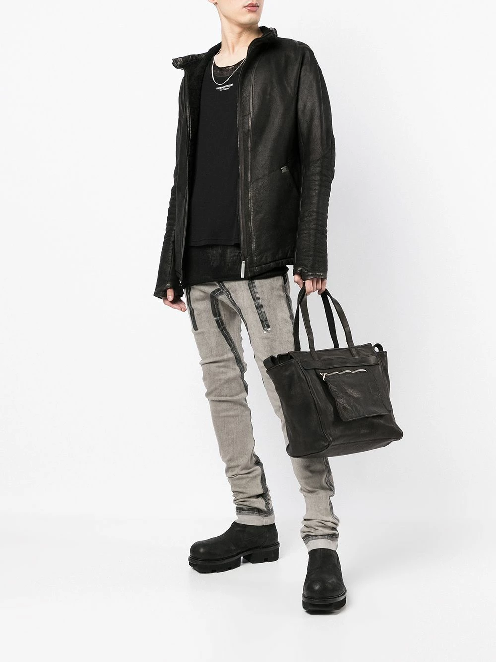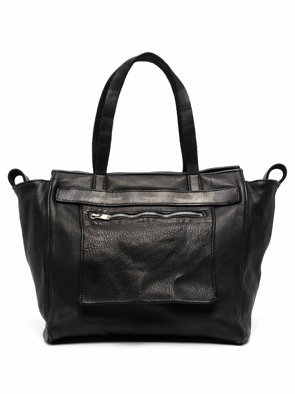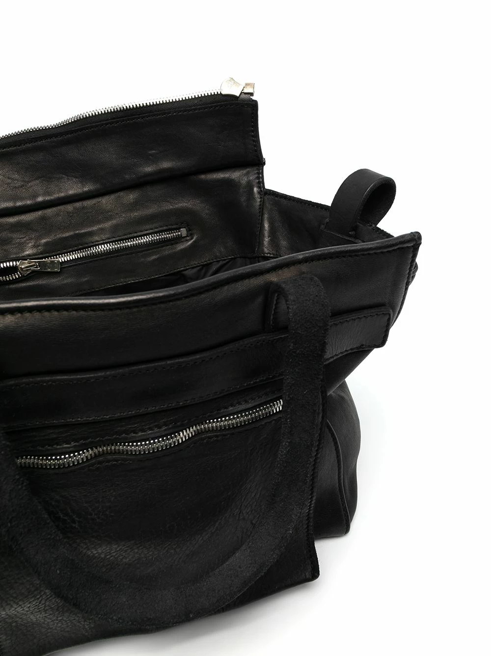 Anses en cuir sur le dessus, fermeture zippée sur le dessus, poche zippée sur le devant, poche intérieure zippée. Couleur : noir. Matière : cuir.