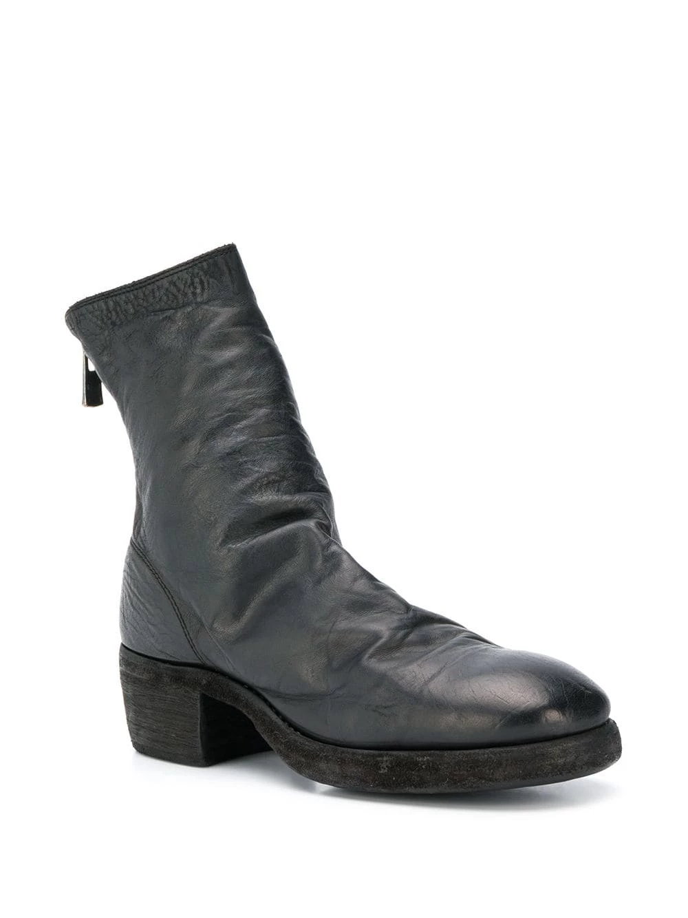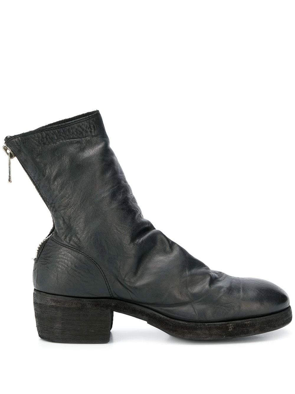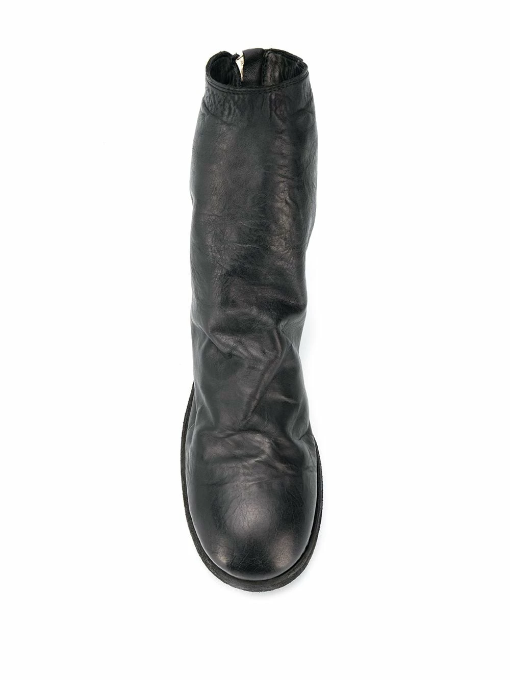 Bottines à effet usé Guidi avec bout rond, fermeture zippée arrière et talon mi-haut. Couleur : noir.