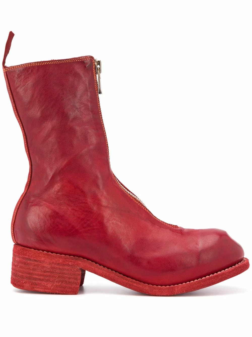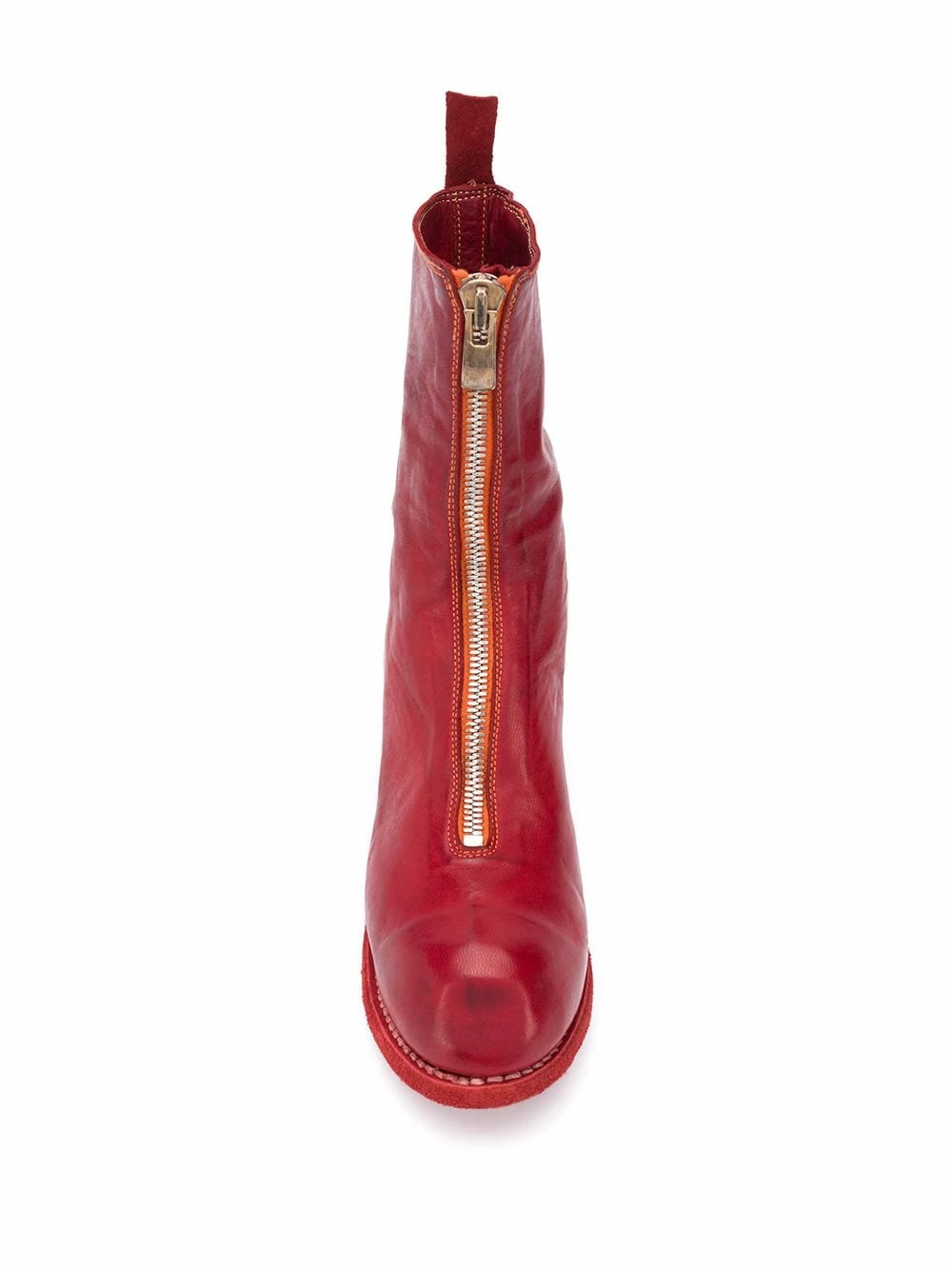 Bottes à fermeture zippée en cuir Guidi avec surface lisse à finition mate, hauteur cheville, languette arrière et petit talon épais. Couleur : rouge.