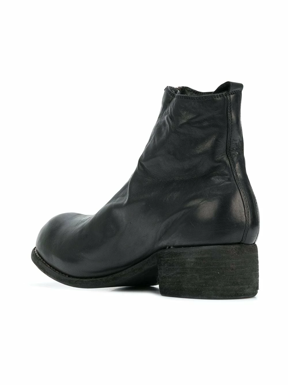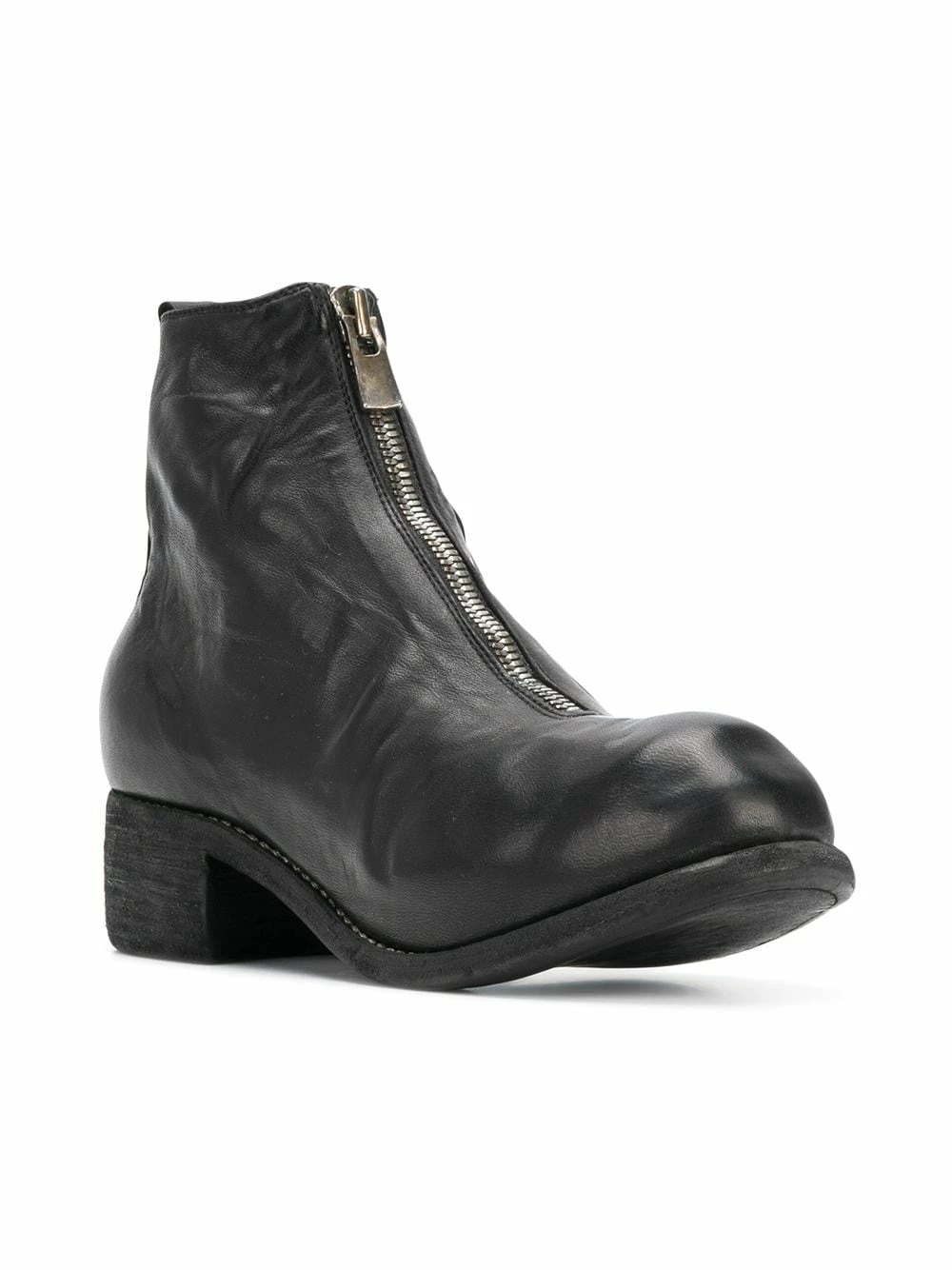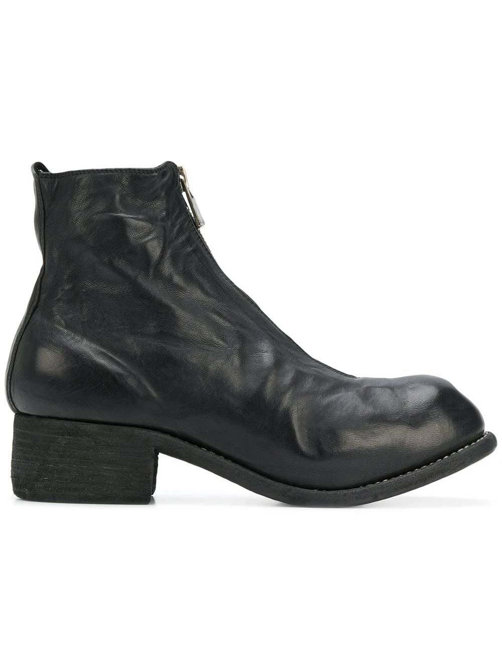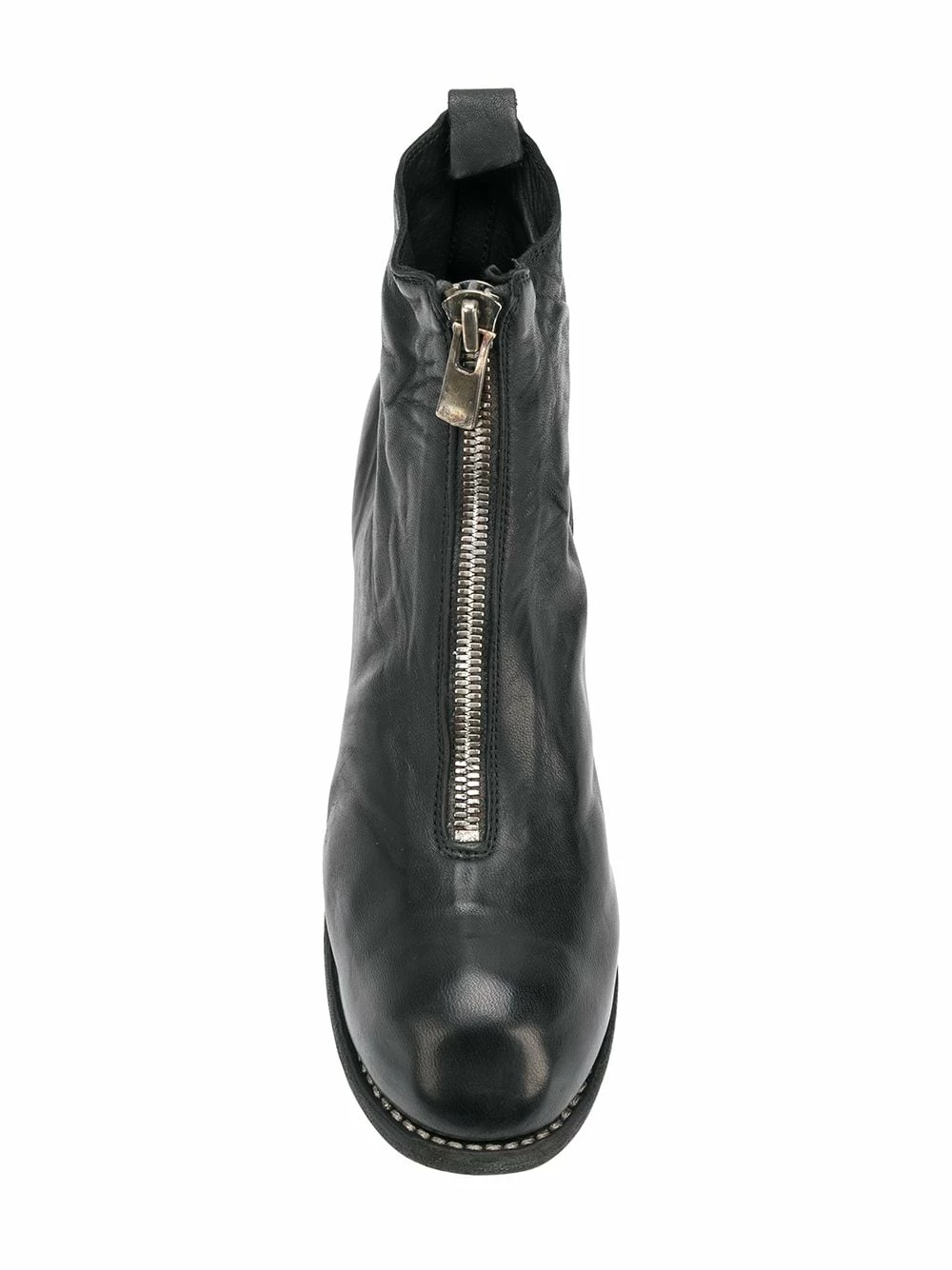 Bottines zippées en cuir de veau noir Guidi avec hauteur cheville, bout rond, fermeture zippée devant, petit talon épais et pinces.