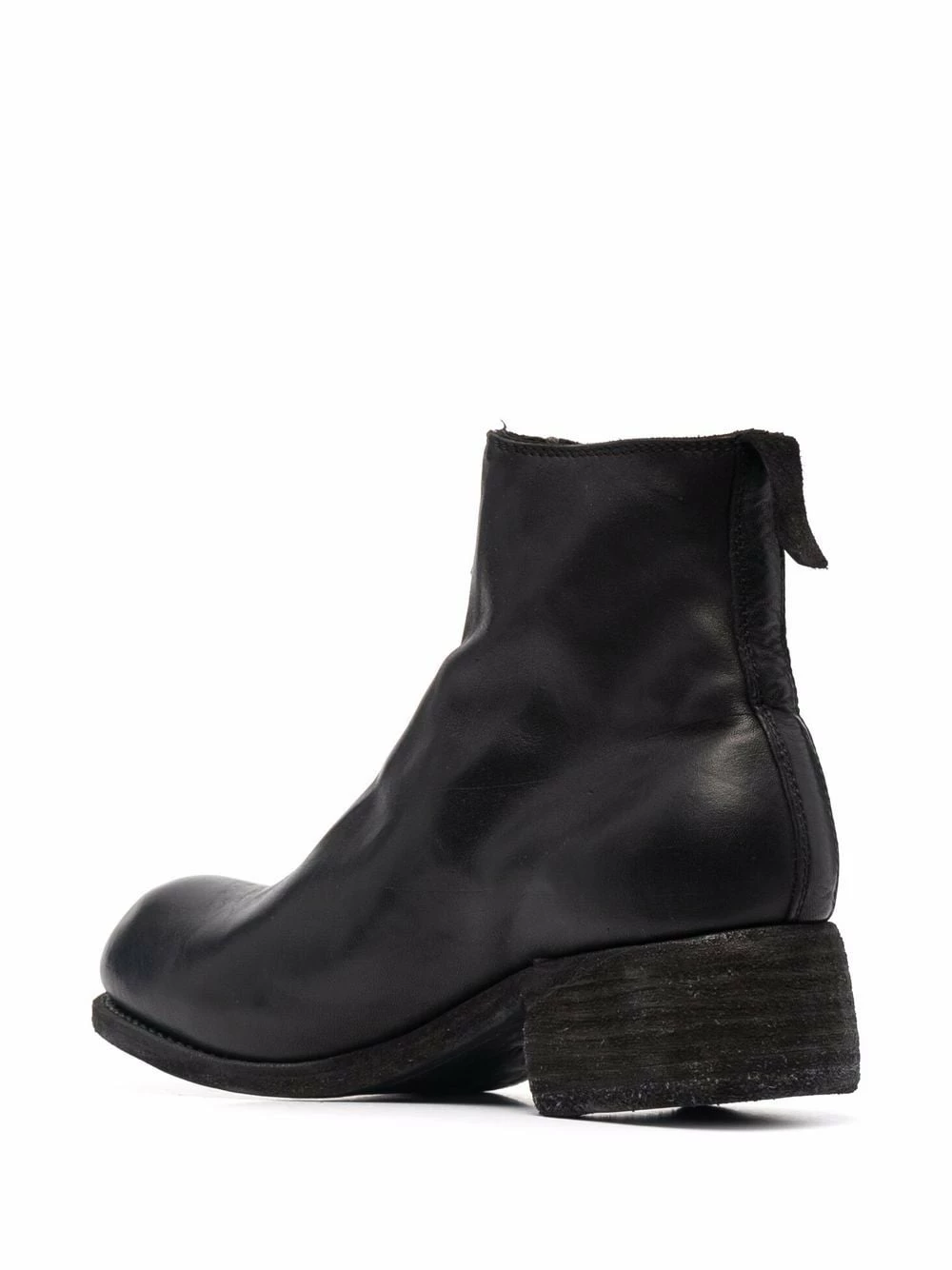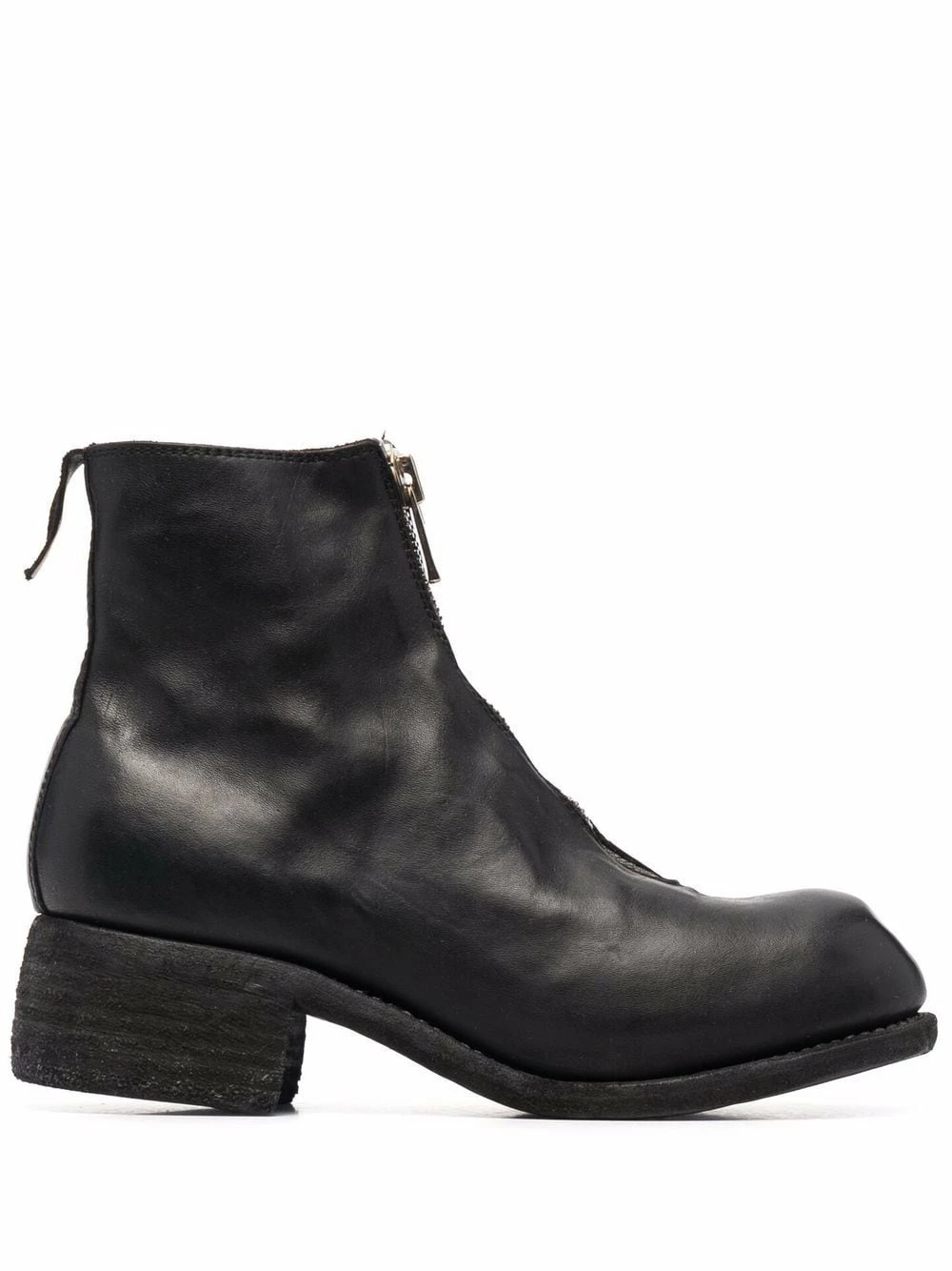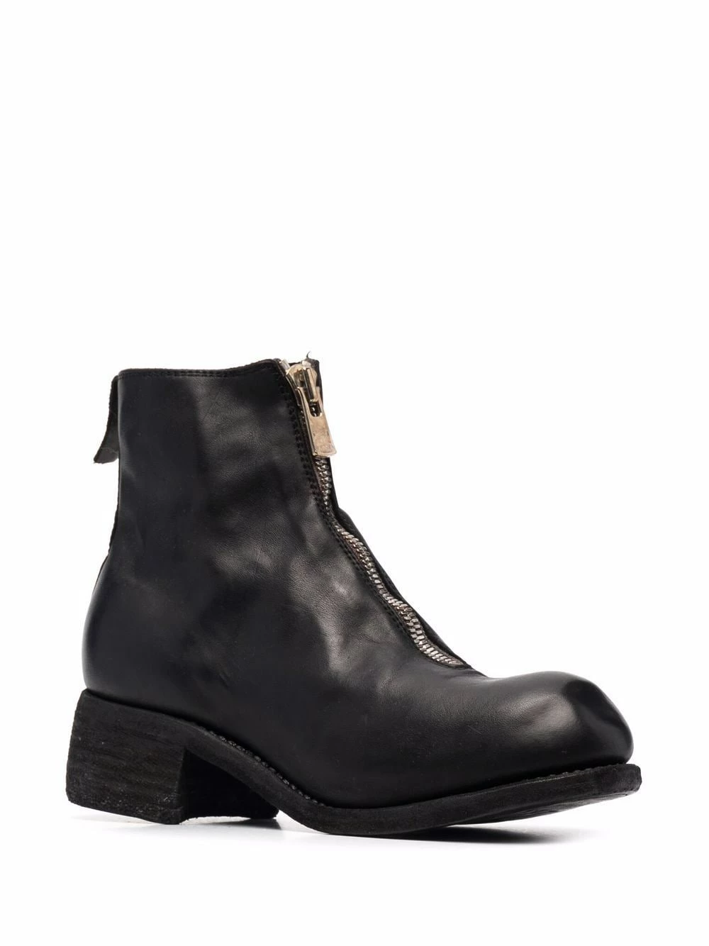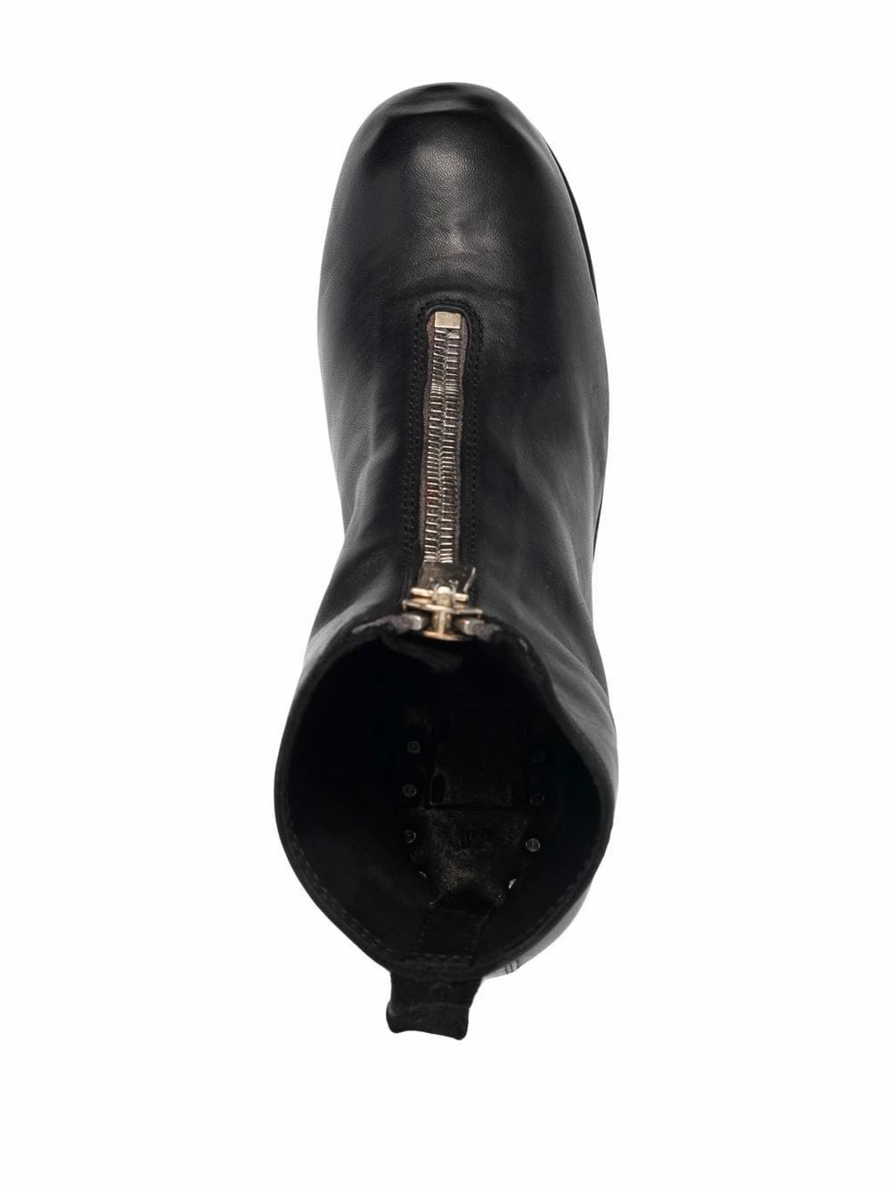 Coutures ton sur ton, bout en amande, fermeture zippée devant, languette d’enfilage au talon, contrefort à logo, petit talon épais. Couleur : noir. Matière : cuir.