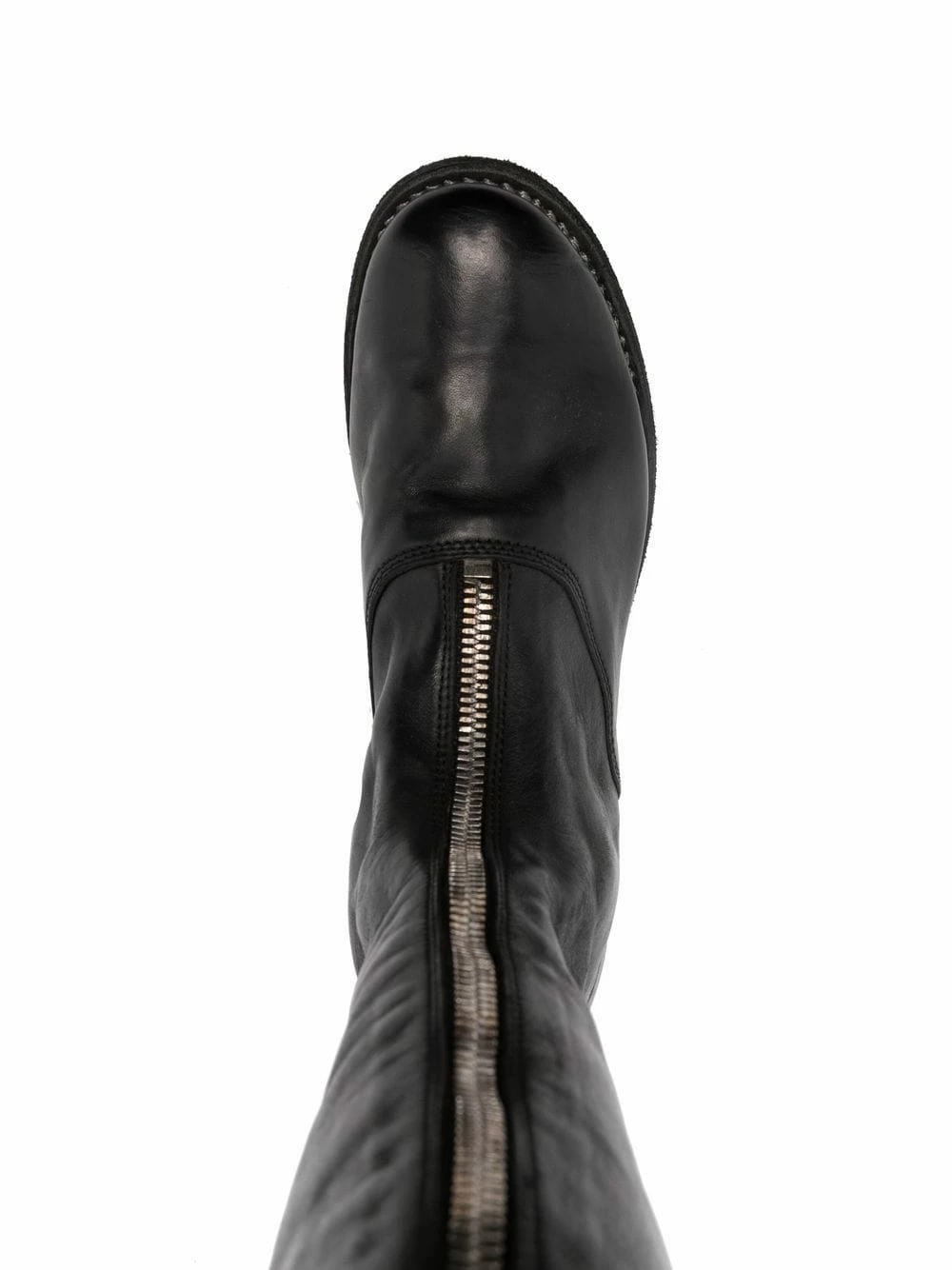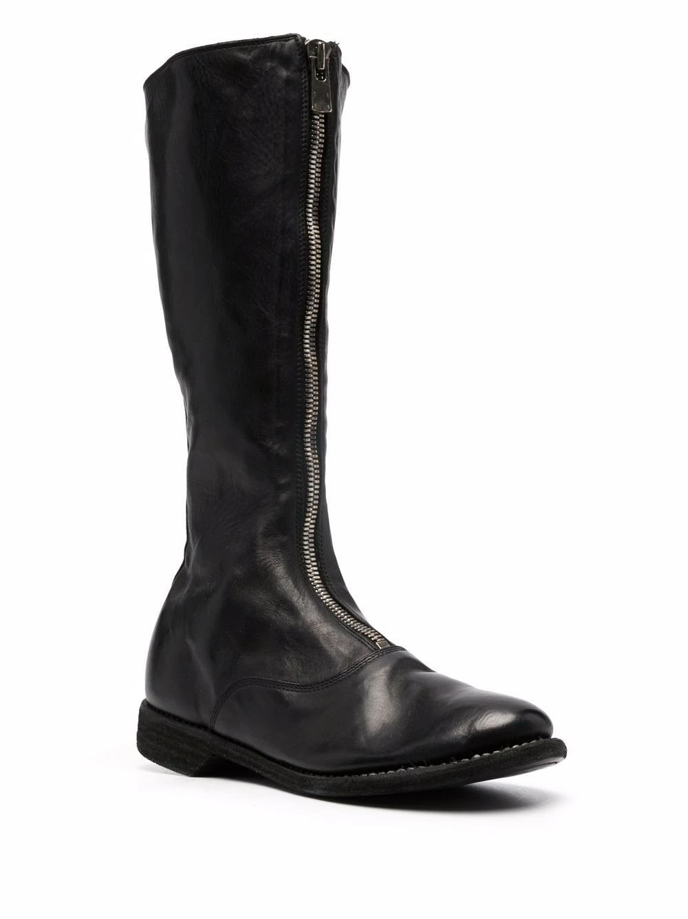 Longueur au dessous du genou, bout rond, fermeture zippée devant, petit talon, semelle en cuir. Couleur : noir. MatiÚre : cuir.