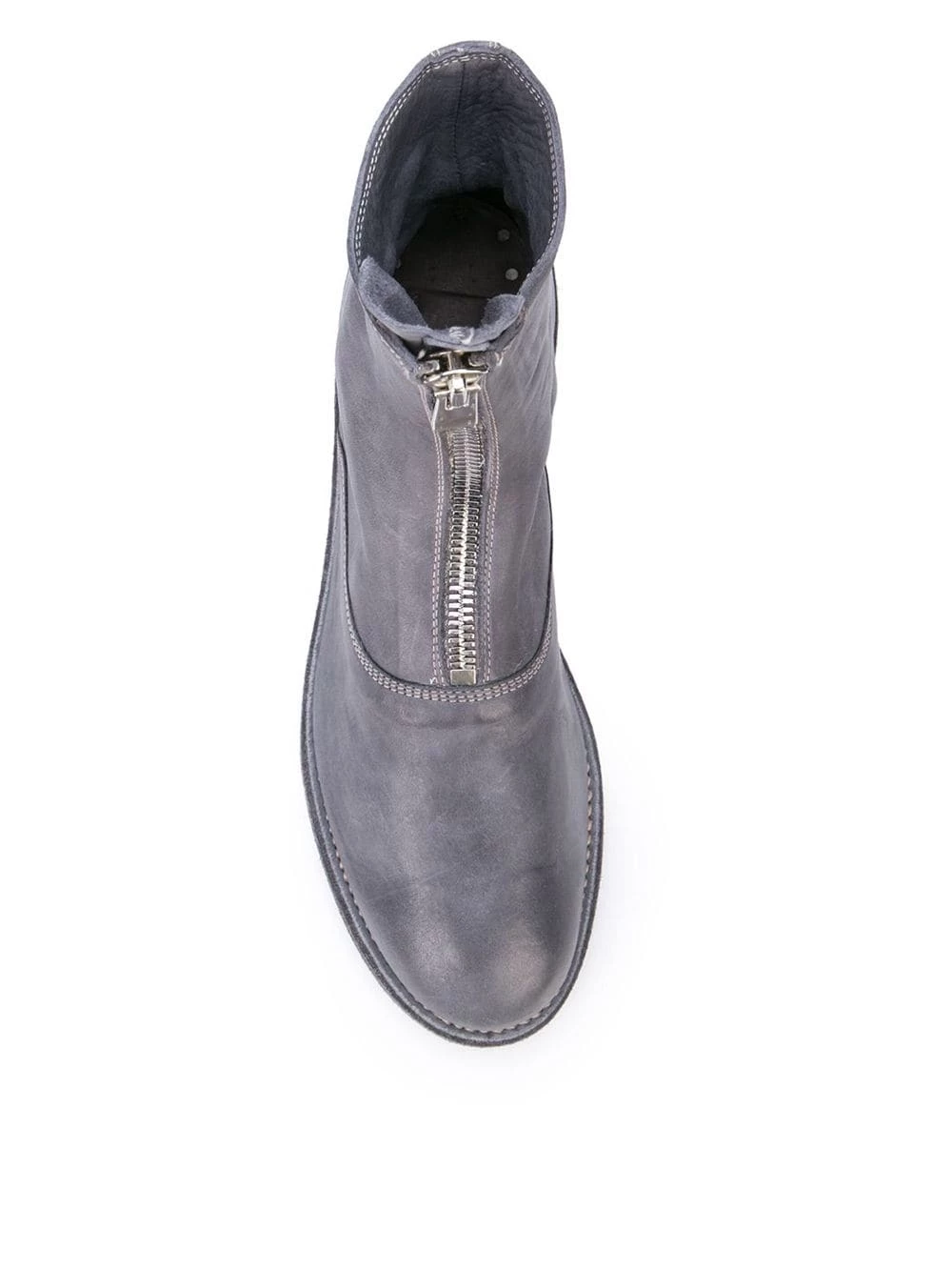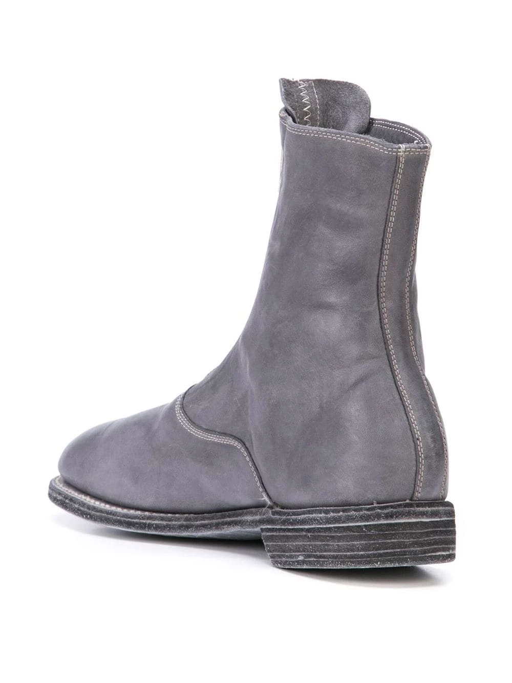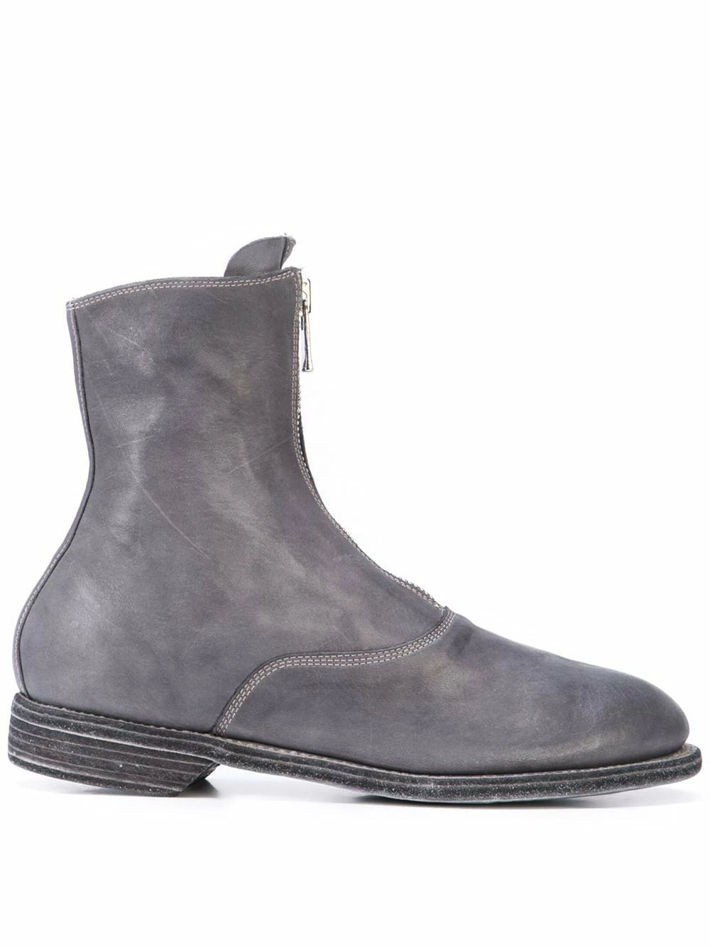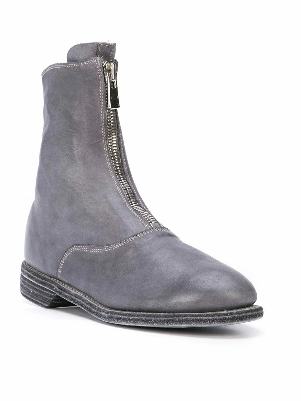 Bottines à fermeture zippée devant en cuir de cheval Guidi avec bout rond, languette oversize, empiècements à coutures visibles, hauteur cheville et petit talon épais. Couleur : gris.