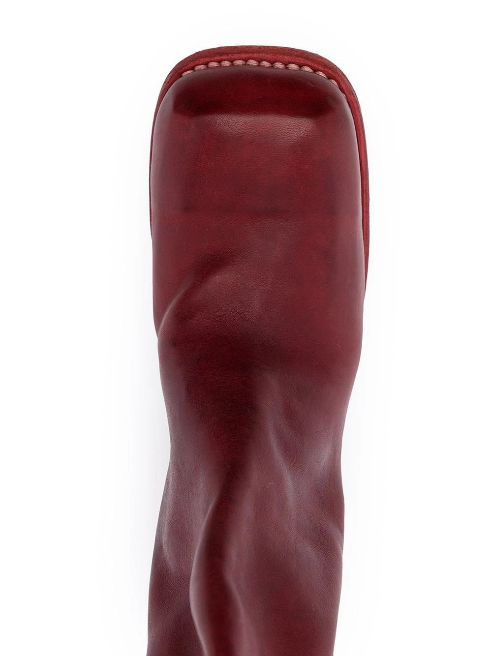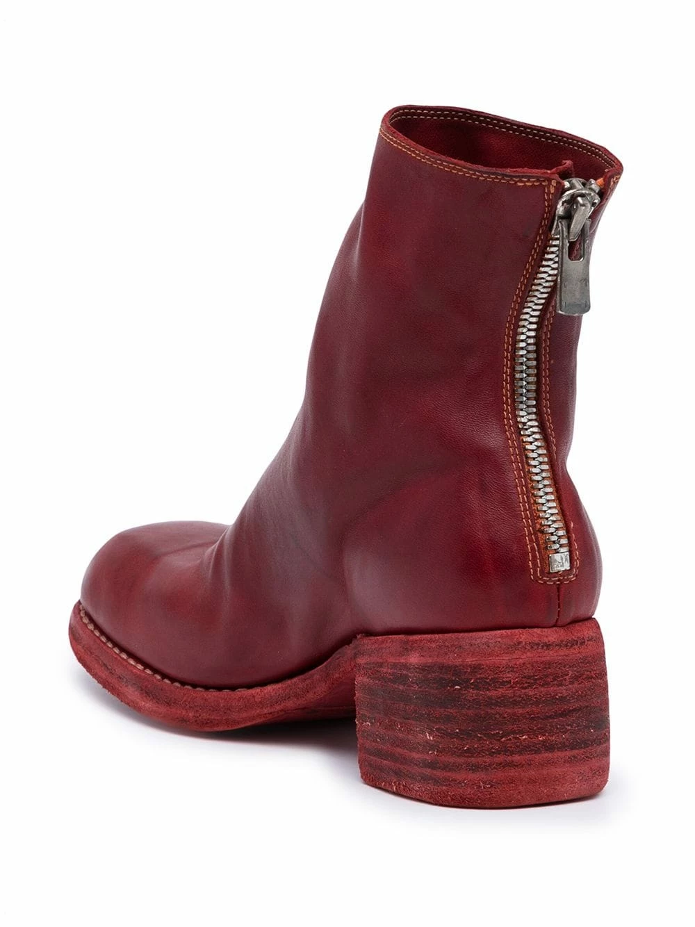 Coutures contrastantes, fermeture zippée à l’arrière, bout carré, talon mi-haut épais, doublure intégrale. Matière : cuir.