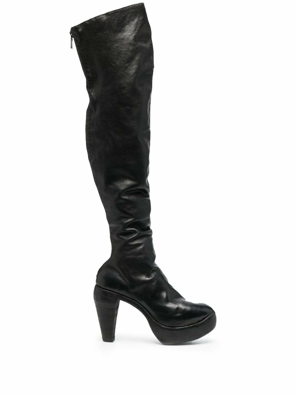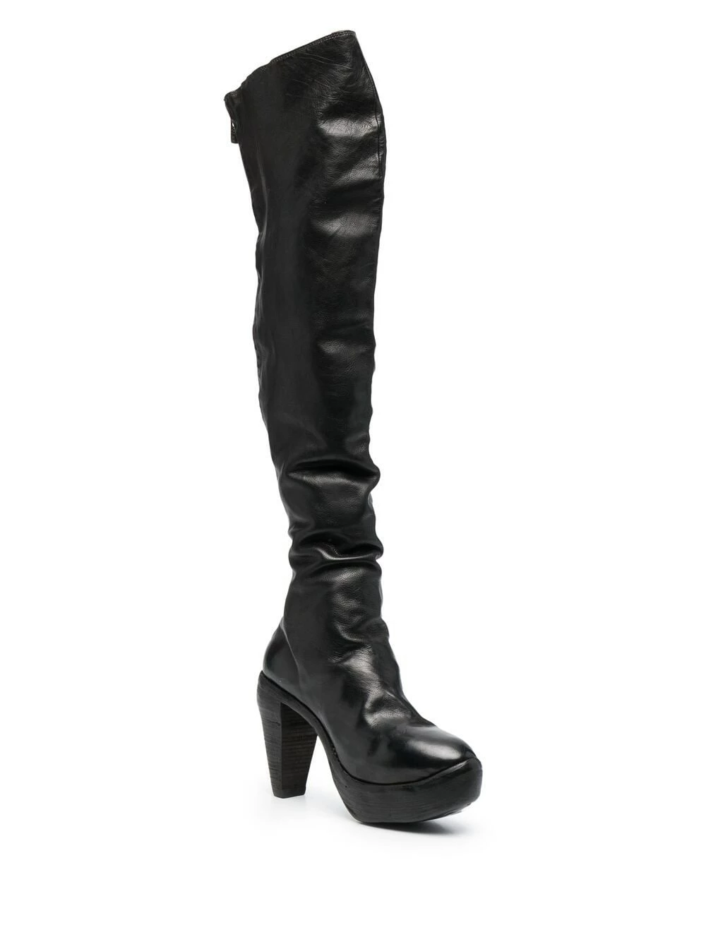 Fermeture zippée à l’arrière, talon haut fuselé, semelle à plateforme. Couleur : noir. Matière : cuir.