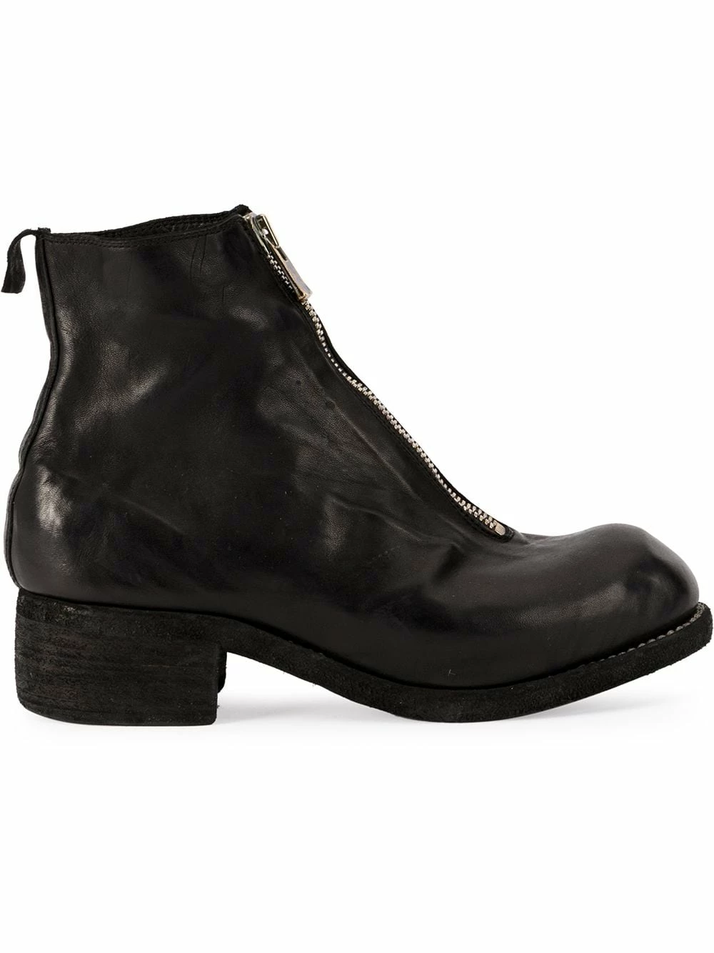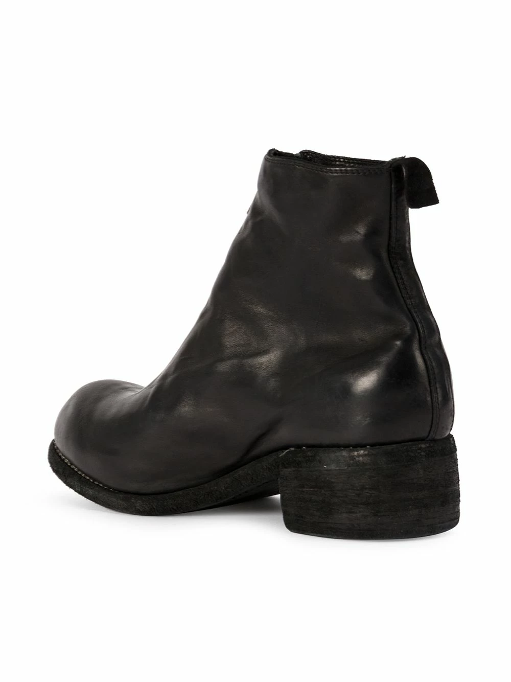 Front zip biker boots en cuir cordovan Guidi avec bout rond, fermeture zippée devant et languette arrière. Couleur : noir.