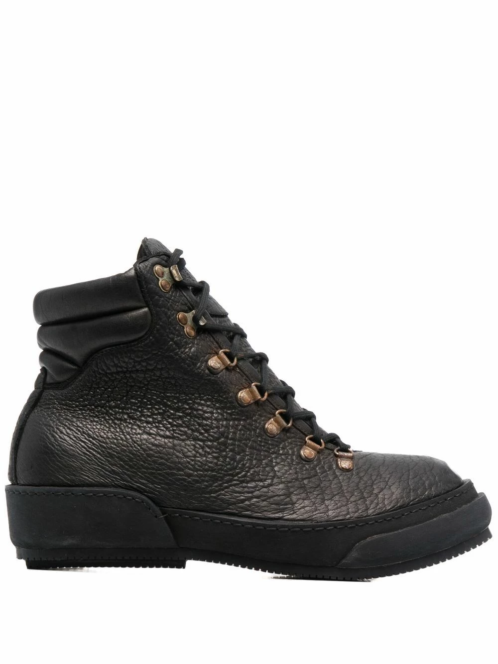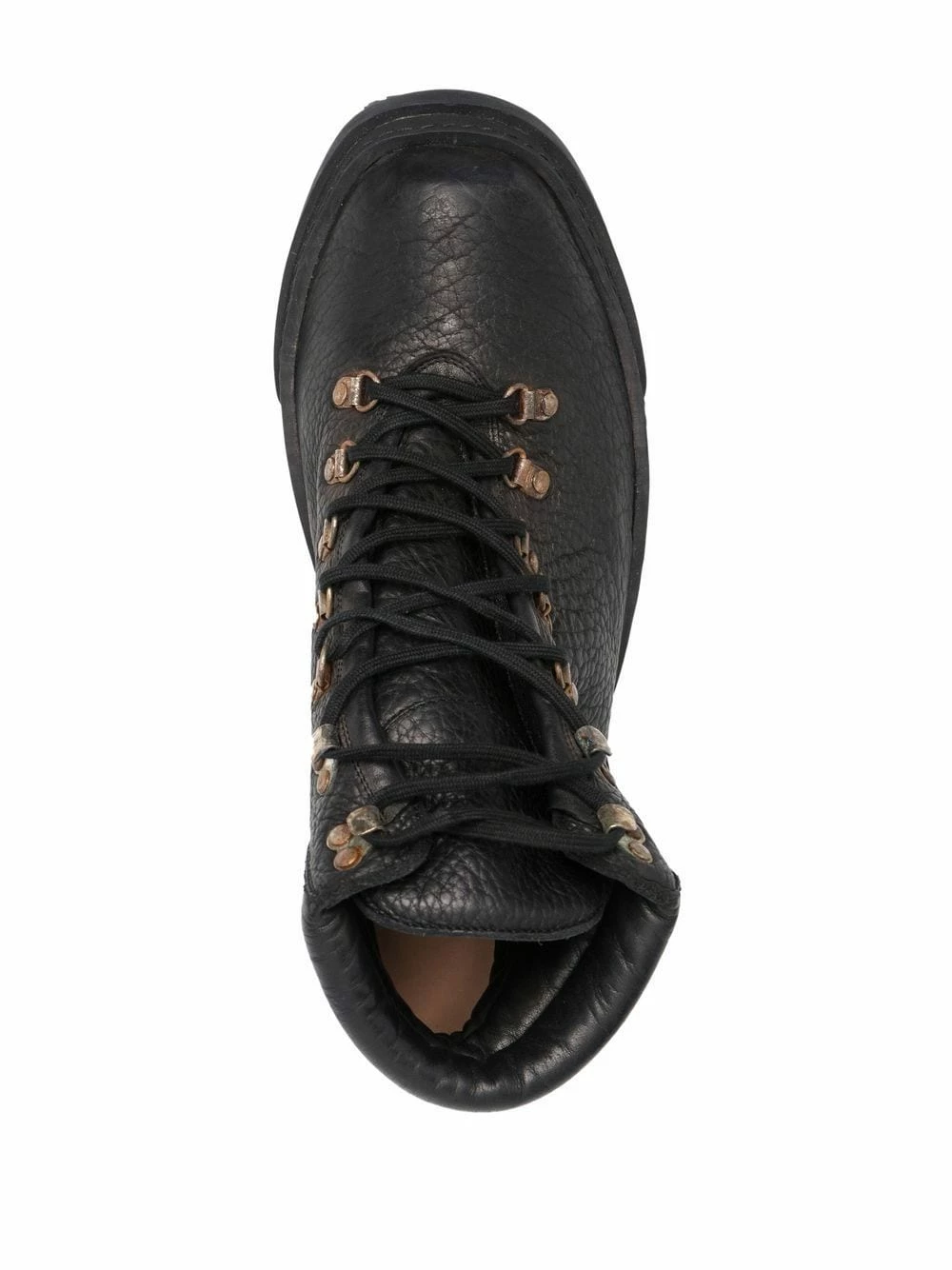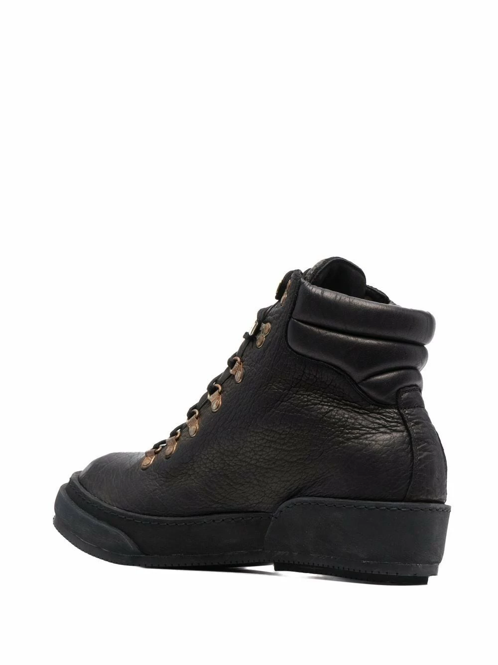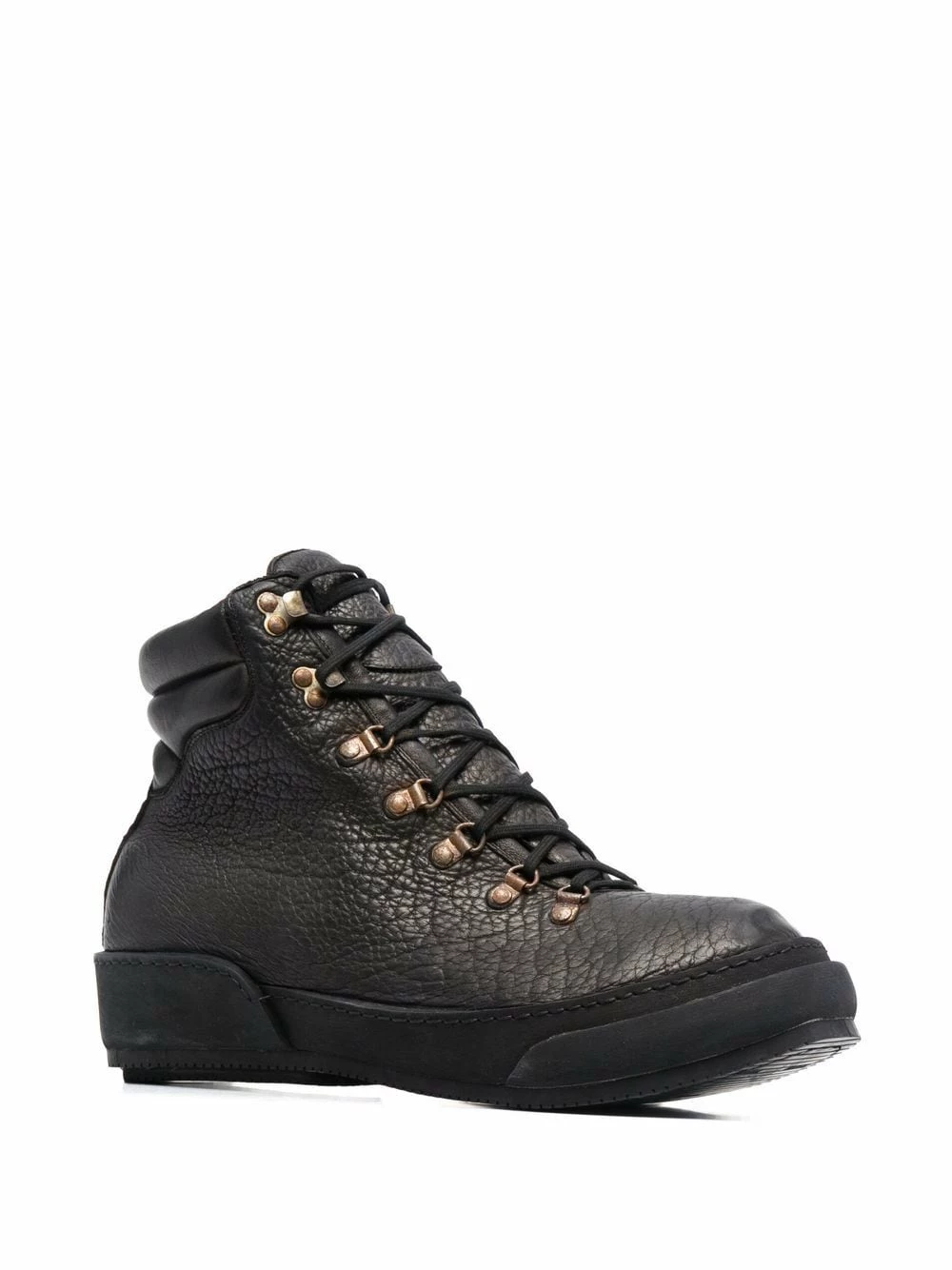 Bout rond, fermeture à lacer sur le devant, languette à logo embossé, chevilles rembourrées, semelle plate en caoutchouc. Couleur : noir. Matière : cuir.