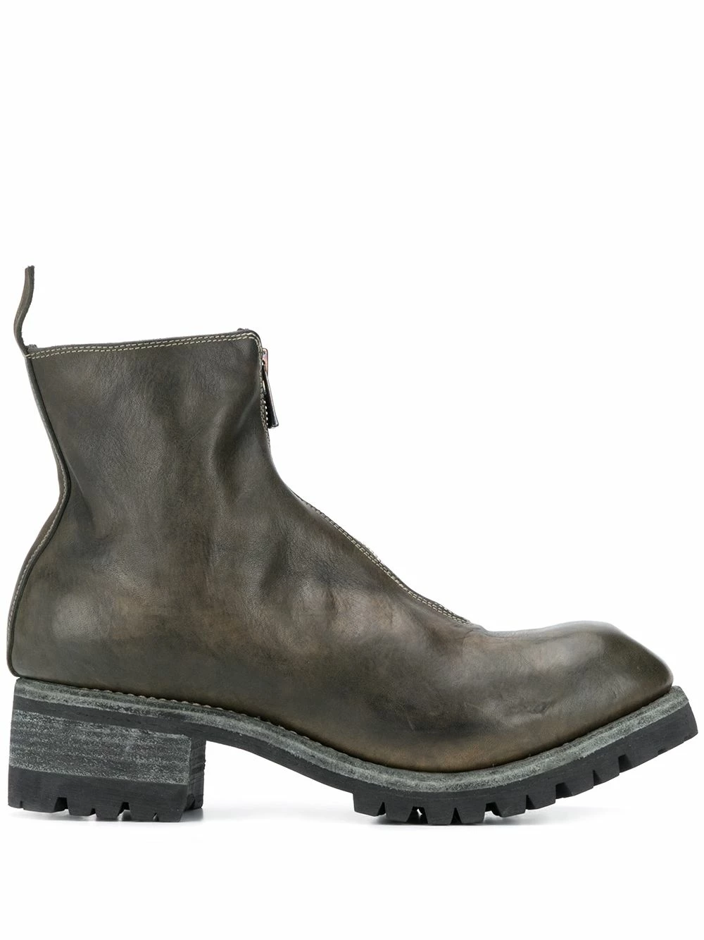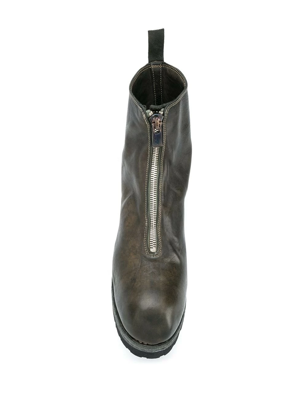 Finitions à effet usé, languette d’enfilage au talon, longueur cheville, bout rond, fermeture zippée devant, semelle épaisse. Matière : cuir.