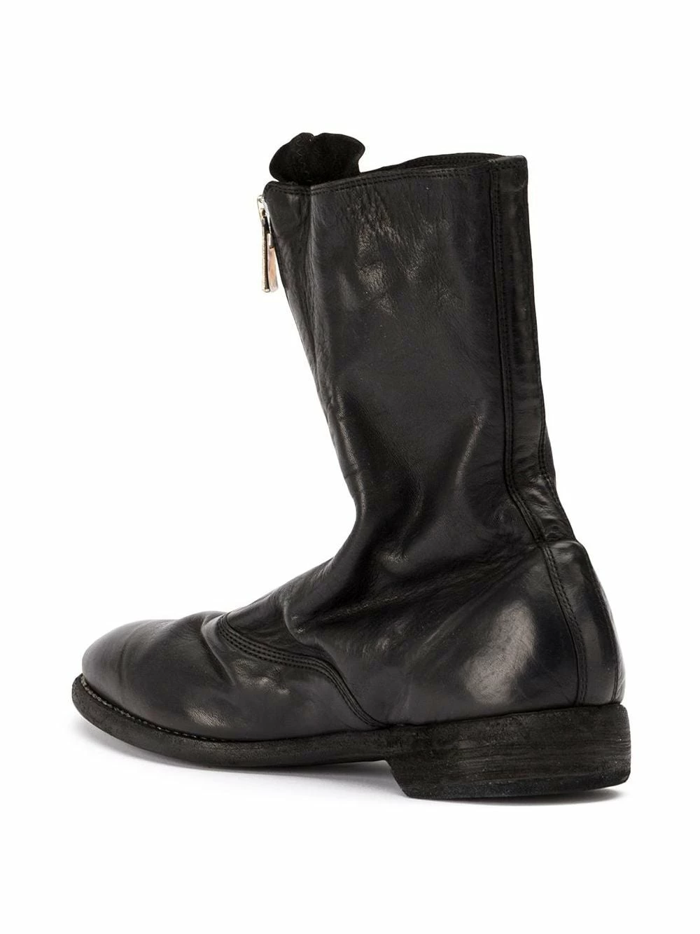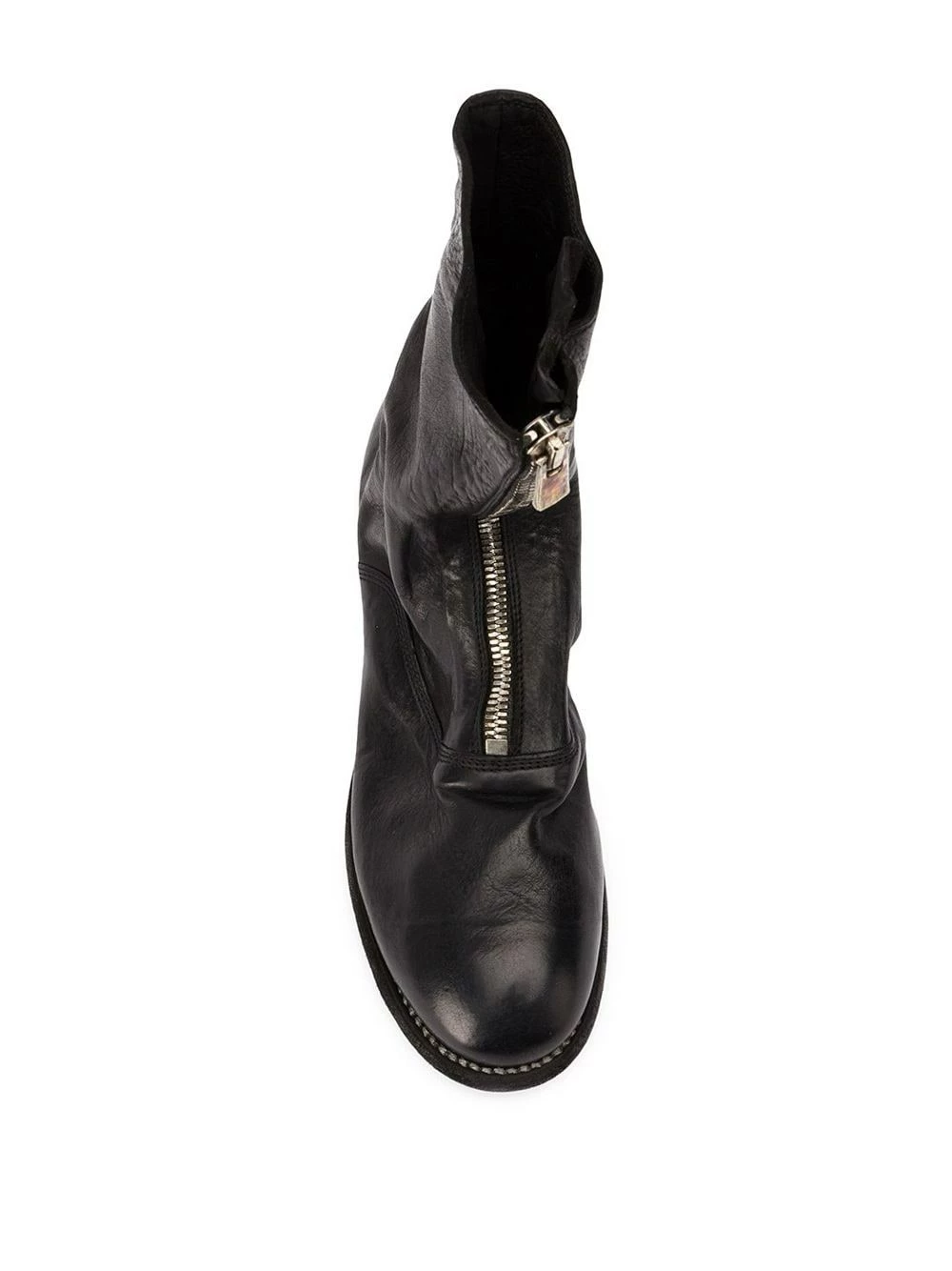 Bottines zippées en cuirs Guidi avec bout rond, hauteur cheville, fermeture zippée devant et semelle plate. Couleur : noir.