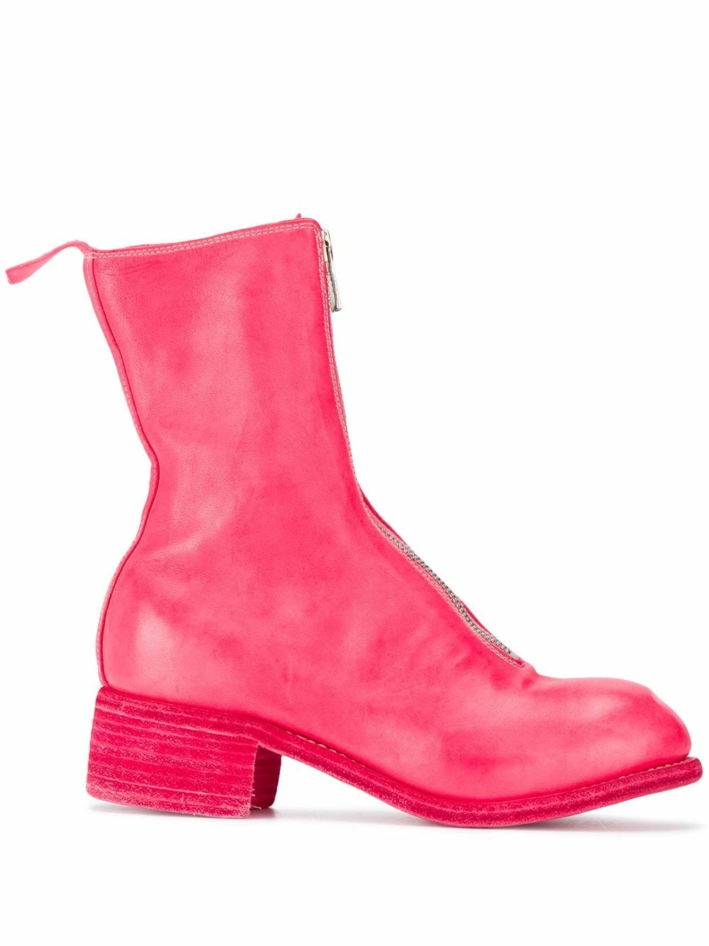Bout rond, fermeture zippée devant, petit talon épais, semelle en cuir. Matière : cuir.