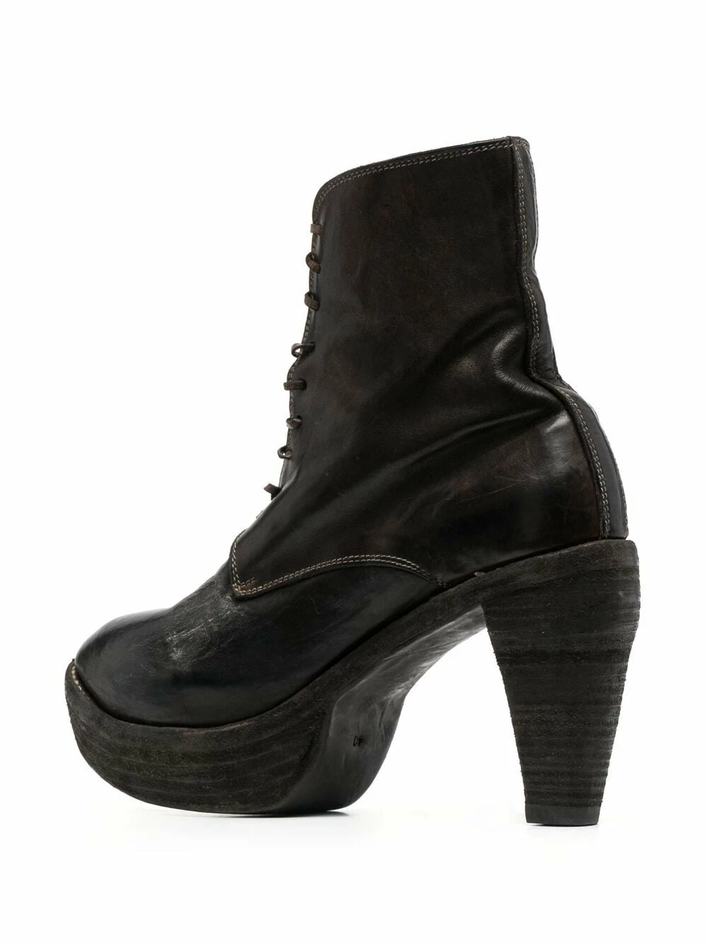 Hauteur cheville, fermeture à lacer sur le devant, talon haut fuselé, semelle à plateforme. Matière : cuir.