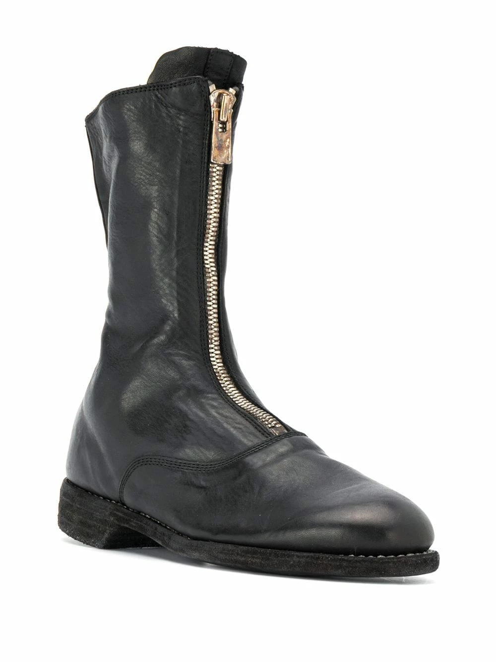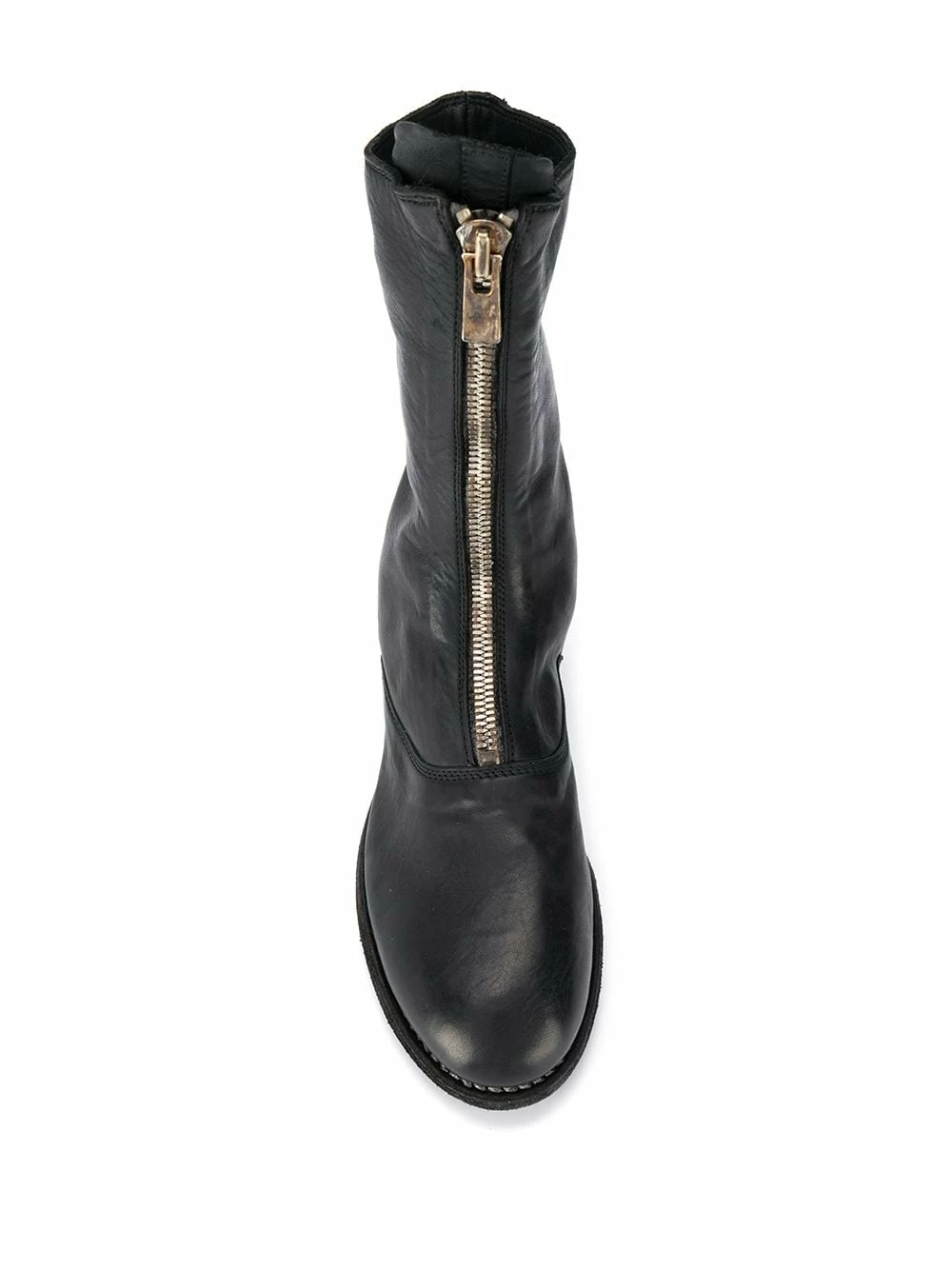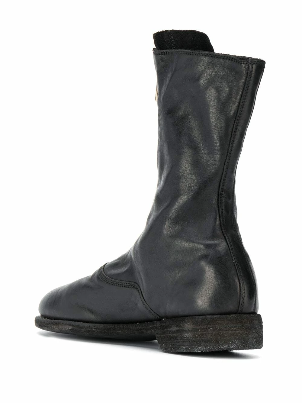 Bout rond, fermeture zippée devant, semelle plate en caoutchouc. Couleur : noir. Matière : cuir.