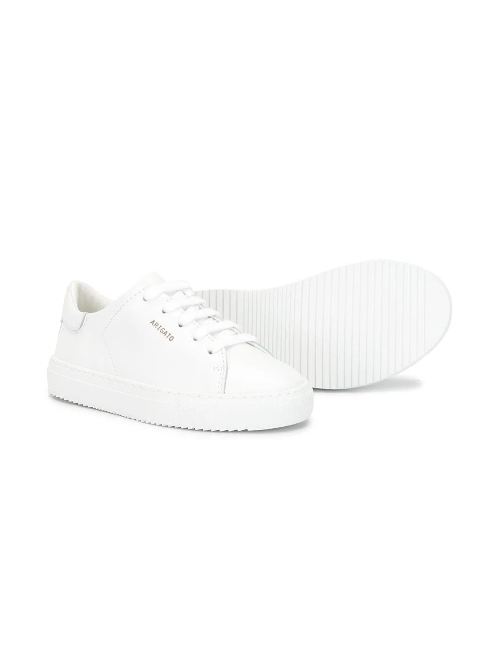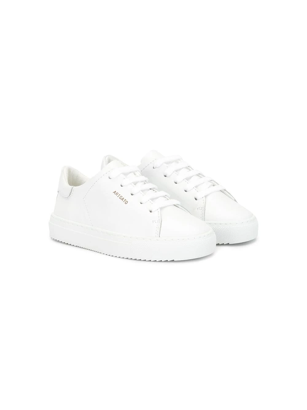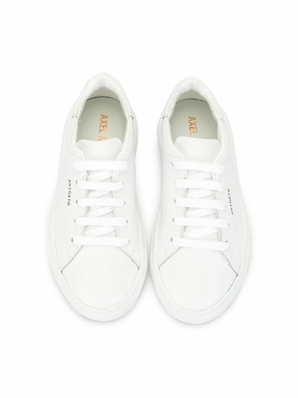 Baskets Clean 90 Axel Arigato avec bout rond, fermeture à lacer sur le devant, semelle intérieure à logo, logo à l’extérieur et semelle plate en caoutchouc. Couleur : blanc.