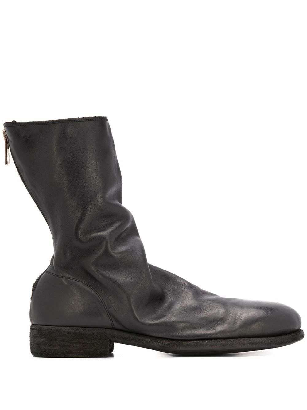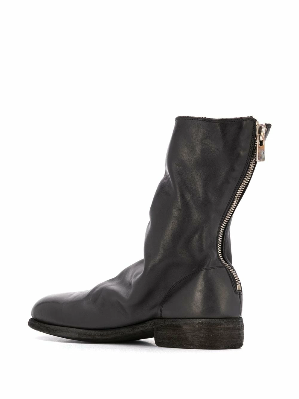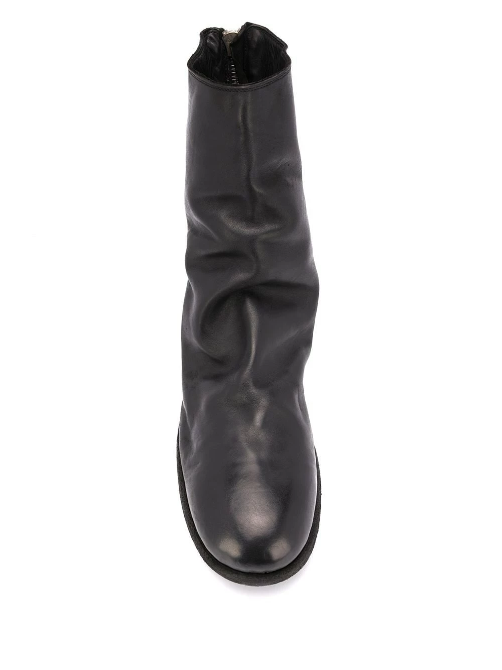 Bout rond, fermeture zippée à l’arrière, semelle plate en cuir, longueur mollet. Couleur : noir. Matière : cuir.