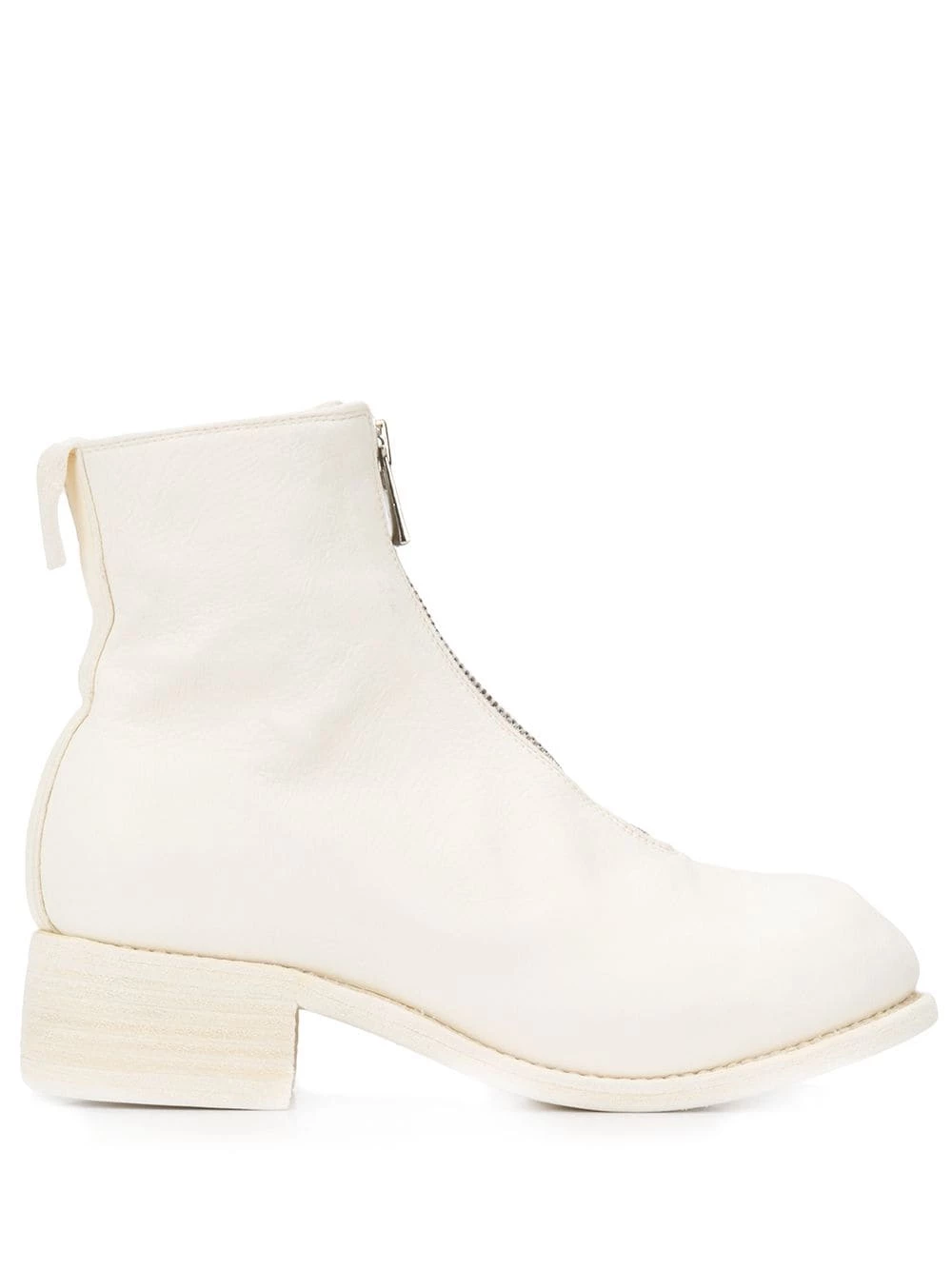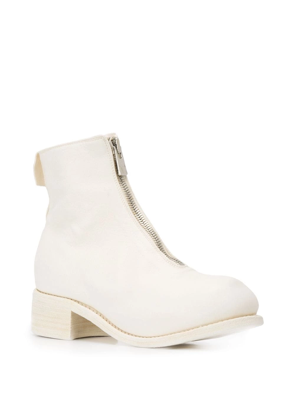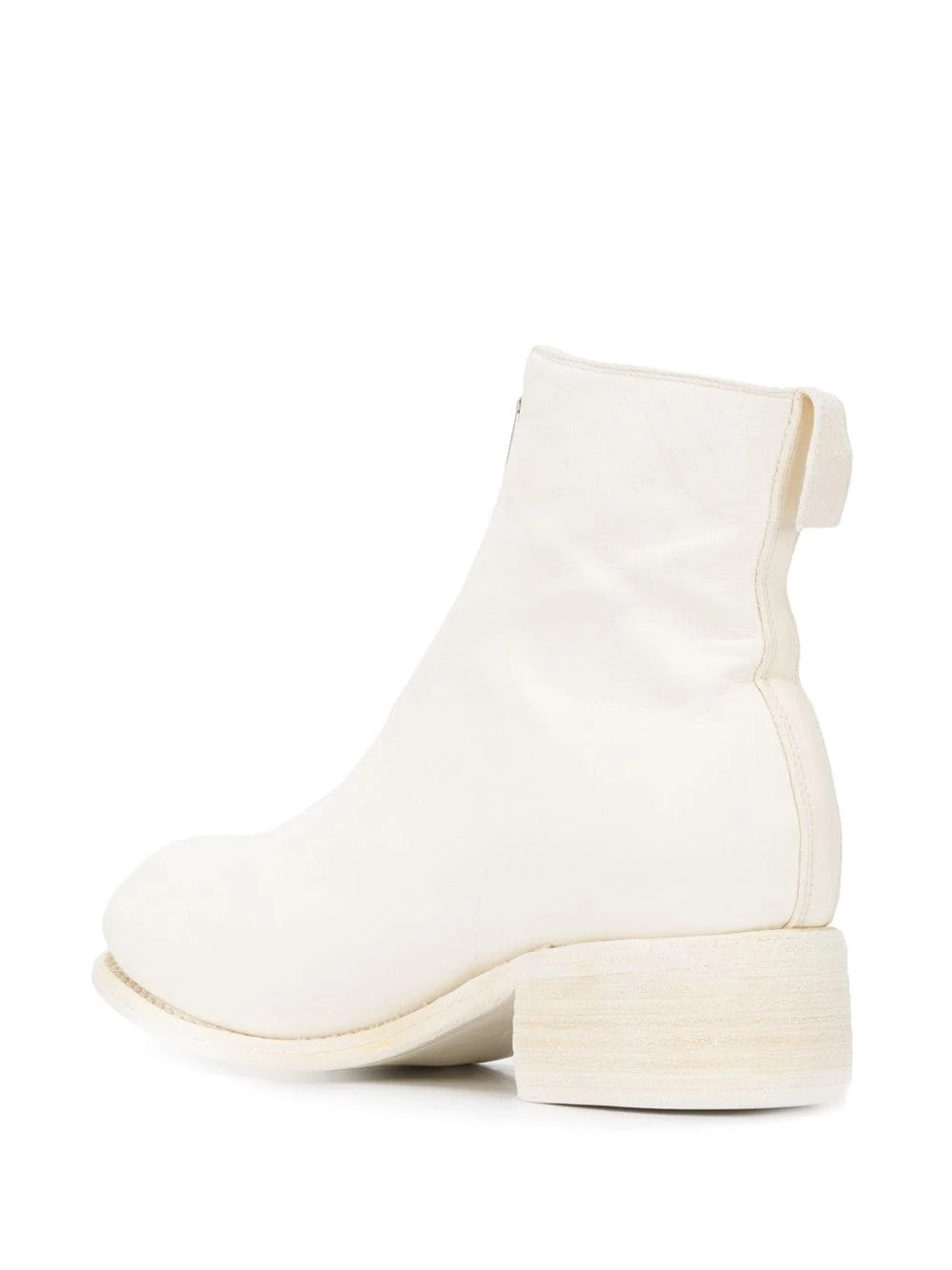 Bottines à effet craquelé en cuir Guidi avec bout rond, fermeture zippée devant, languette arrière et petit talon épais. Couleur : blanc.