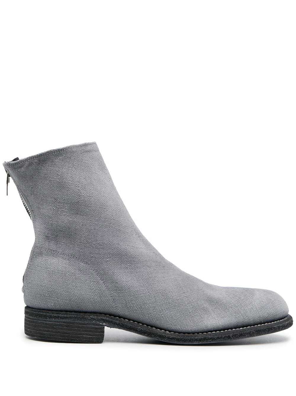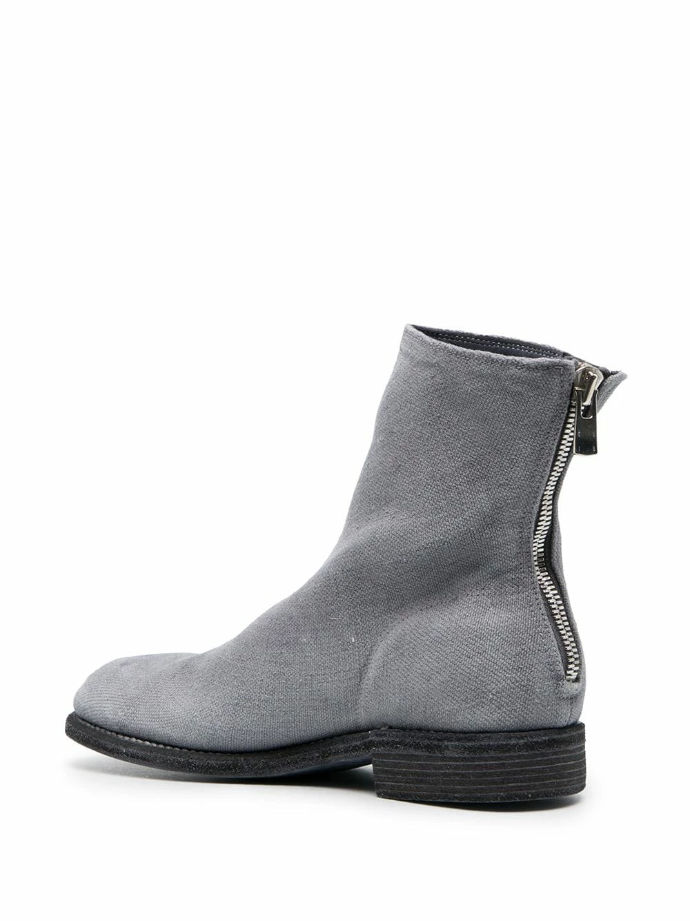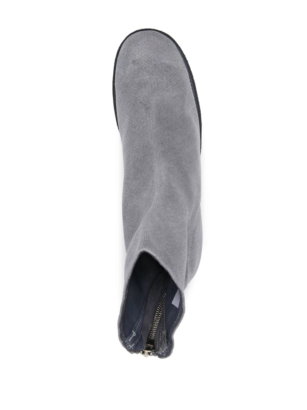 Bout rond, fermeture zippĂ©e Ă lâarriĂšre, semelle plate en cuir, longueur cheville.