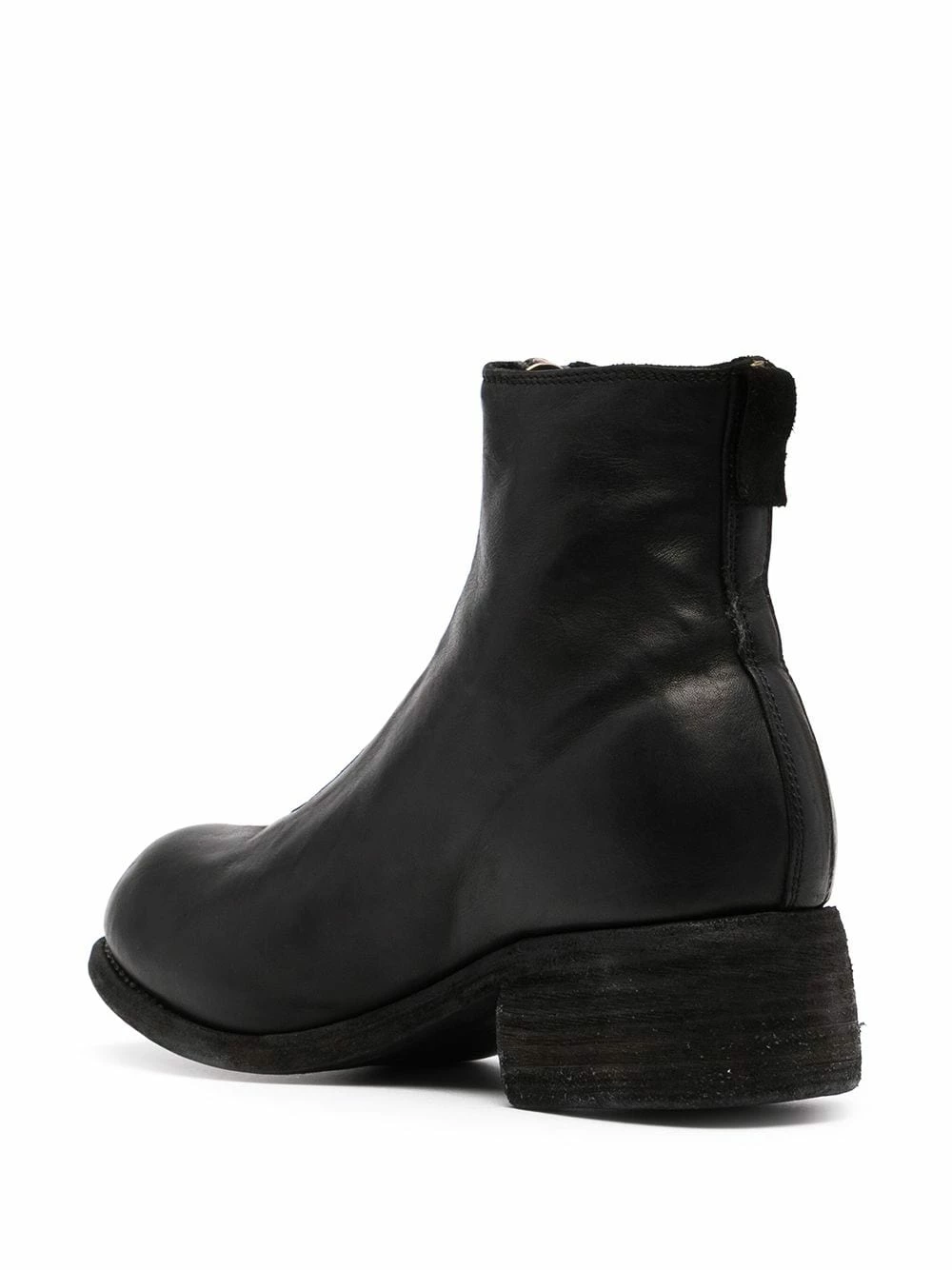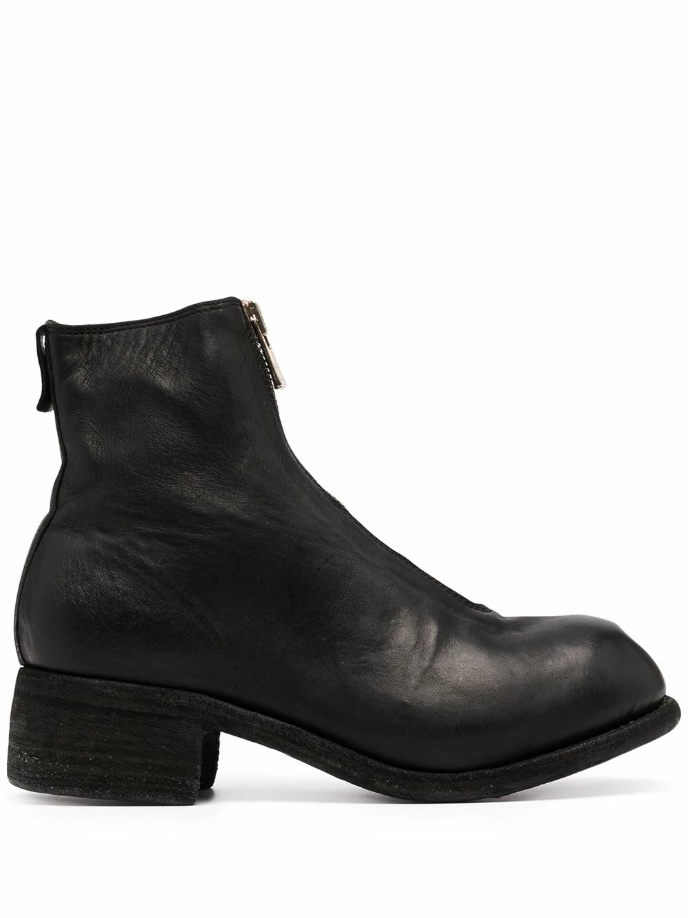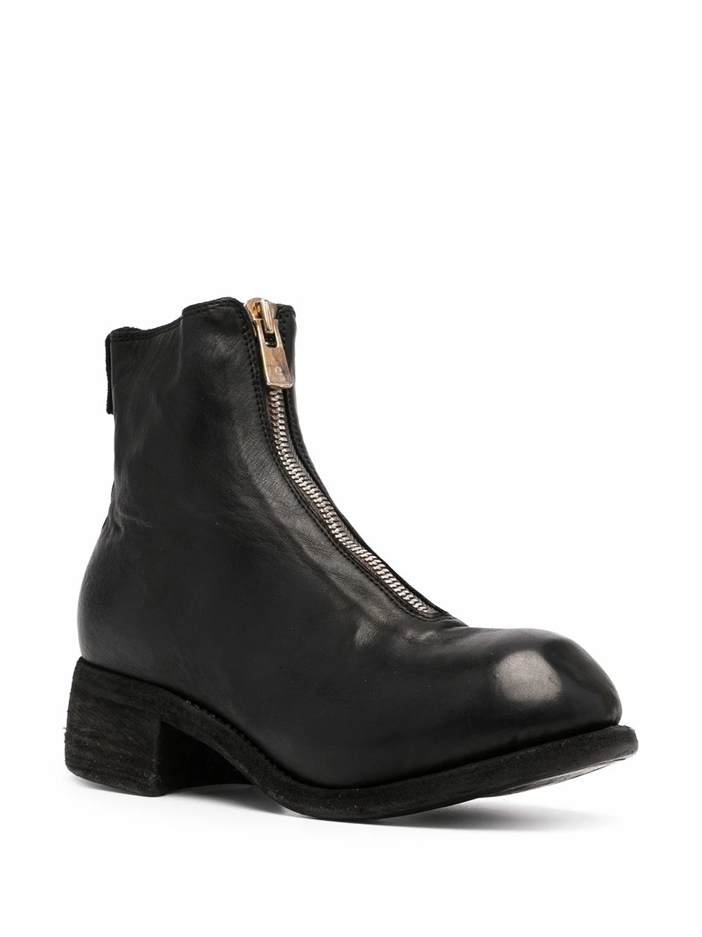 Bout rond, fermeture zippée devant, hauteur cheville, contrefort à logo, petit talon épais. Couleur : noir. Matière : cuir.