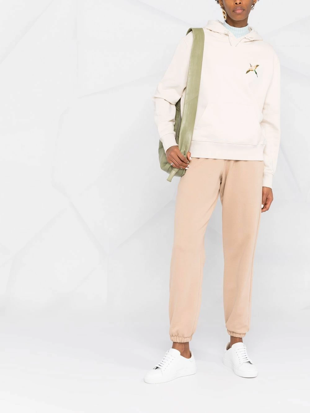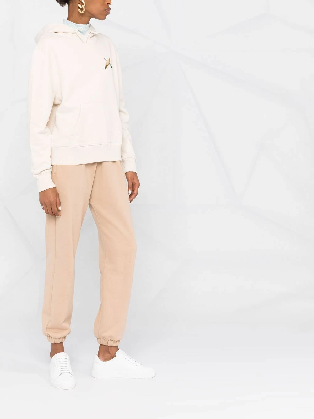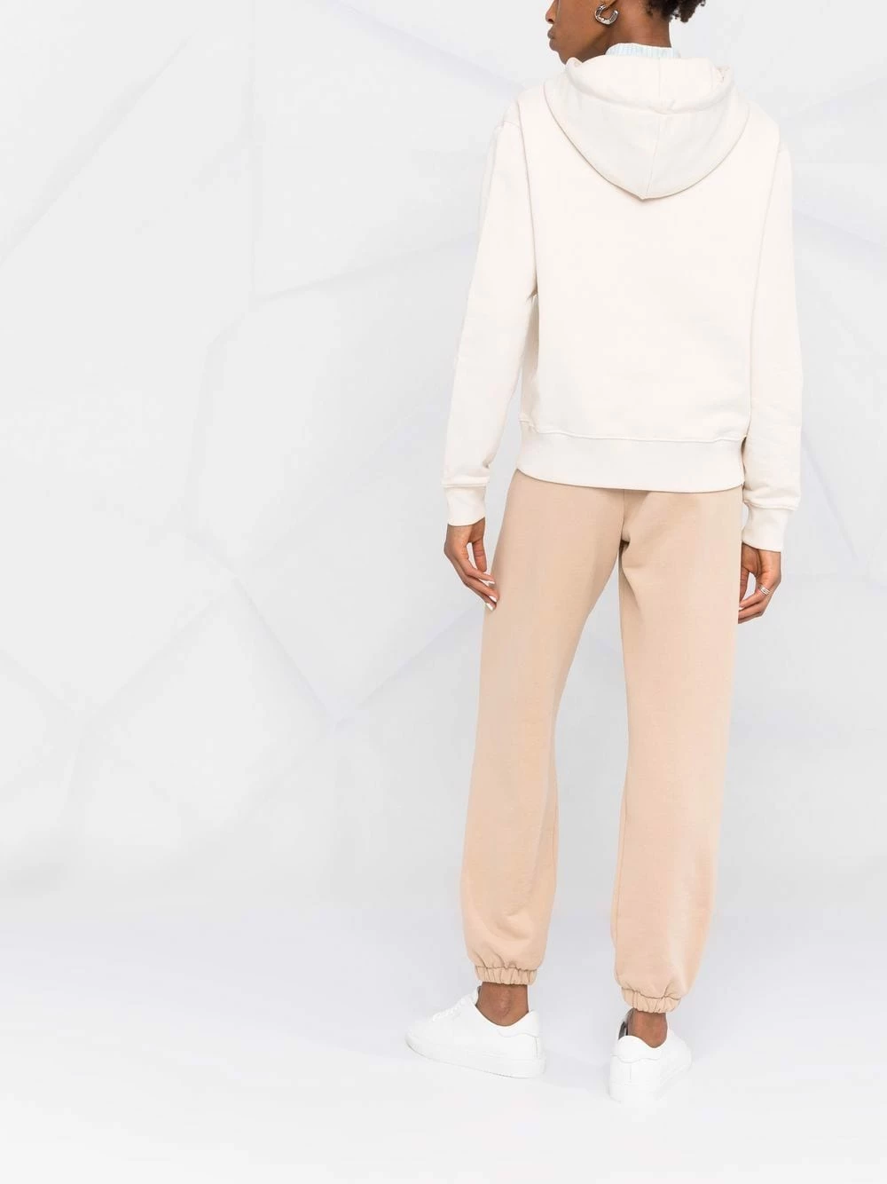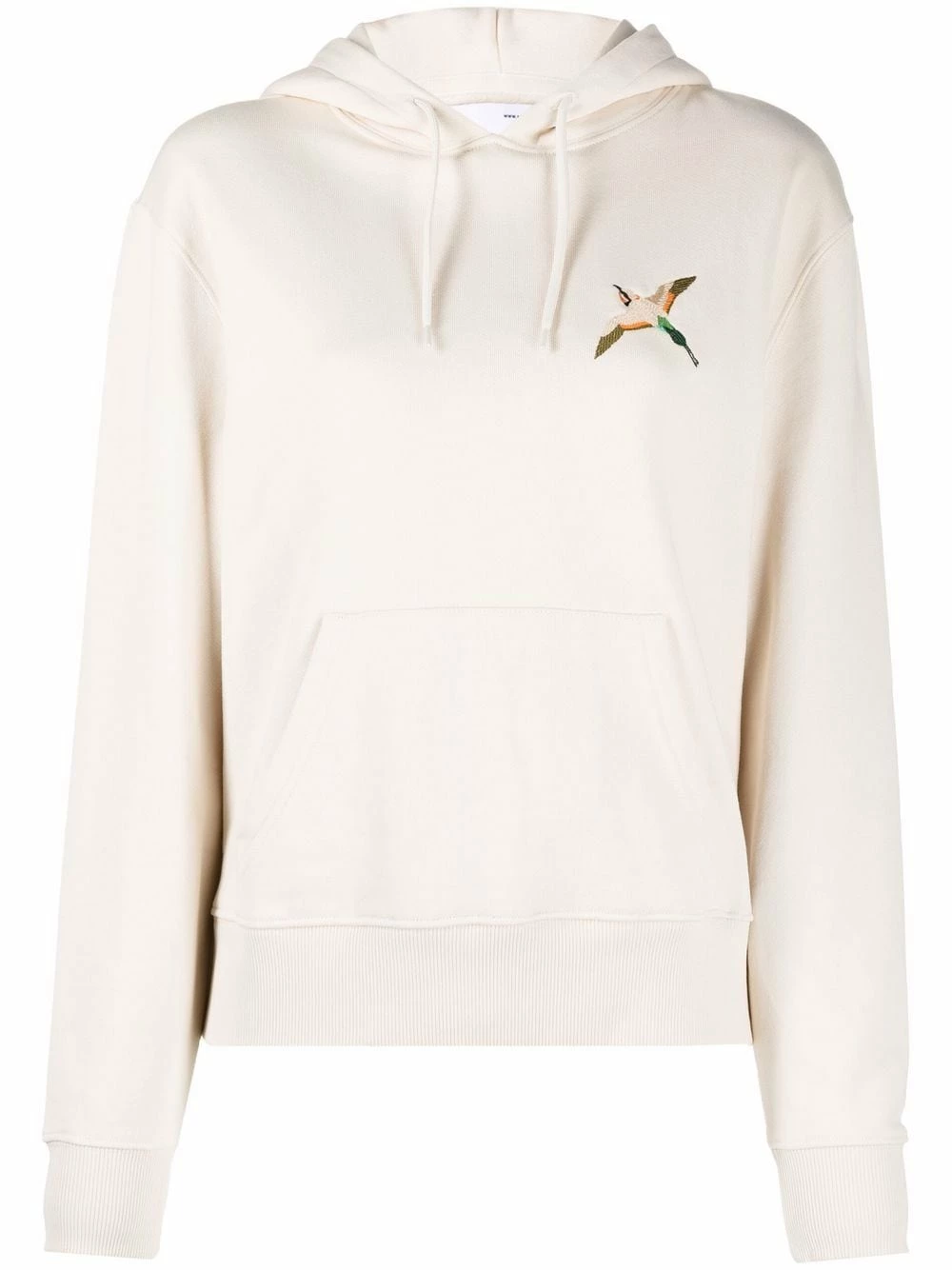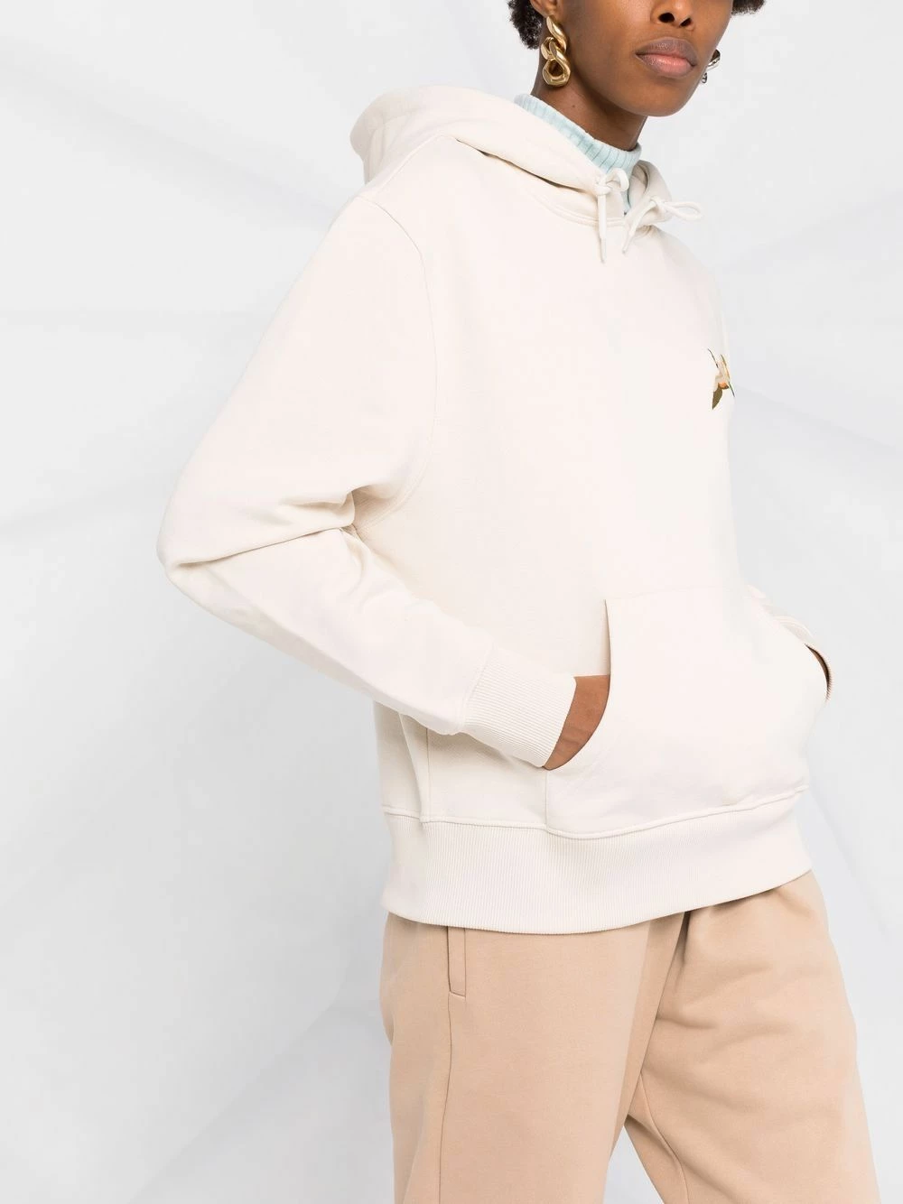 Beige, coton biologique, logo brodé sur la poitrine, capuche à lien de resserrage, manches longues, poche plaquée sur le devant.